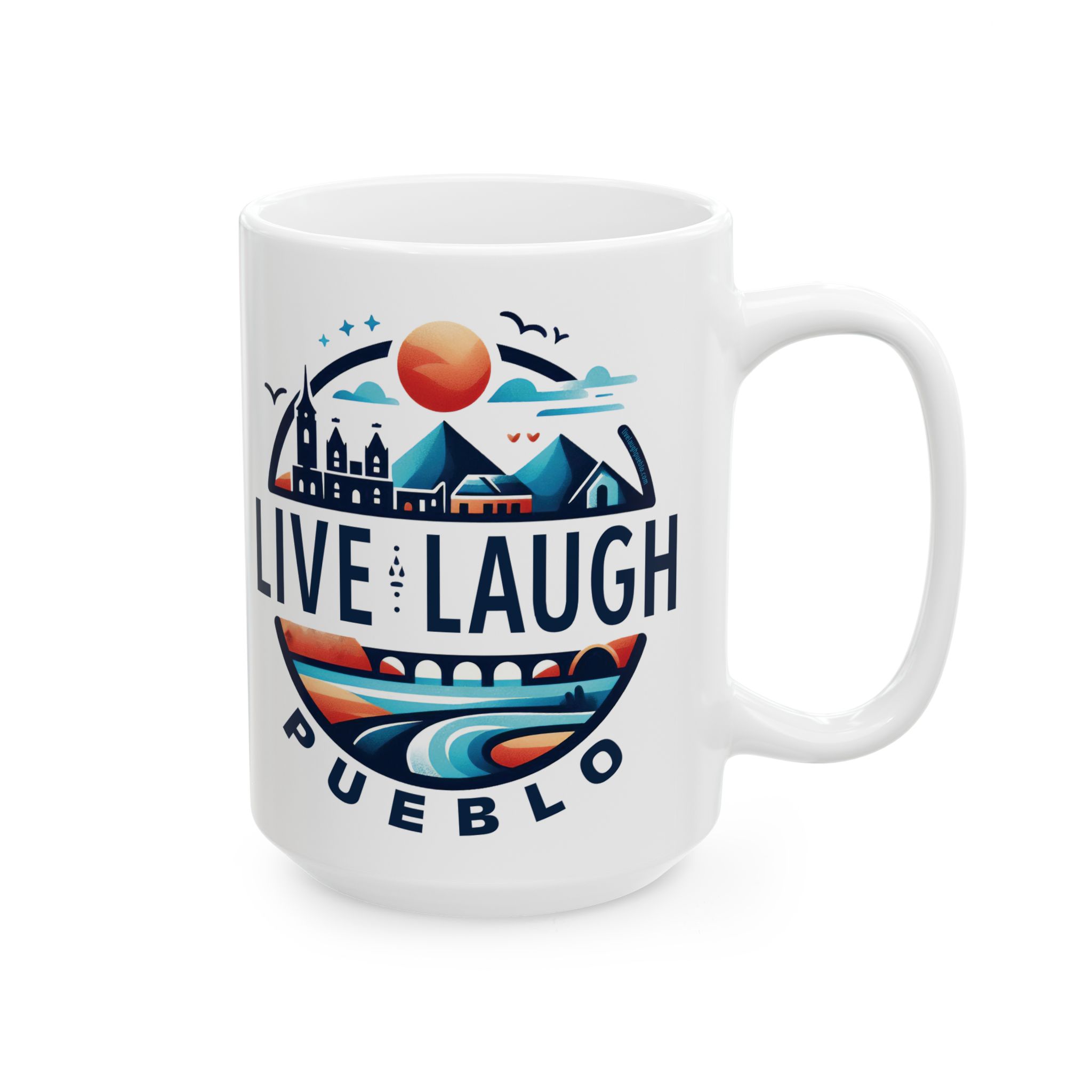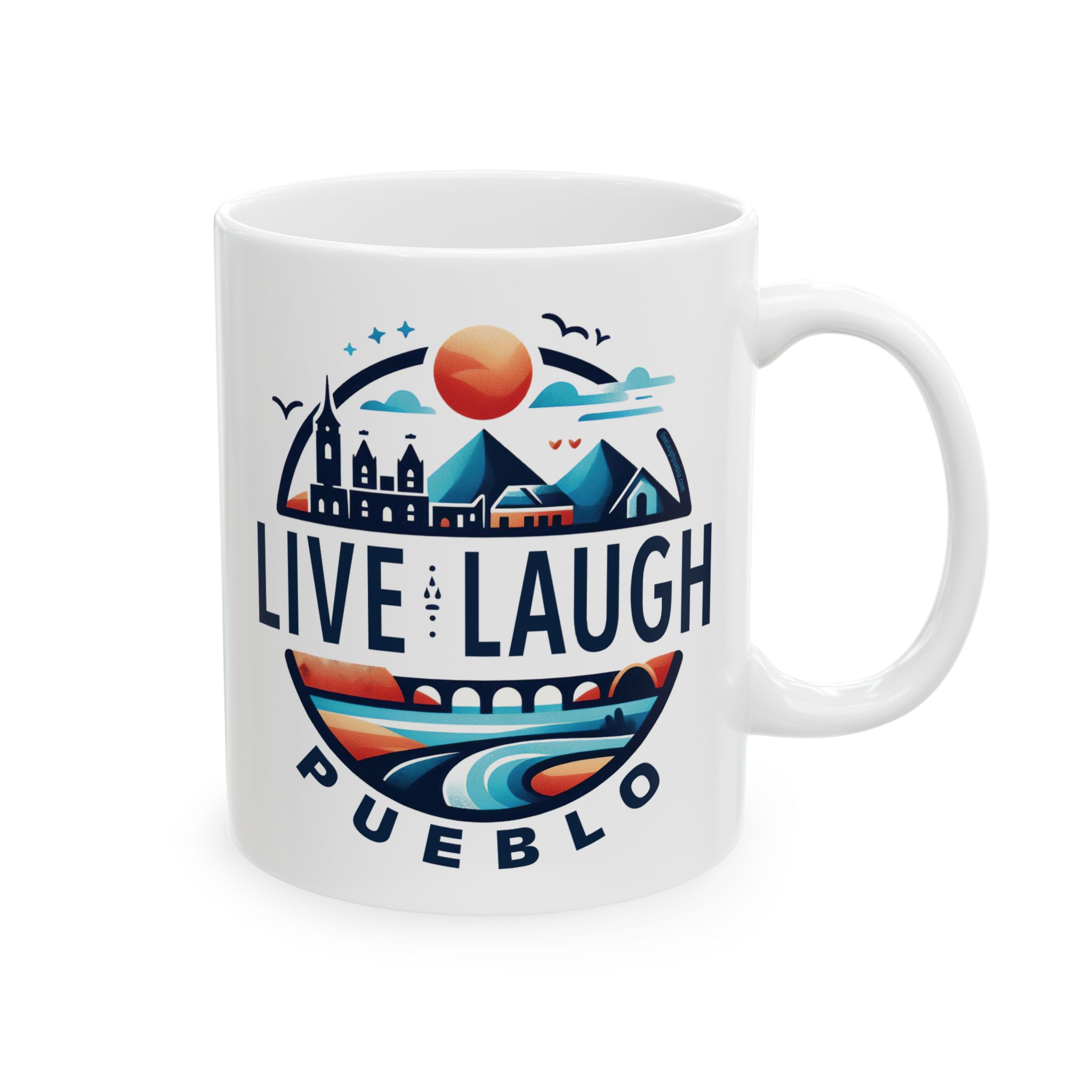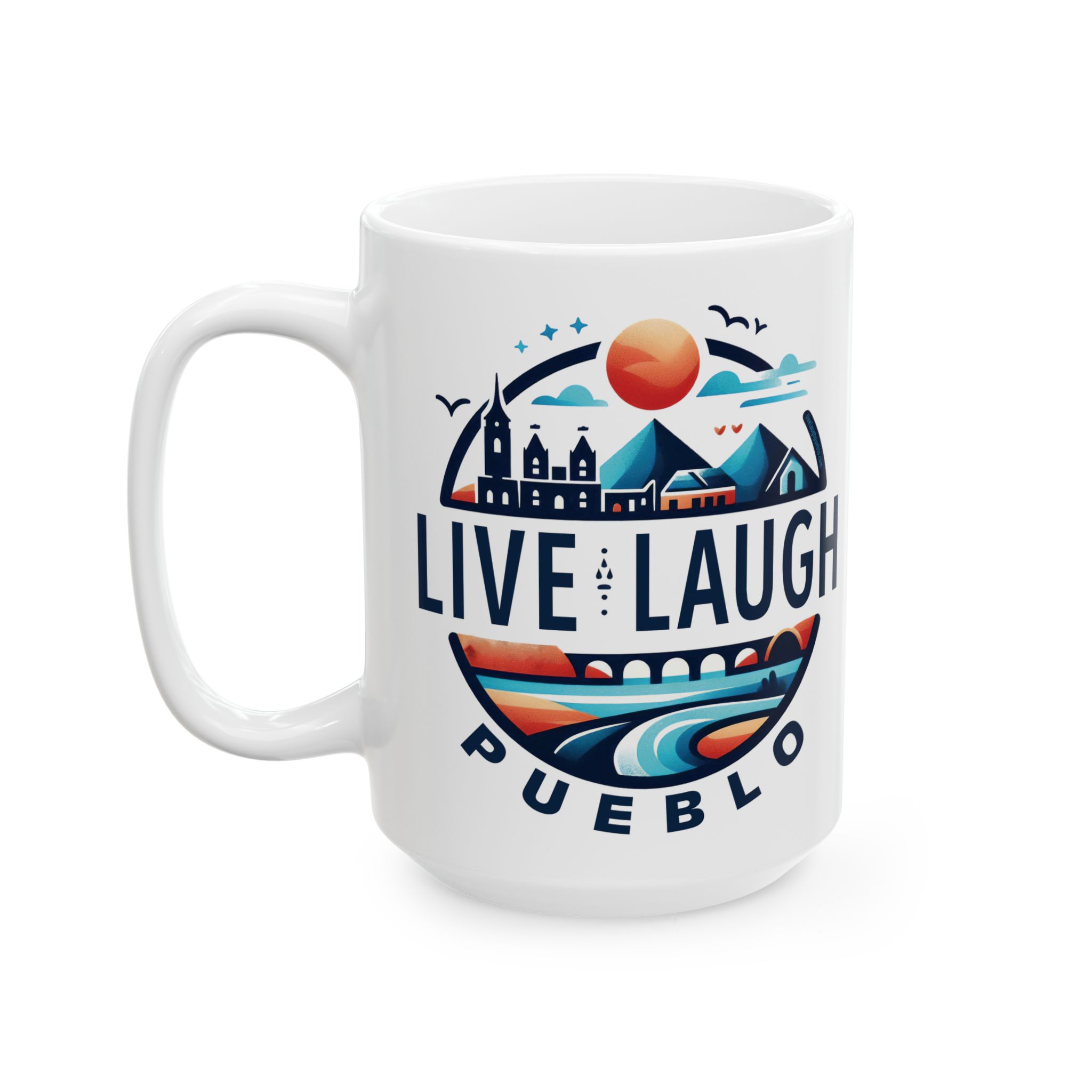 Sip your favorite beverage and embrace the spirit of Pueblo with our charming ‘Live Laugh Pueblo’ ceramic mug. Available in 11oz and 15oz sizes, this eye-catching mug features a vibrant, modern design that captures the essence of this beautiful Colorado city.