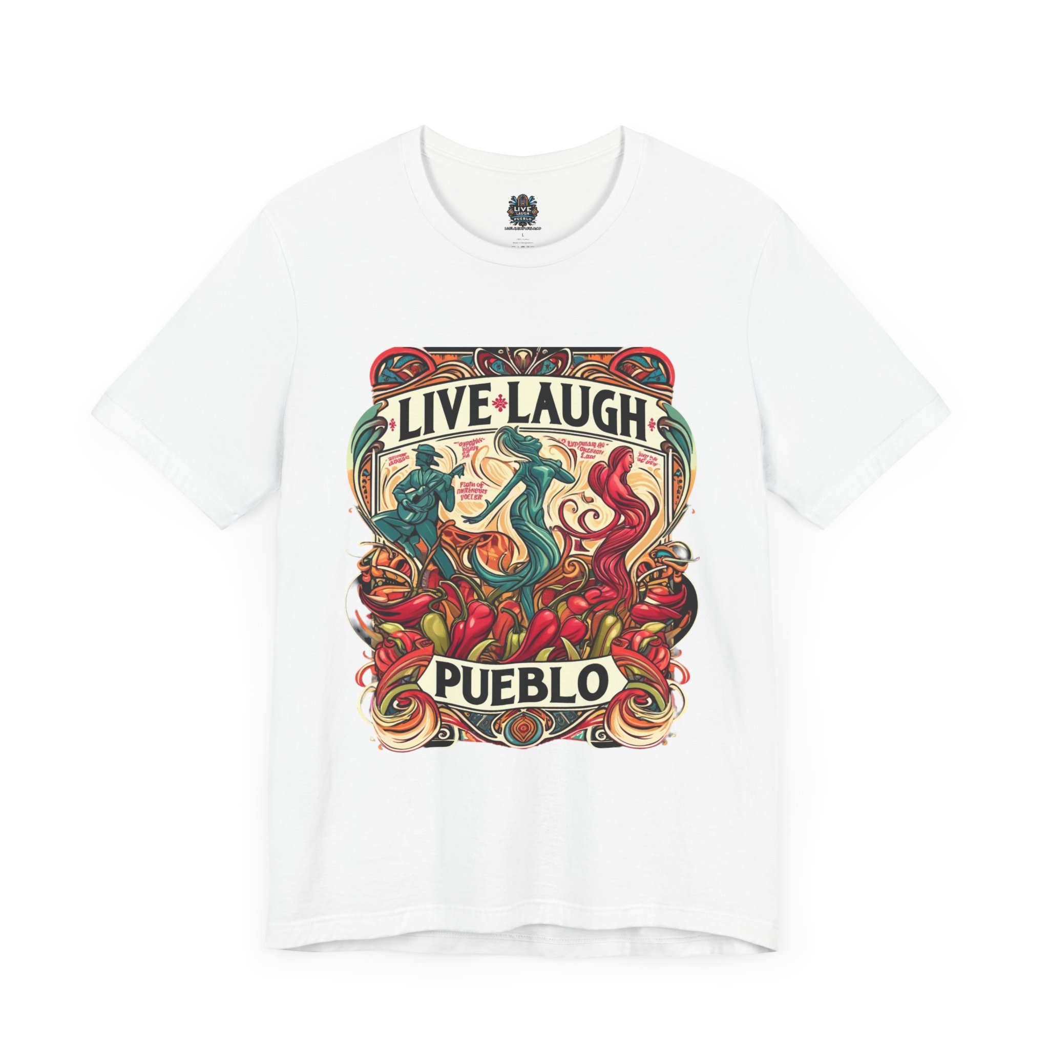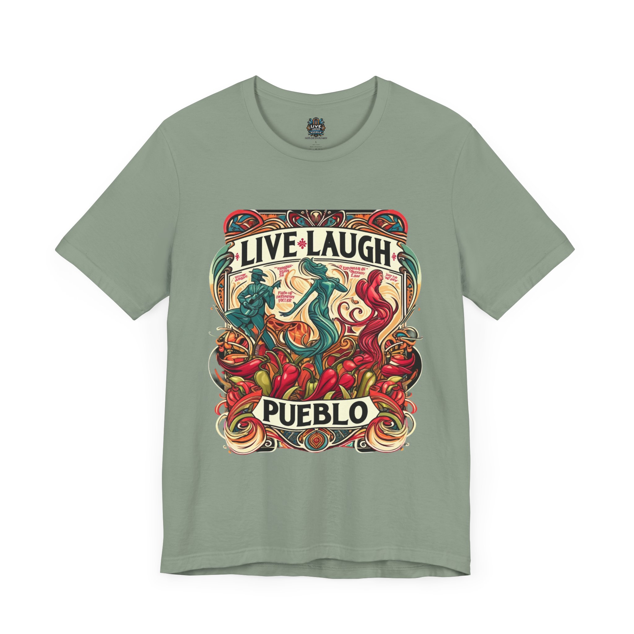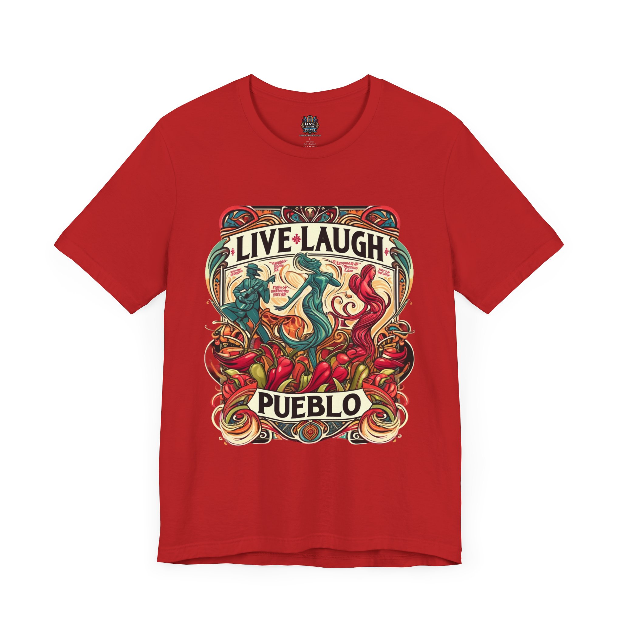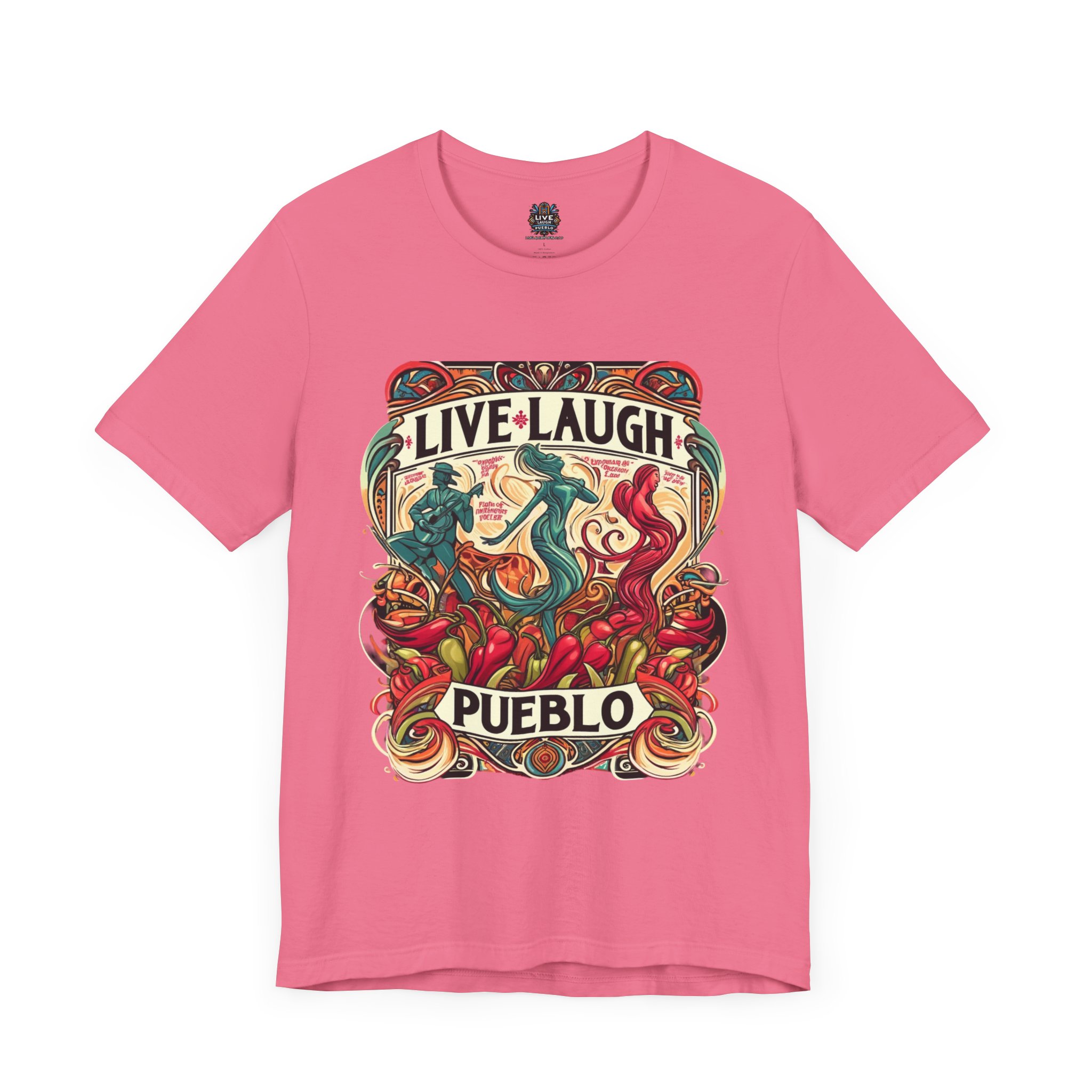 Immerse yourself in the vibrant culture of Southern Colorado and Northern New Mexico, with our “Live, Laugh, Pueblo! Art Nouveau Chile Spirit Dance Unisex Jersey Short Sleeve Tee.” This stunning tee features a captivating Art Nouveau design that celebrates Pueblo’s rich heritage and festive spirit. The intricate artwork showcases dynamic figures dancing amidst colorful chile peppers, symbolizing the lively traditions and flavors of Southern Colorado and Northern New Mexico. Made from high-quality, soft jersey fabric, this unisex short sleeve tee offers exceptional comfort and durability for everyday wear. Whether you’re attending a cultural festival, exploring the city, or relaxing at home, this tee is a stylish way to display your Pueblo spirit.