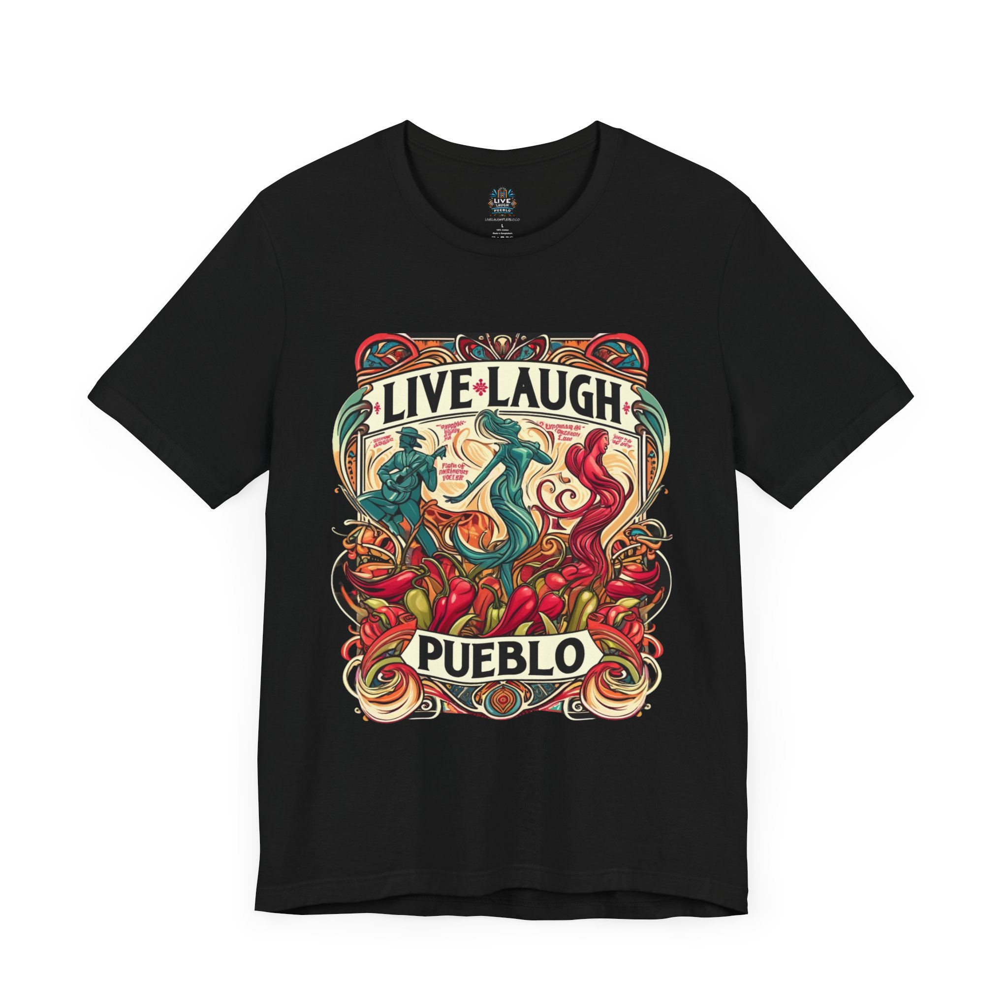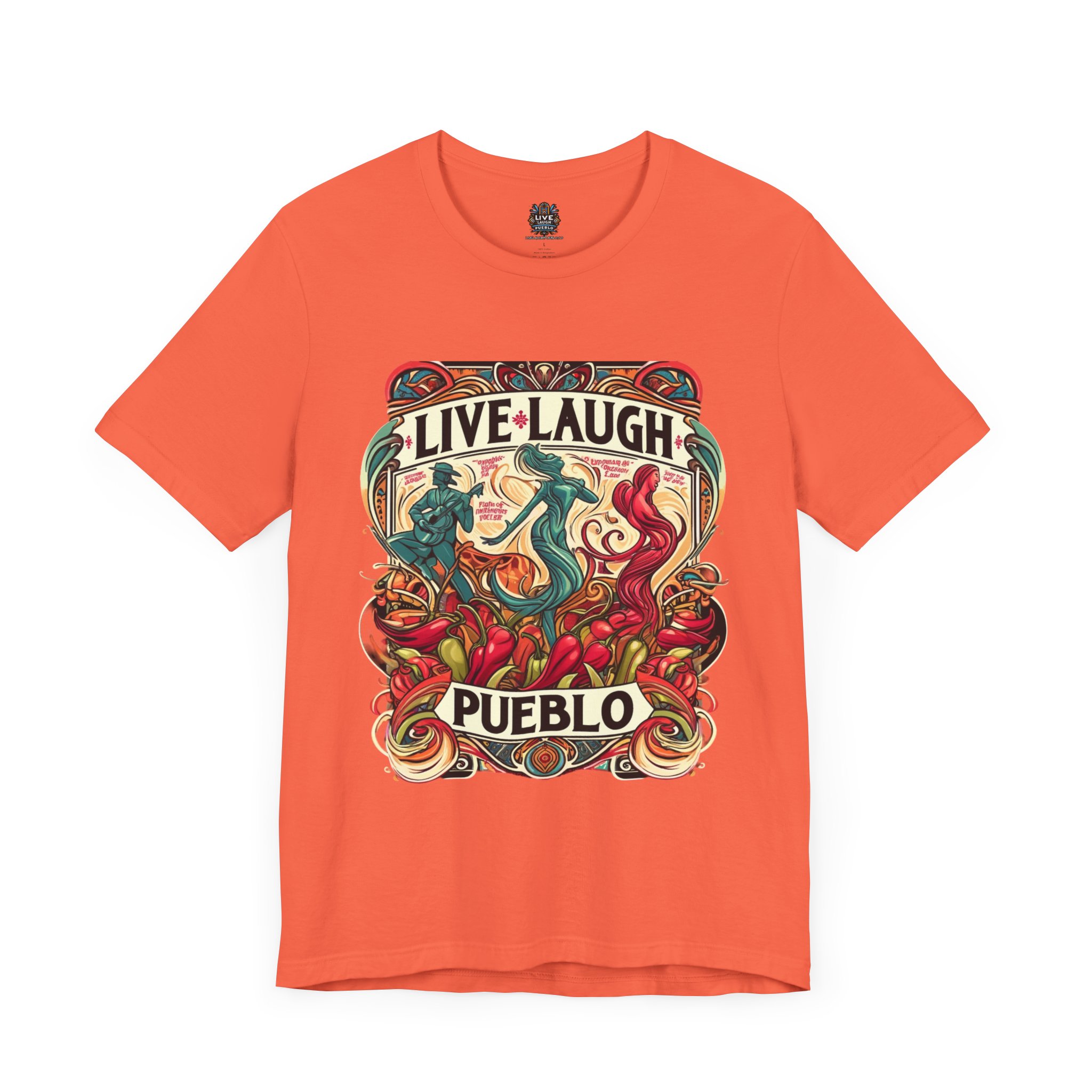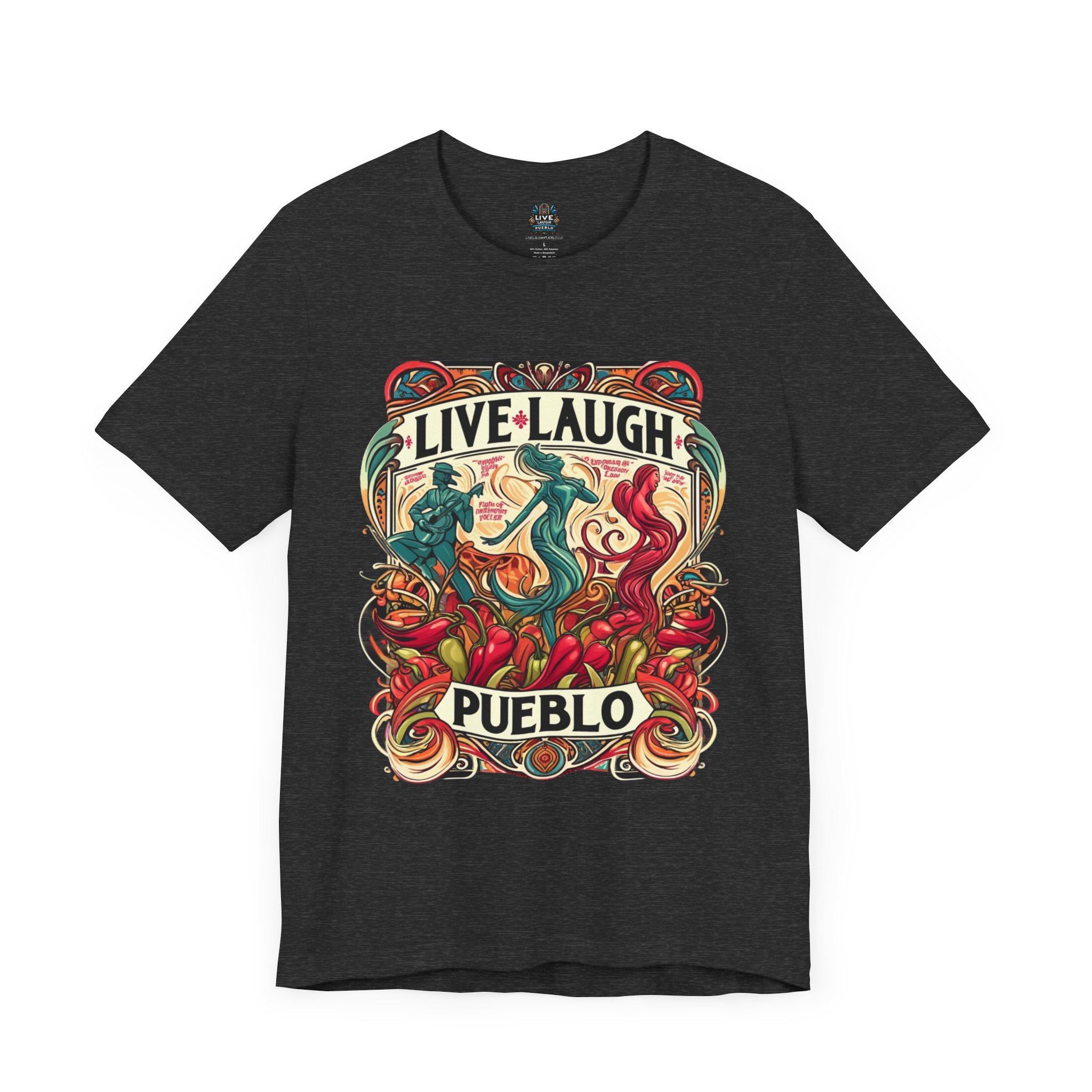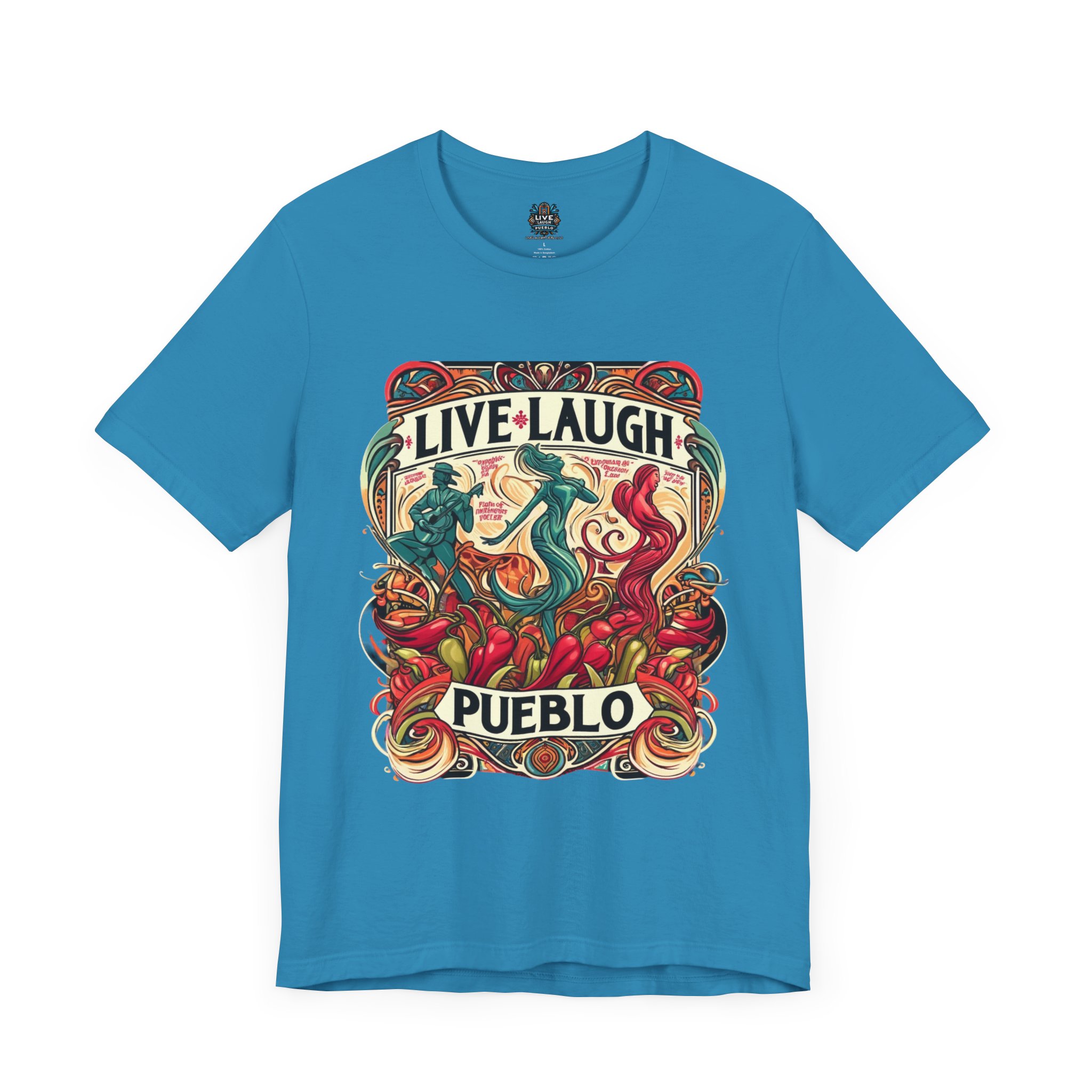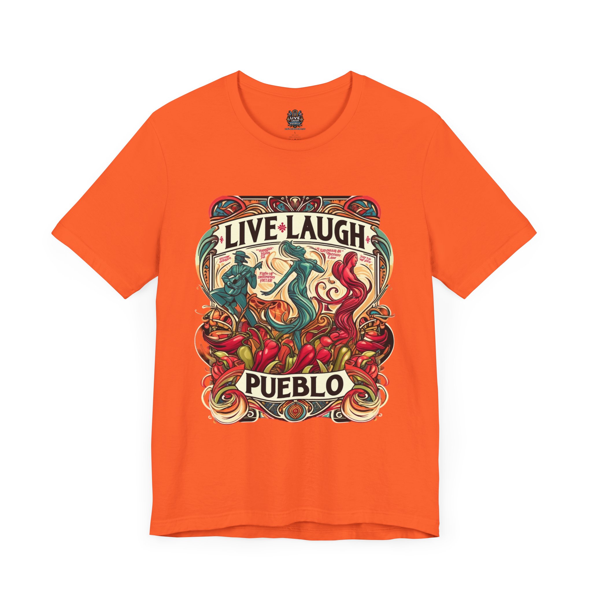 Immerse yourself in the vibrant culture of Southern Colorado and Northern New Mexico, with our “Live, Laugh, Pueblo! Art Nouveau Chile Spirit Dance Unisex Jersey Short Sleeve Tee.” This stunning tee features a captivating Art Nouveau design that celebrates Pueblo’s rich heritage and festive spirit. The intricate artwork showcases dynamic figures dancing amidst colorful chile peppers, symbolizing the lively traditions and flavors of Southern Colorado and Northern New Mexico. Made from high-quality, soft jersey fabric, this unisex short sleeve tee offers exceptional comfort and durability for everyday wear. Whether you’re attending a cultural festival, exploring the city, or relaxing at home, this tee is a stylish way to display your Pueblo spirit.
