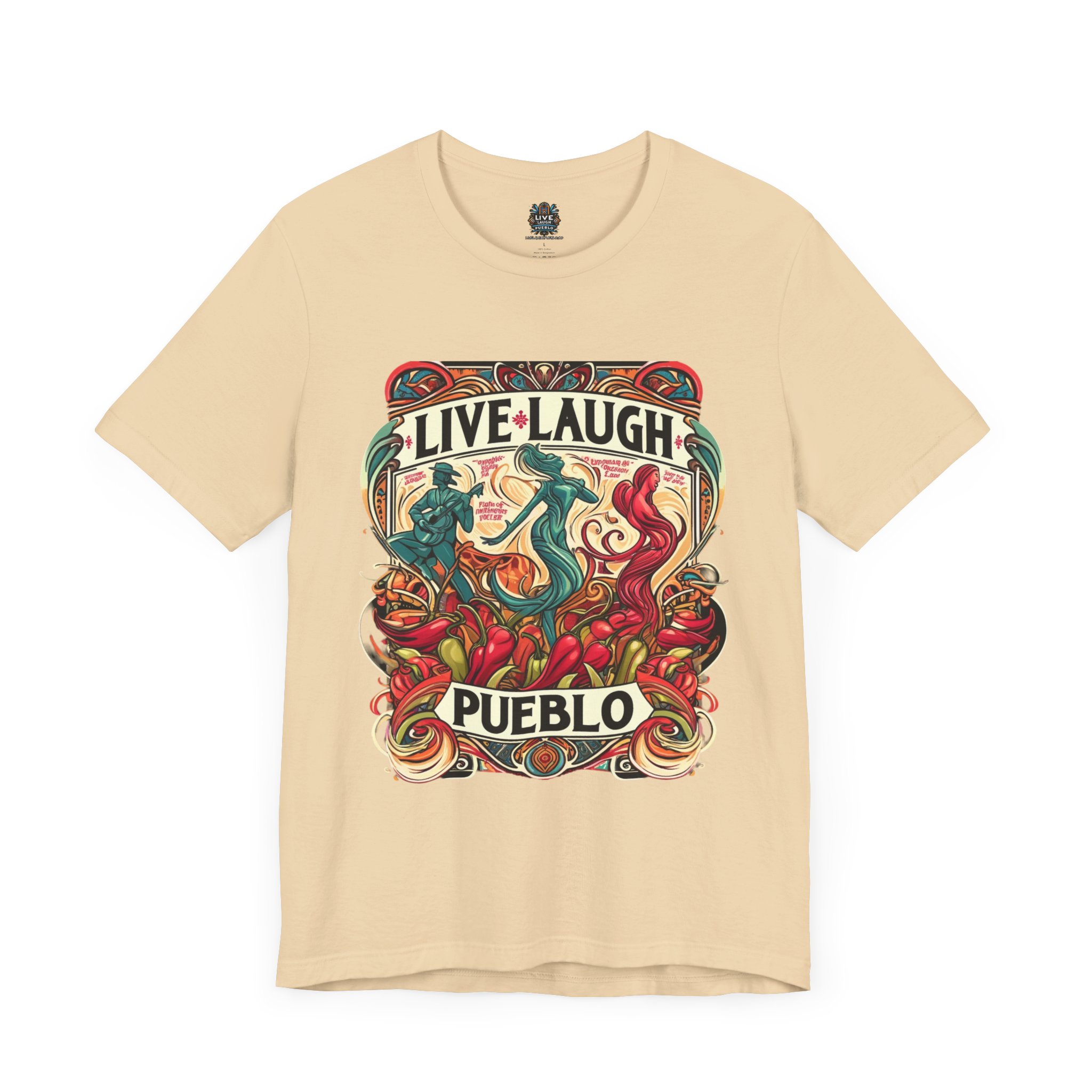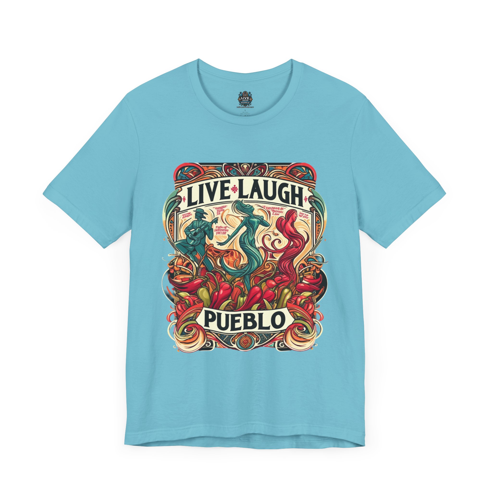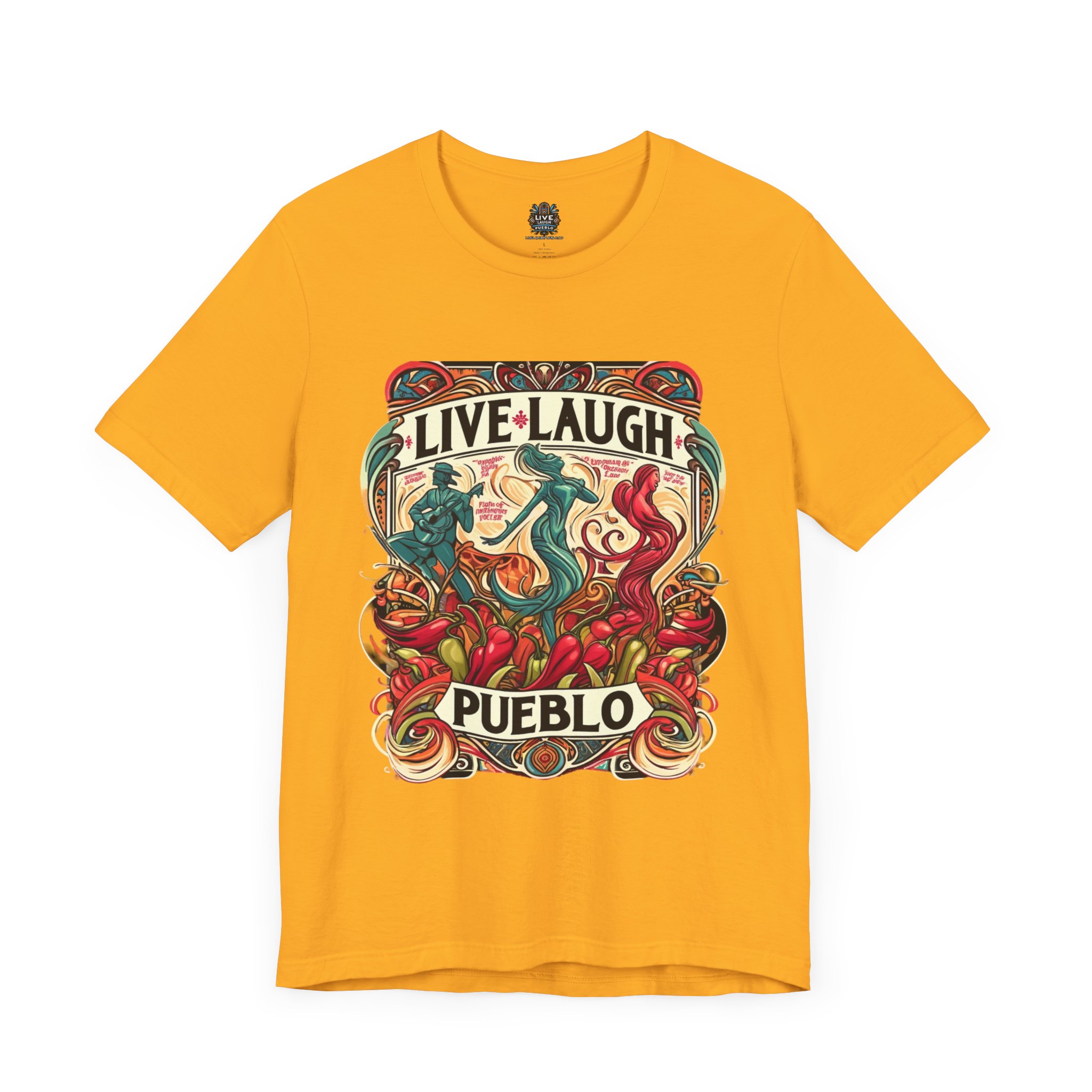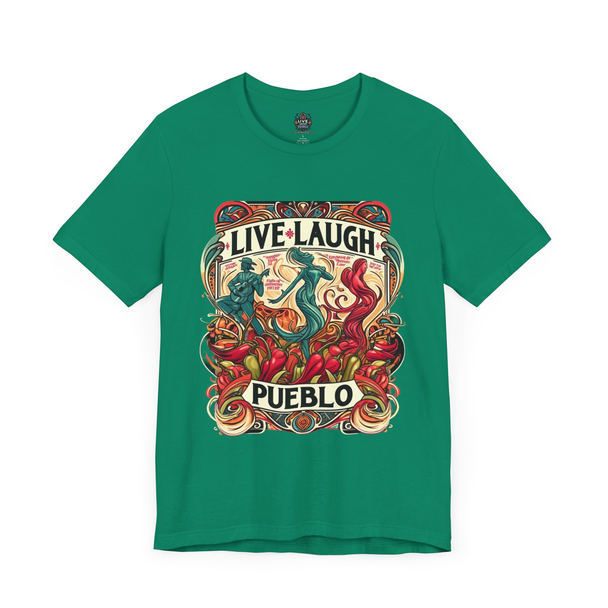 Immerse yourself in the vibrant culture of Southern Colorado and Northern New Mexico, with our “Live, Laugh, Pueblo! Art Nouveau Chile Spirit Dance Unisex Jersey Short Sleeve Tee.” This stunning tee features a captivating Art Nouveau design that celebrates Pueblo’s rich heritage and festive spirit. The intricate artwork showcases dynamic figures dancing amidst colorful chile peppers, symbolizing the lively traditions and flavors of Southern Colorado and Northern New Mexico. Made from high-quality, soft jersey fabric, this unisex short sleeve tee offers exceptional comfort and durability for everyday wear. Whether you’re attending a cultural festival, exploring the city, or relaxing at home, this tee is a stylish way to display your Pueblo spirit.