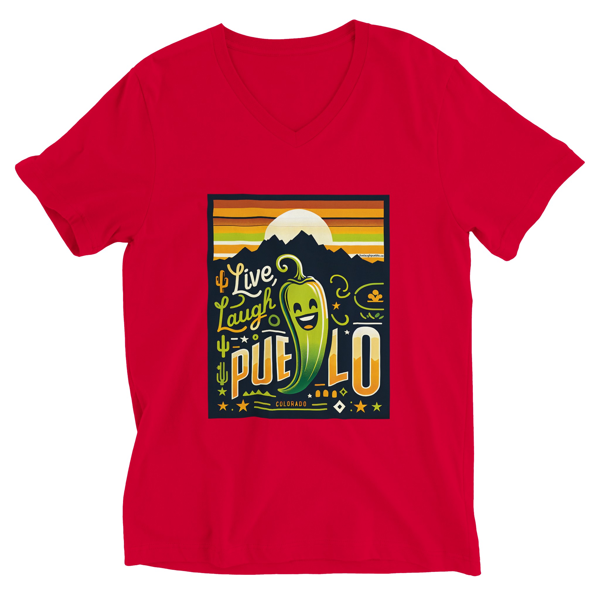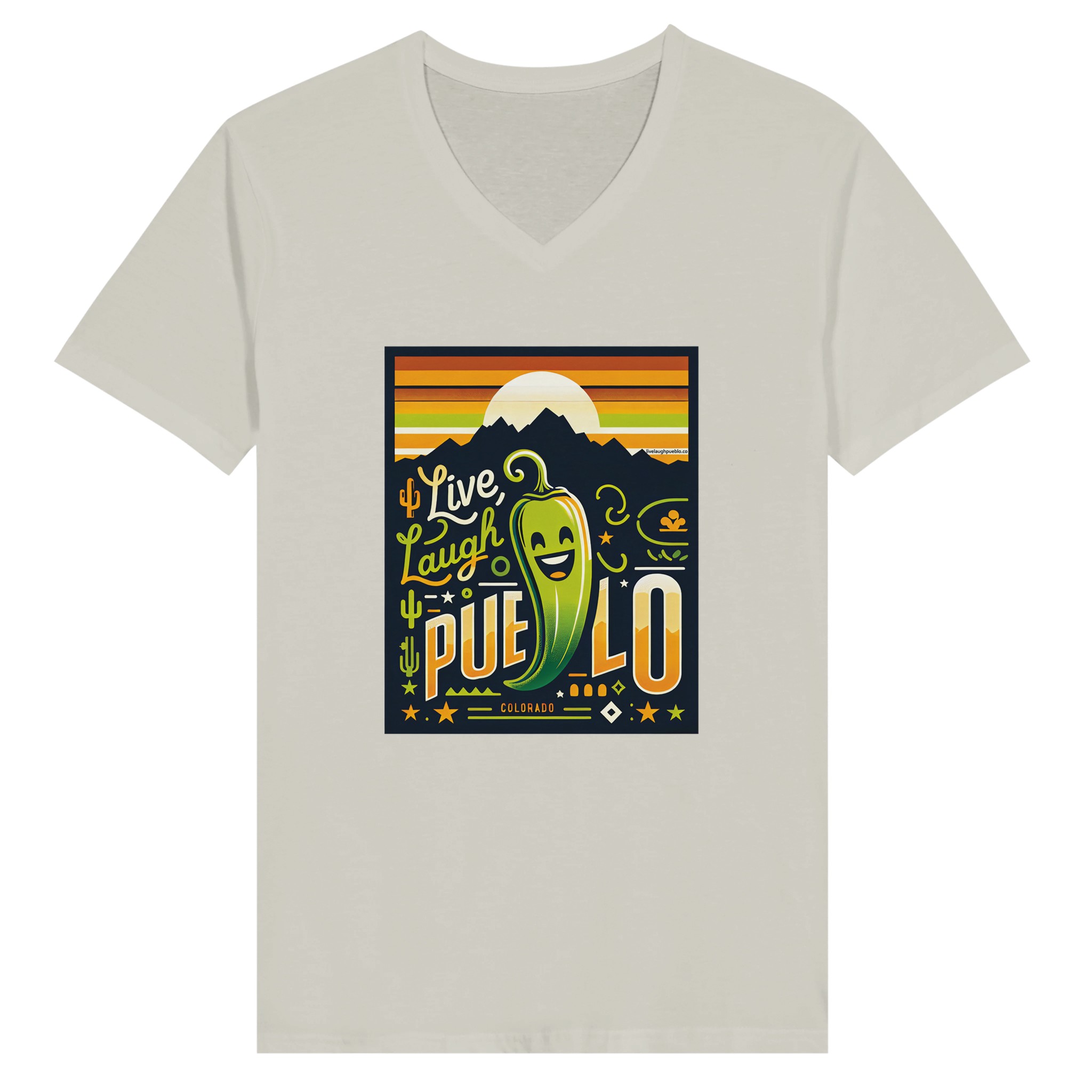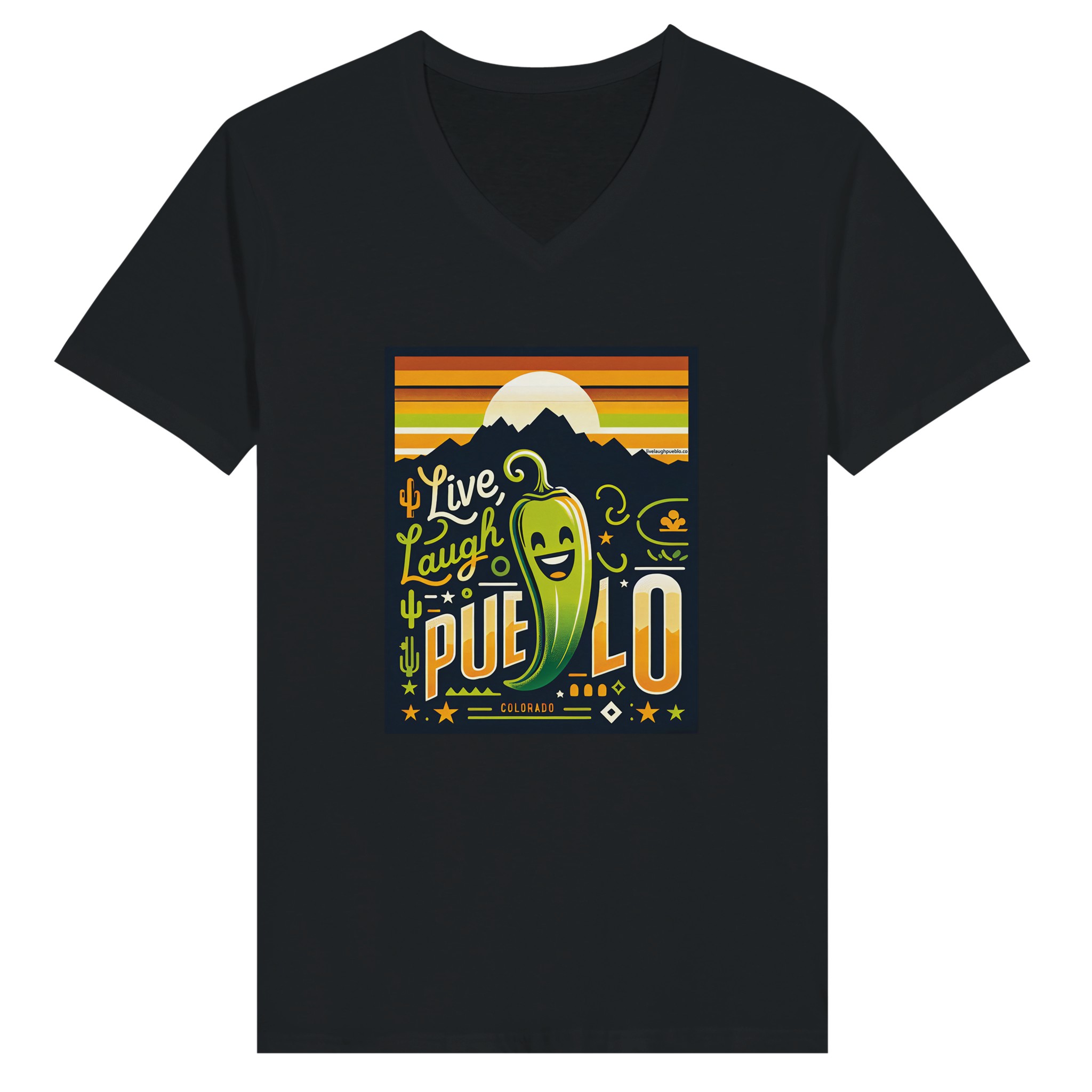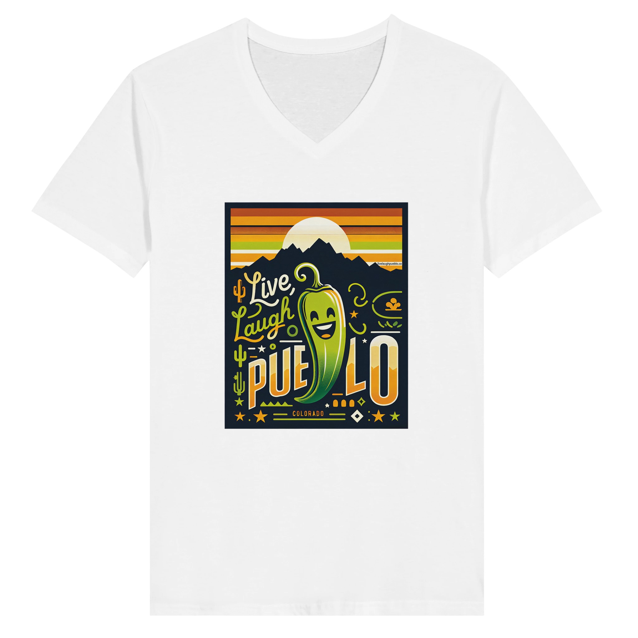 Embrace the vibrant spirit of Pueblo, Colorado with our “Live, Laugh, Pueblo” Premium Unisex V-Neck T-shirt. This eye-catching design features a cheerful green chile pepper with a beaming smile, set against a backdrop of majestic mountains and a warm sunset sky. The playful typography and Southwestern motifs, including cacti and stars, capture the essence of Pueblo’s unique charm and zest for life.