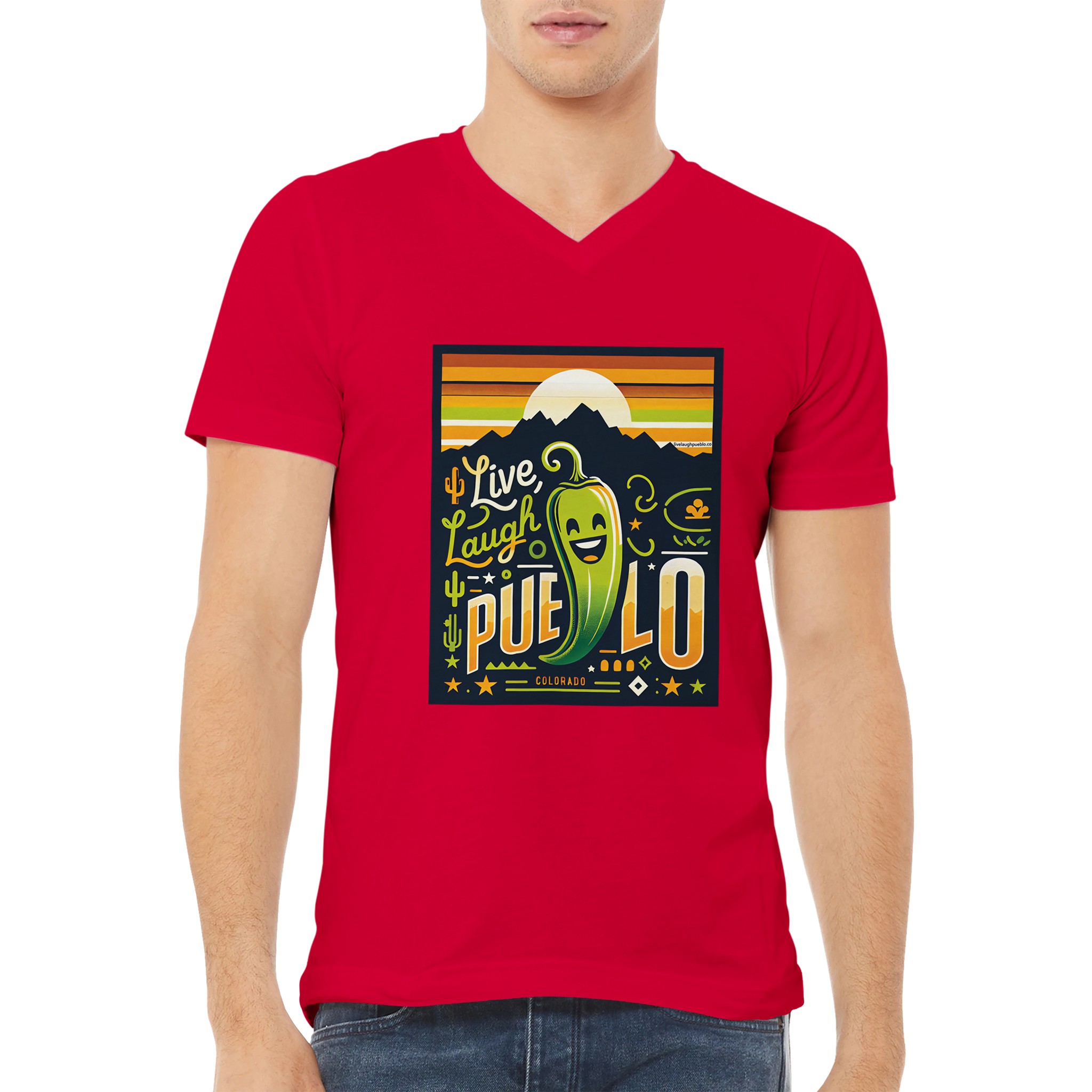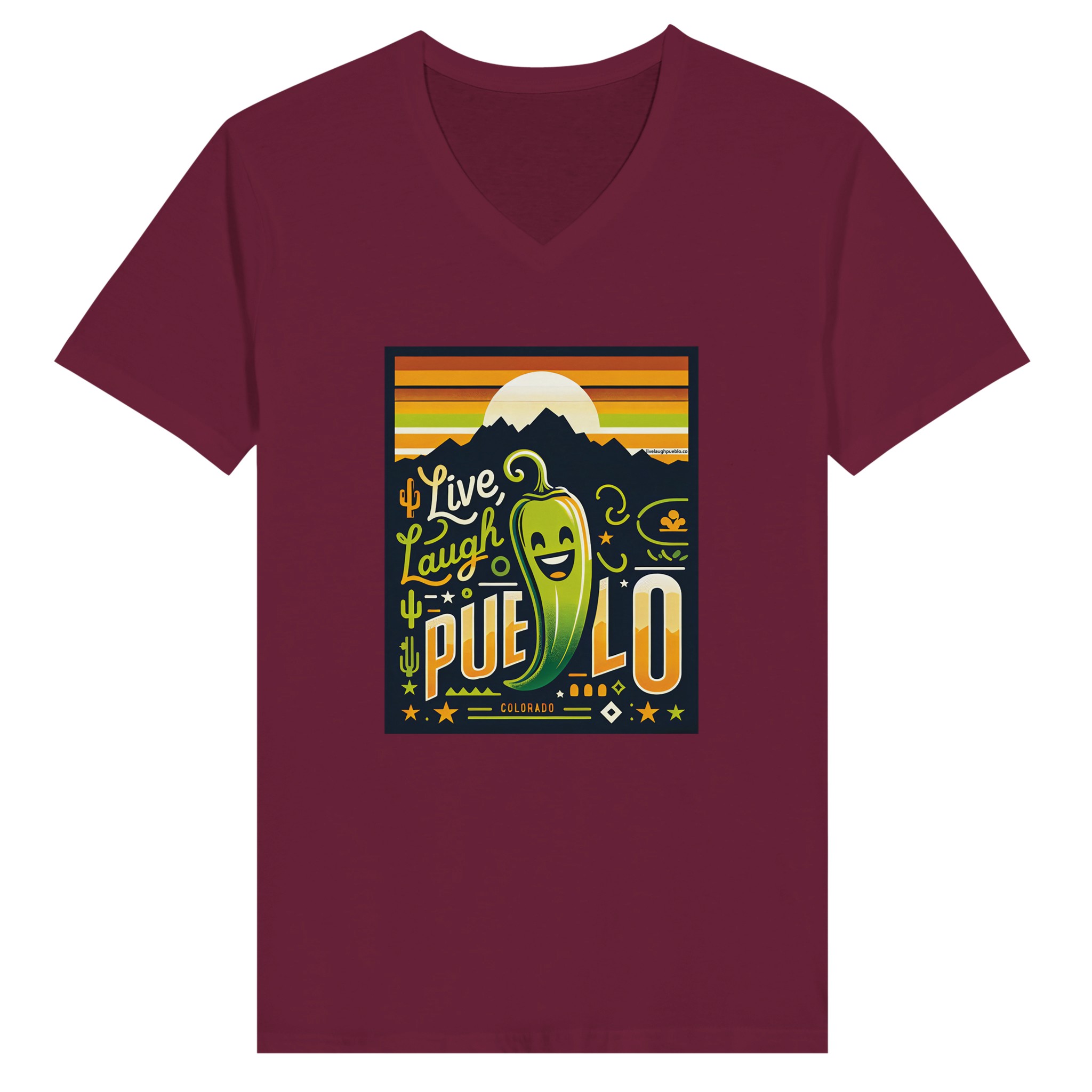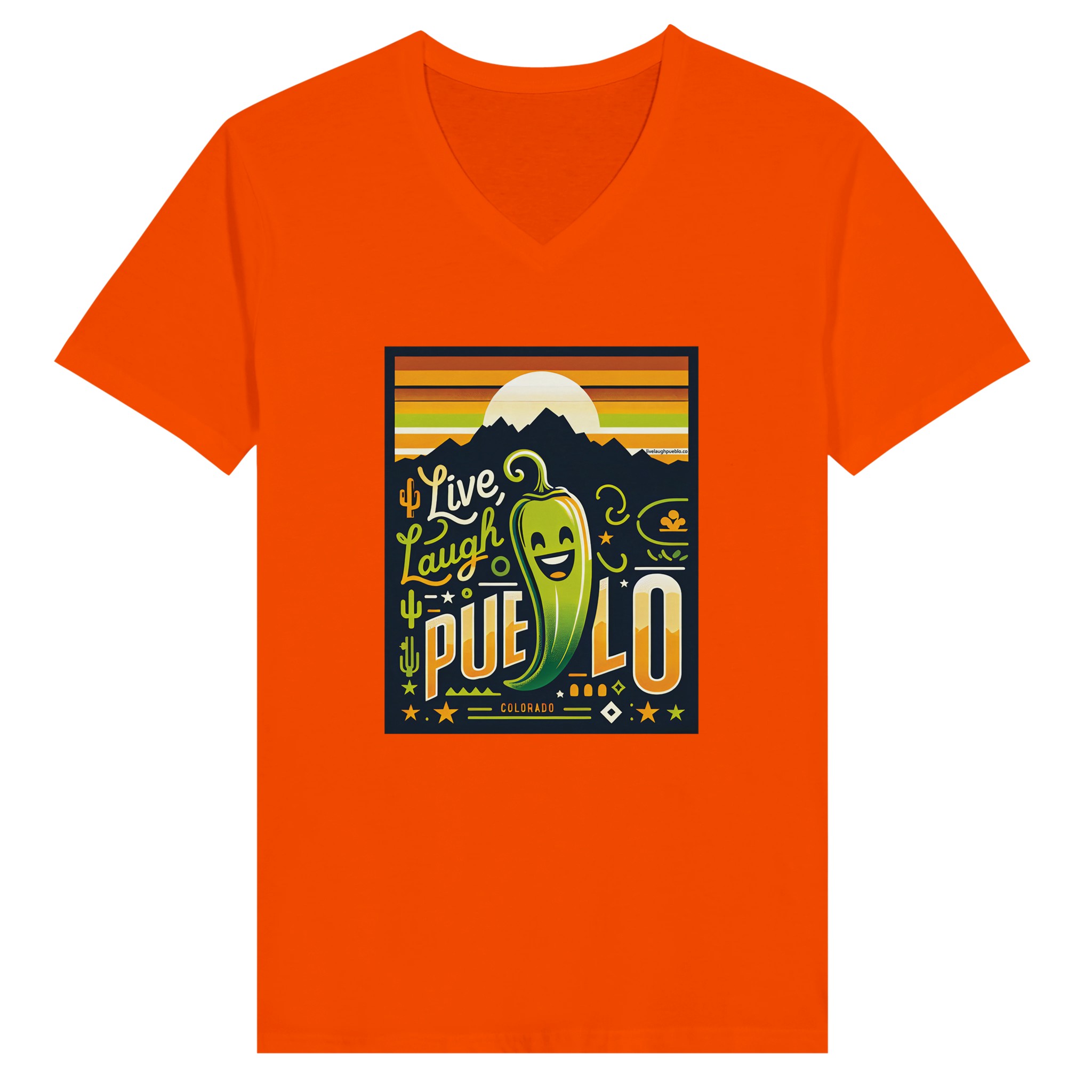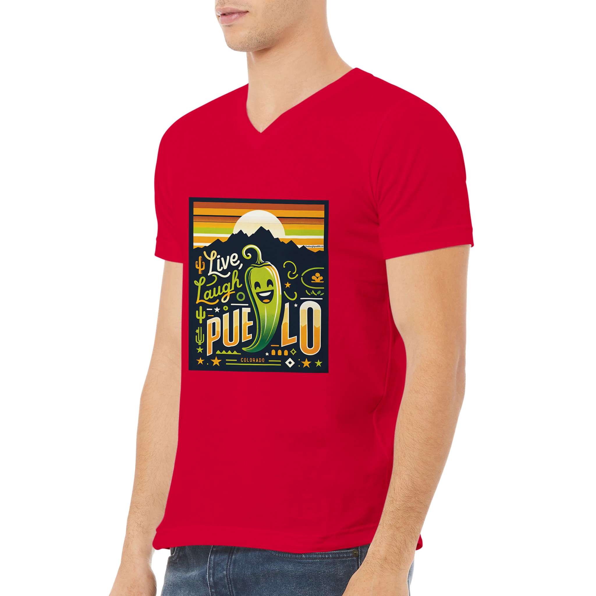 Embrace the vibrant spirit of Pueblo, Colorado with our “Live, Laugh, Pueblo” Premium Unisex V-Neck T-shirt. This eye-catching design features a cheerful green chile pepper with a beaming smile, set against a backdrop of majestic mountains and a warm sunset sky. The playful typography and Southwestern motifs, including cacti and stars, capture the essence of Pueblo’s unique charm and zest for life.
