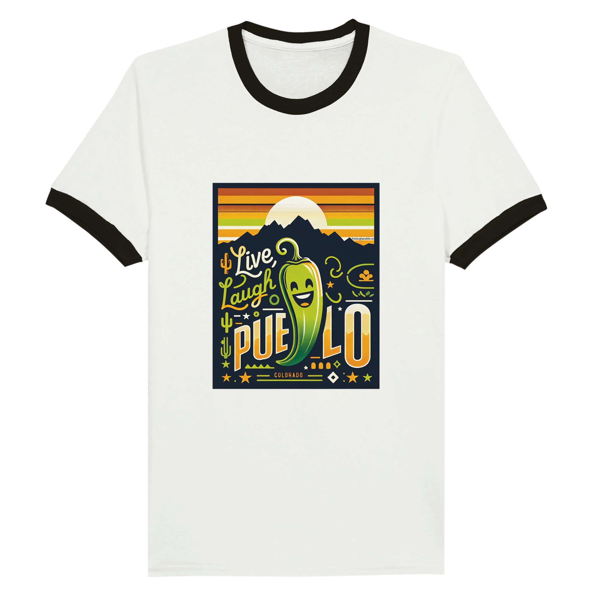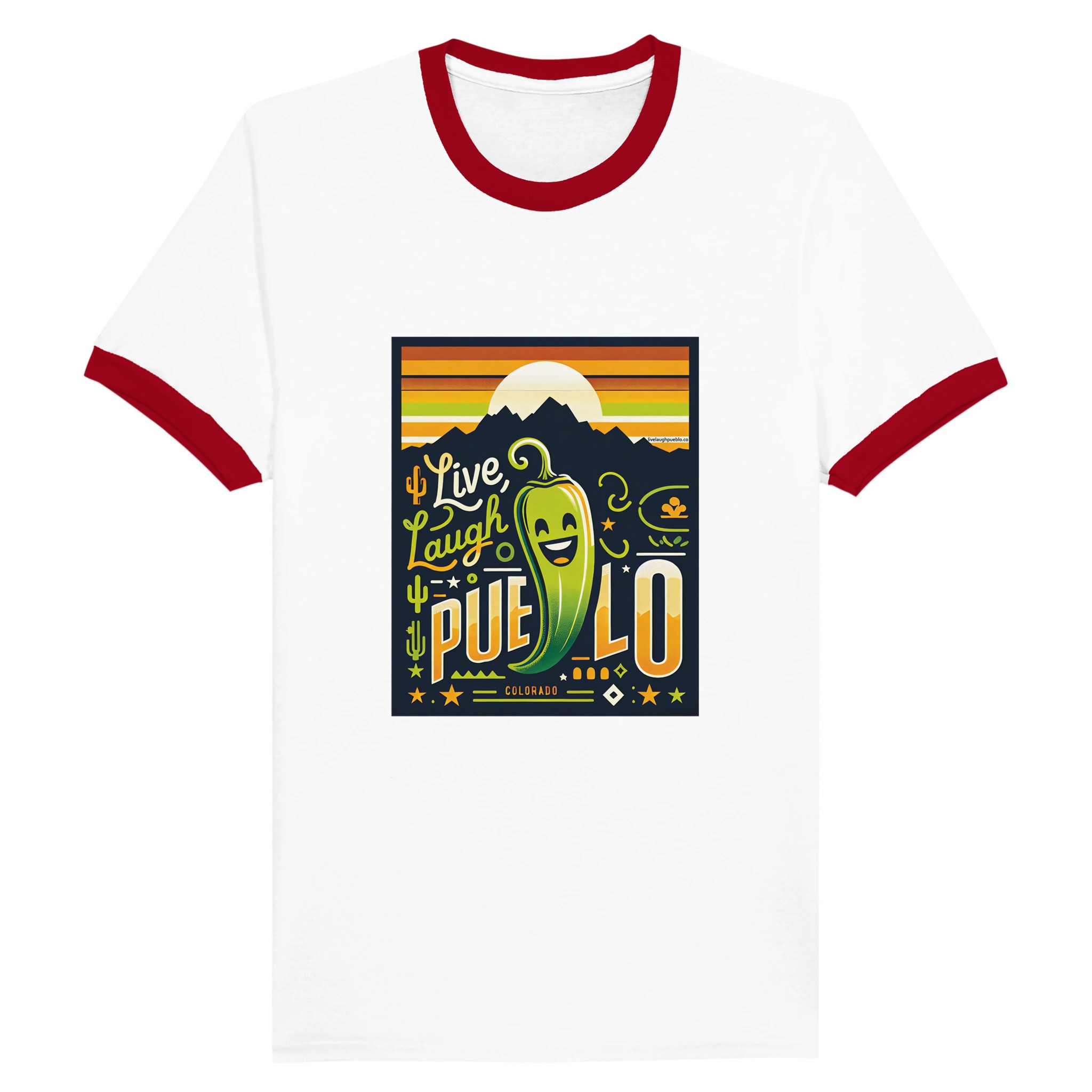 Vibrant “Live, Laugh, Pueblo” design with a smiling chile pepper