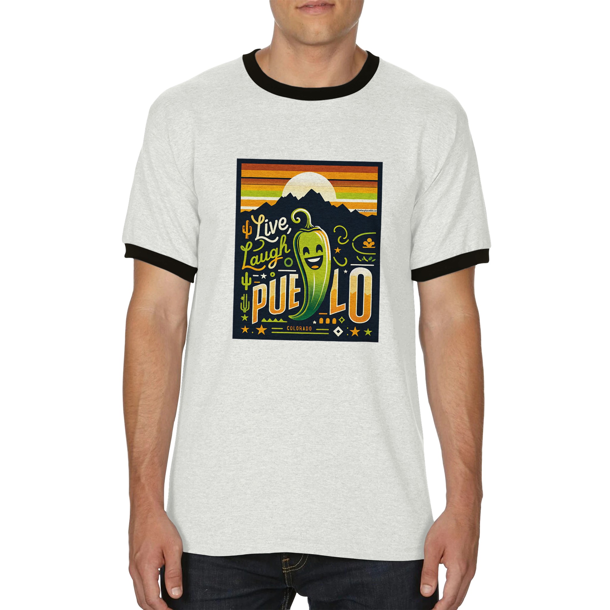 This ringer t-shirt is a must-have for every collection, perfect for showing your love for Pueblo or your appreciation for its famous chiles. The contrasting neck and sleeve binding adds a stylish touch that’s suitable for any occasion, whether you’re exploring the city, attending a local festival, or just enjoying a casual day out.