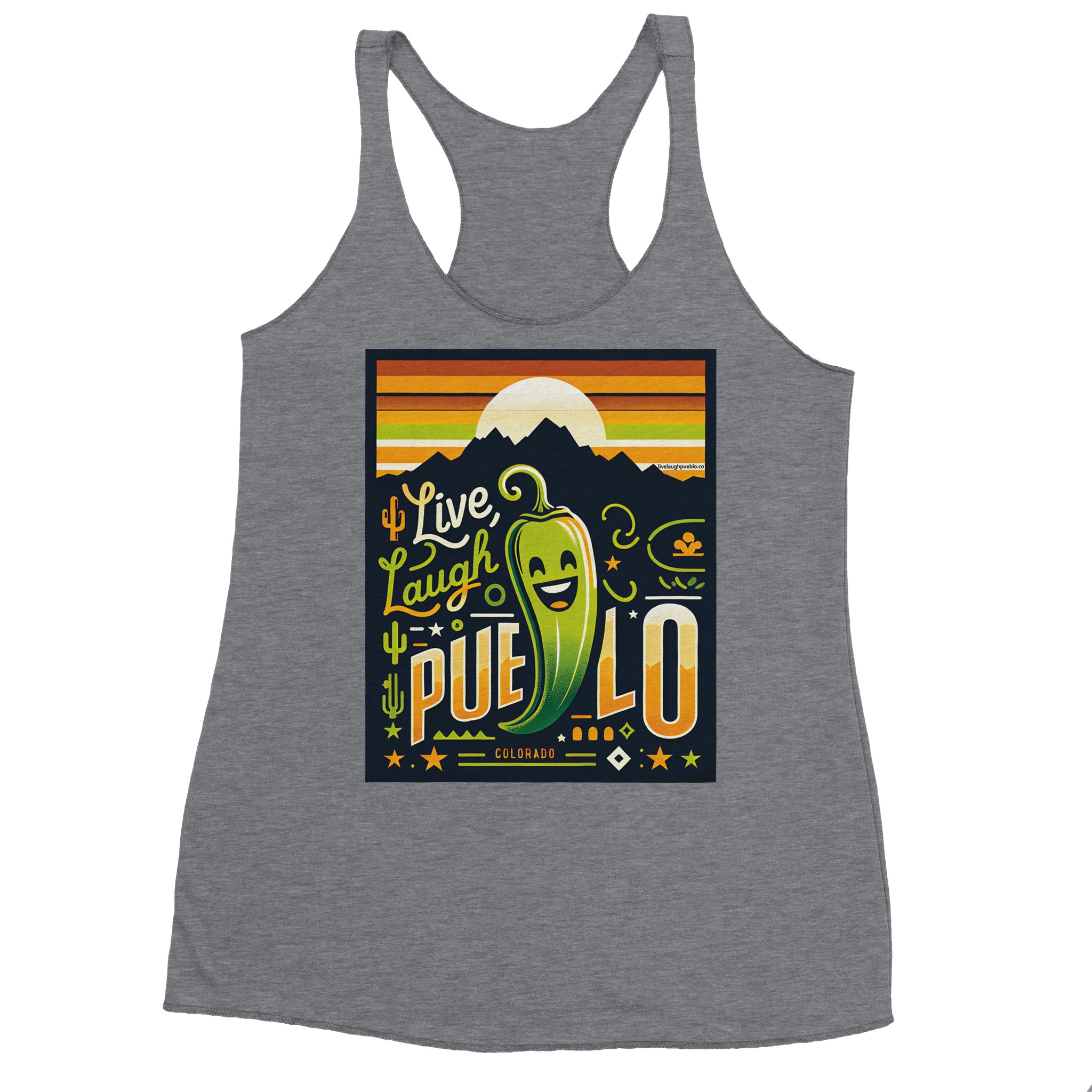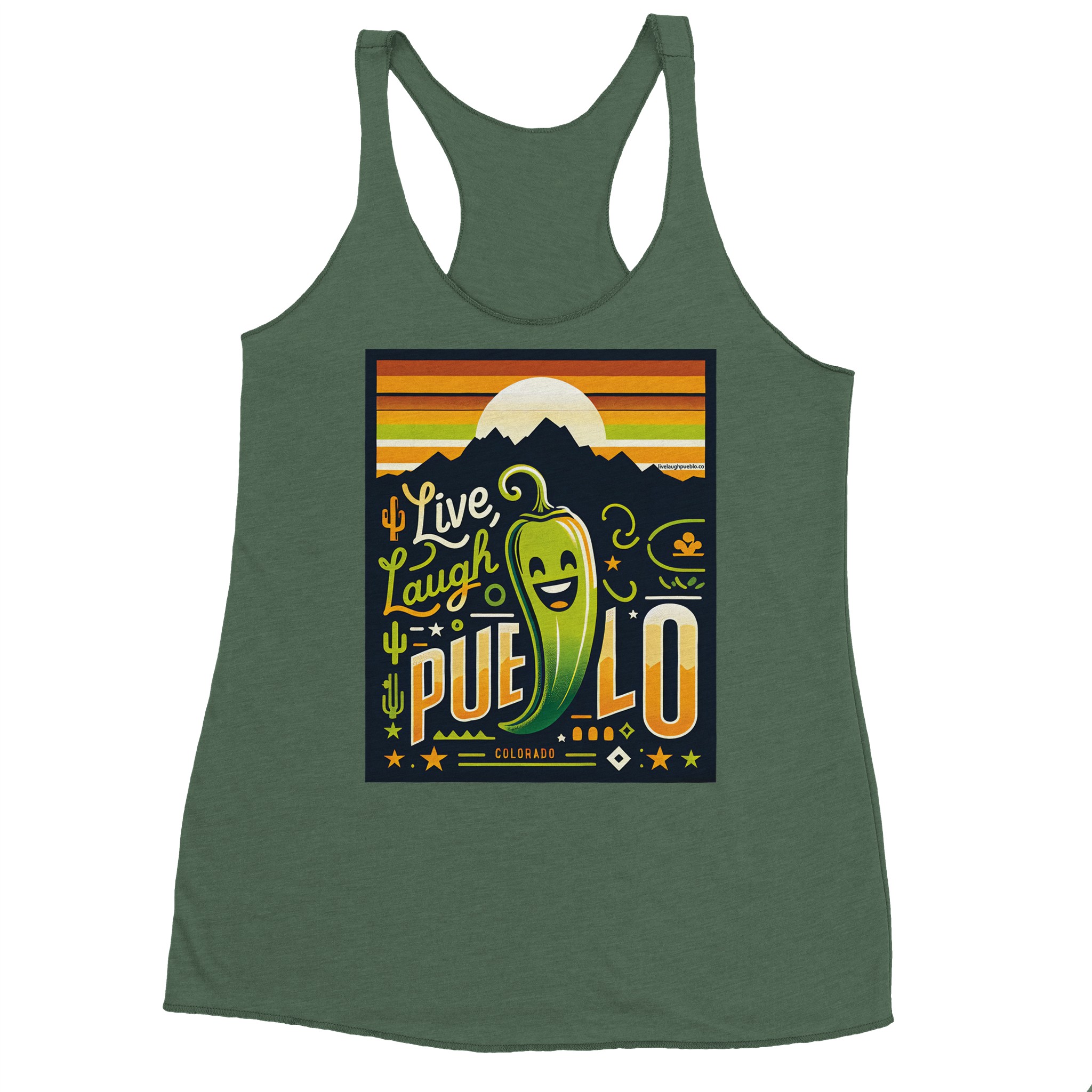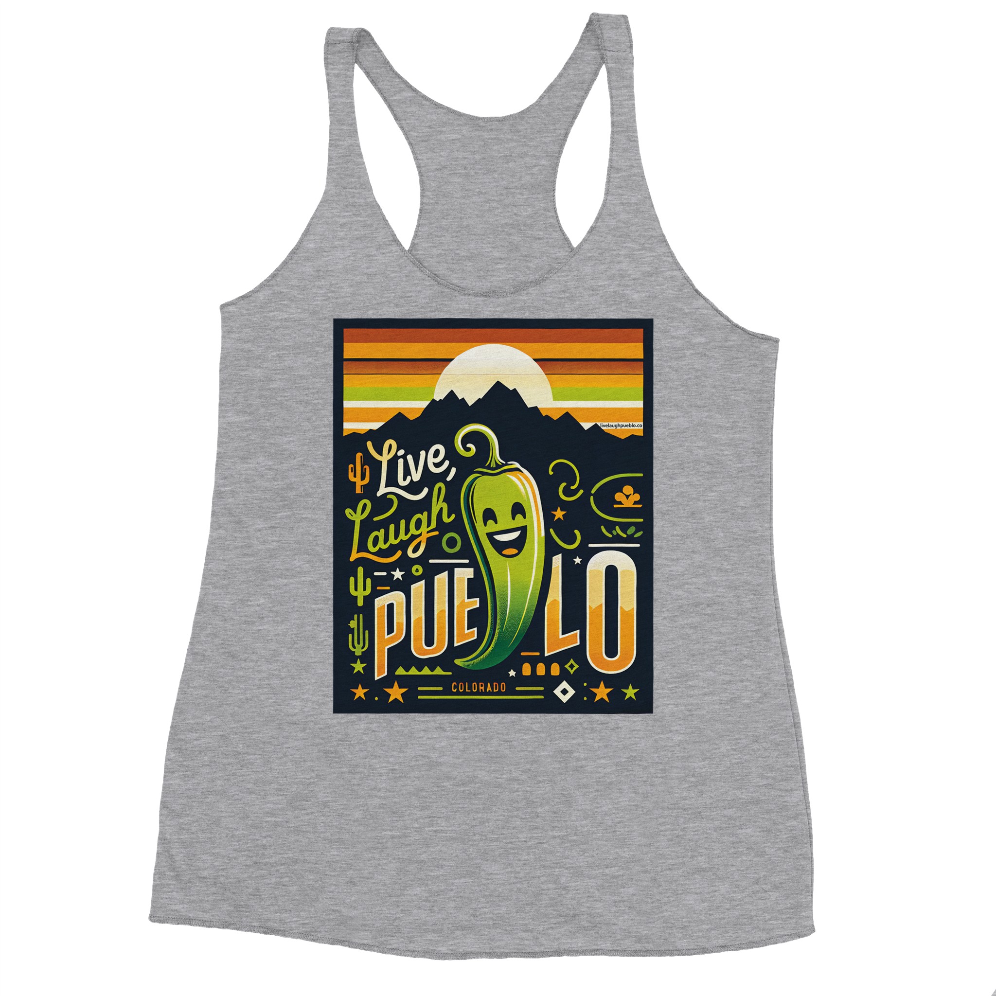Embrace the vibrant spirit of Pueblo, Colorado with our “Live, Laugh, Pueblo” Women’s Racerback Tank Top. This eye-catching design features a cheerful green chile pepper with a beaming smile, set against a backdrop of majestic mountains and a warm sunset sky. The playful typography and Southwestern motifs, including cacti and stars, capture the essence of Pueblo’s unique charm.