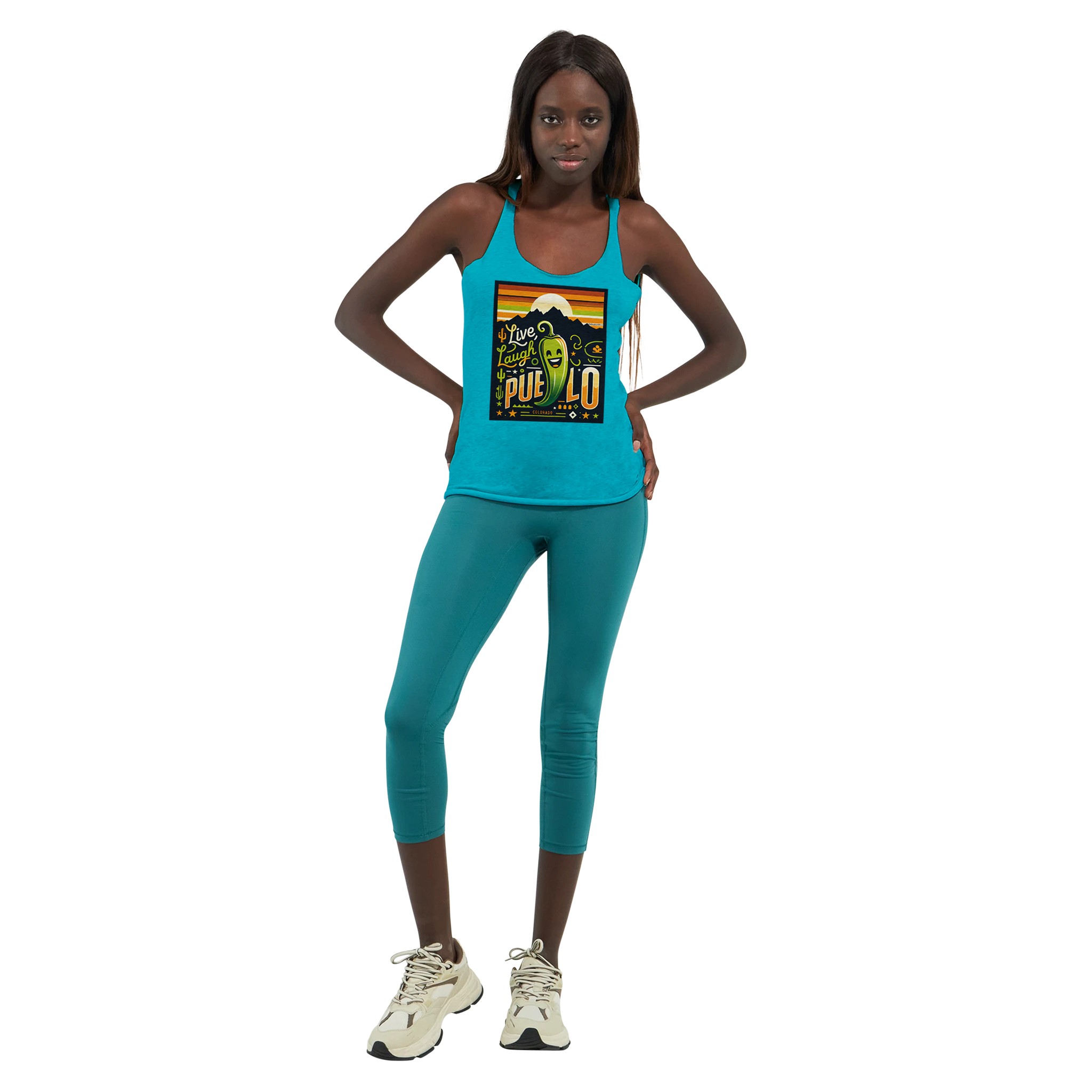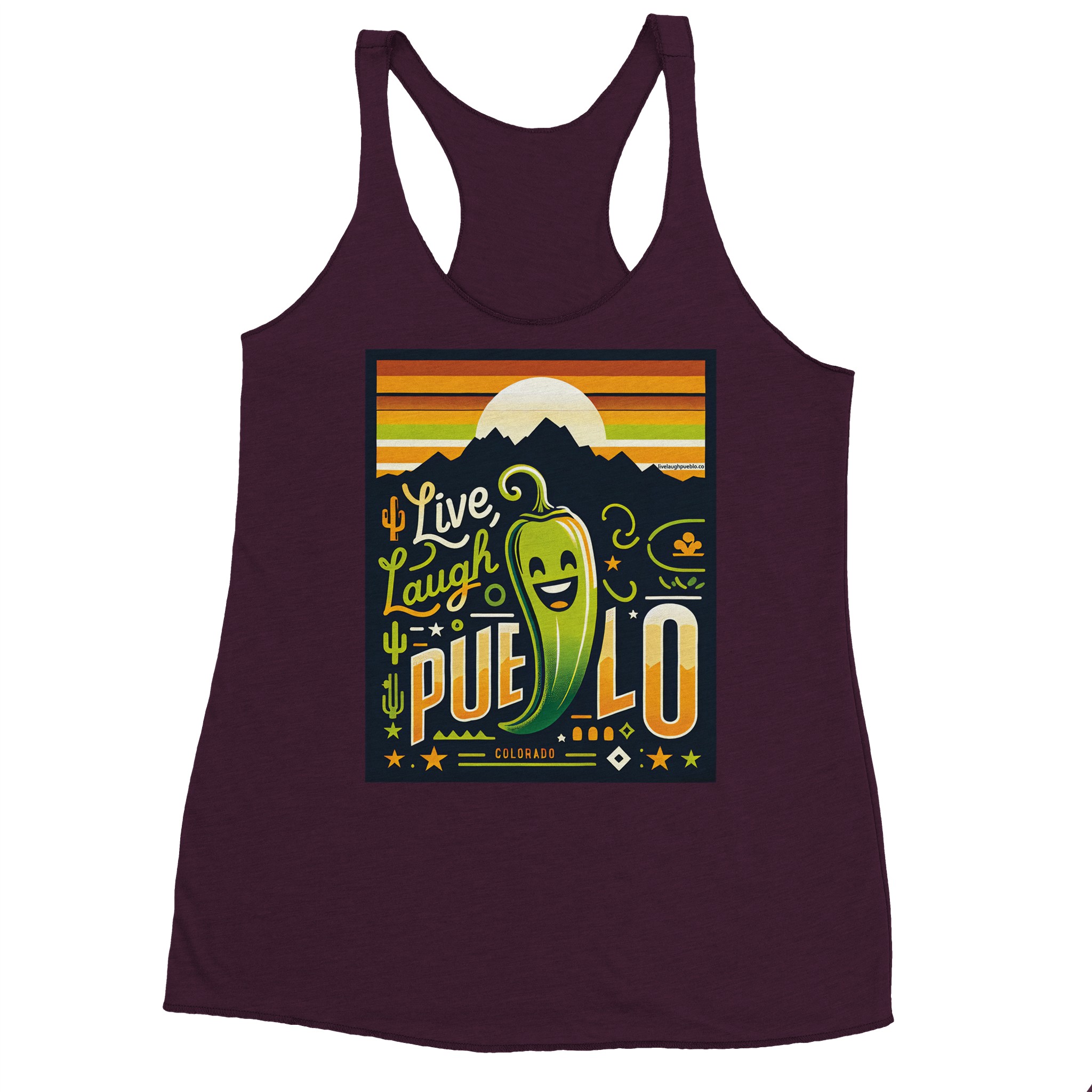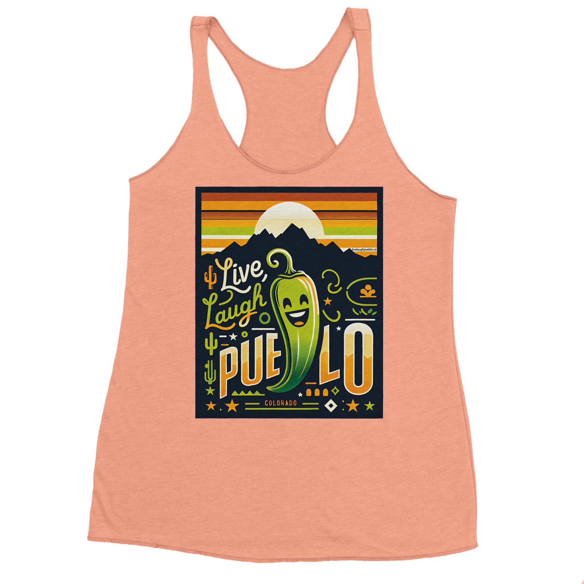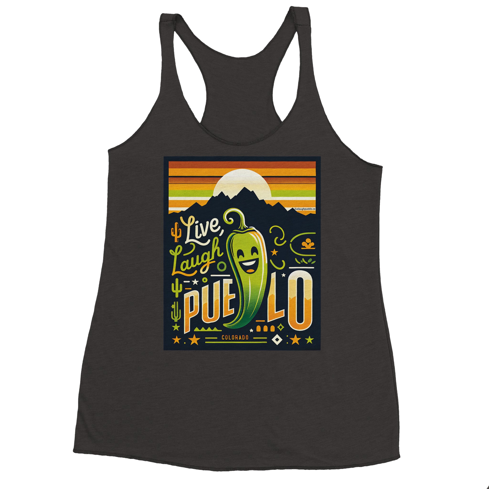 Embrace the vibrant spirit of Pueblo, Colorado with our “Live, Laugh, Pueblo” Women’s Racerback Tank Top. This eye-catching design features a cheerful green chile pepper with a beaming smile, set against a backdrop of majestic mountains and a warm sunset sky. The playful typography and Southwestern motifs, including cacti and stars, capture the essence of Pueblo’s unique charm.