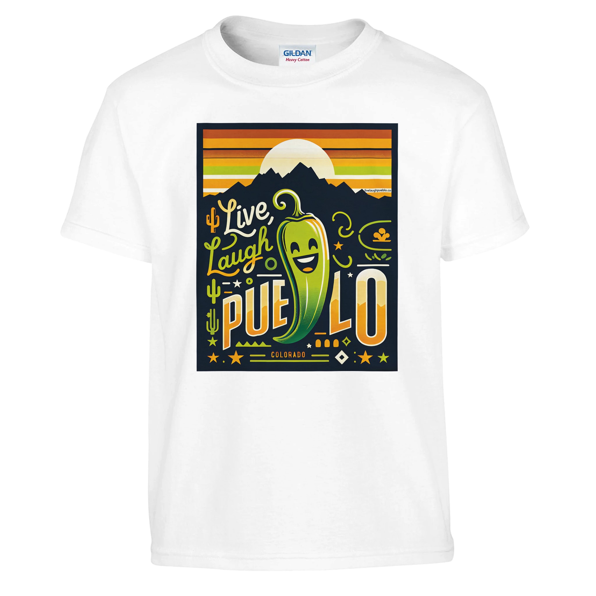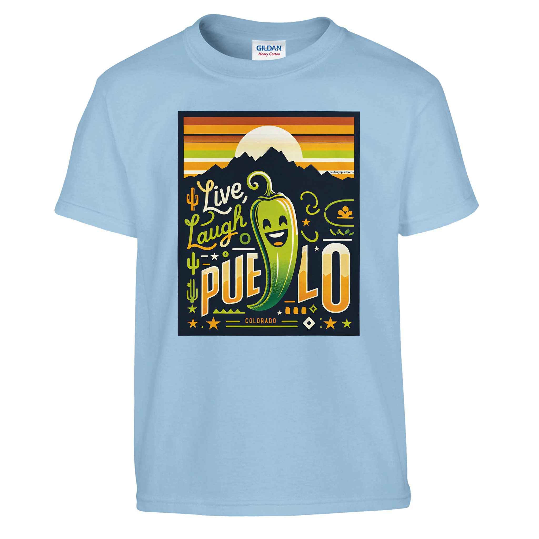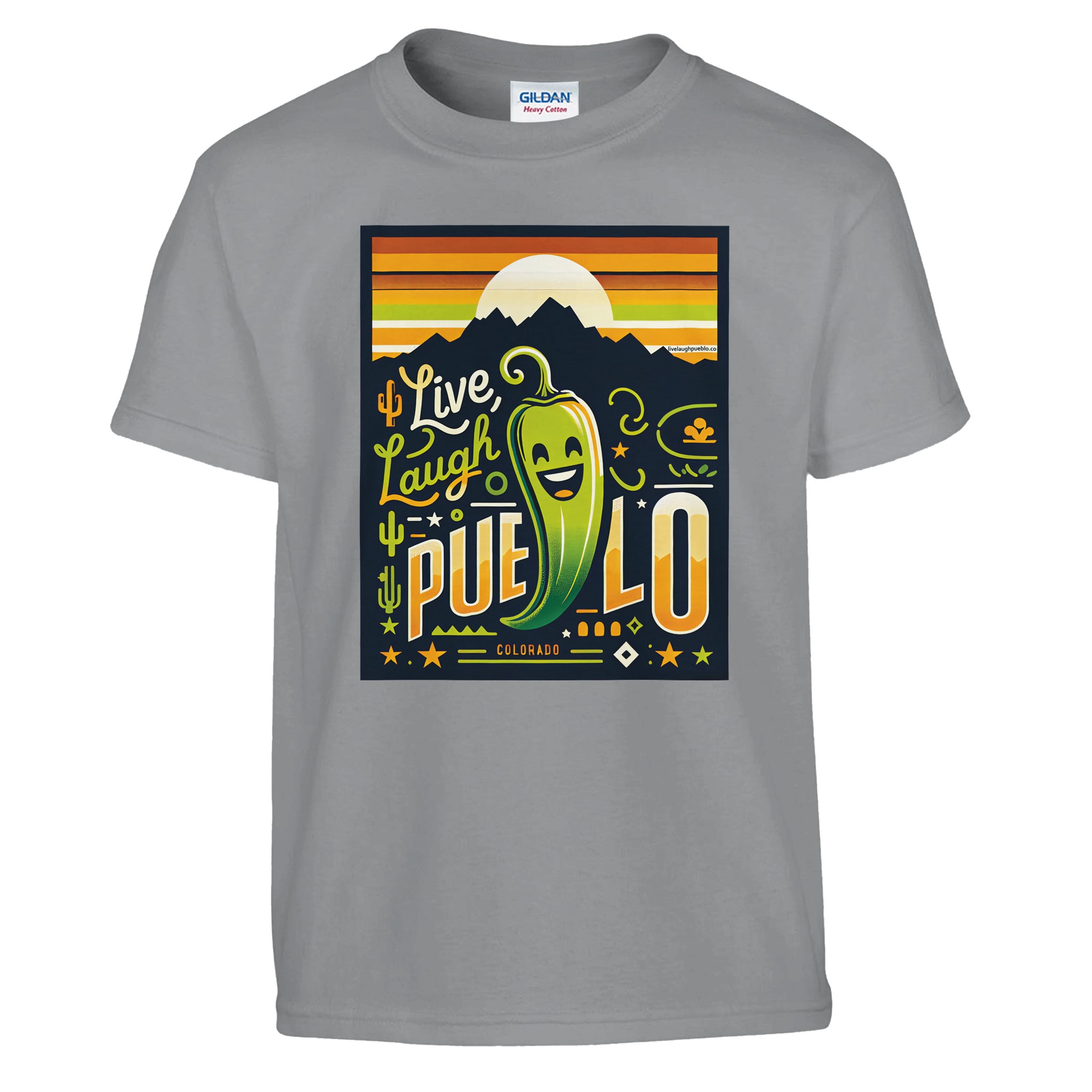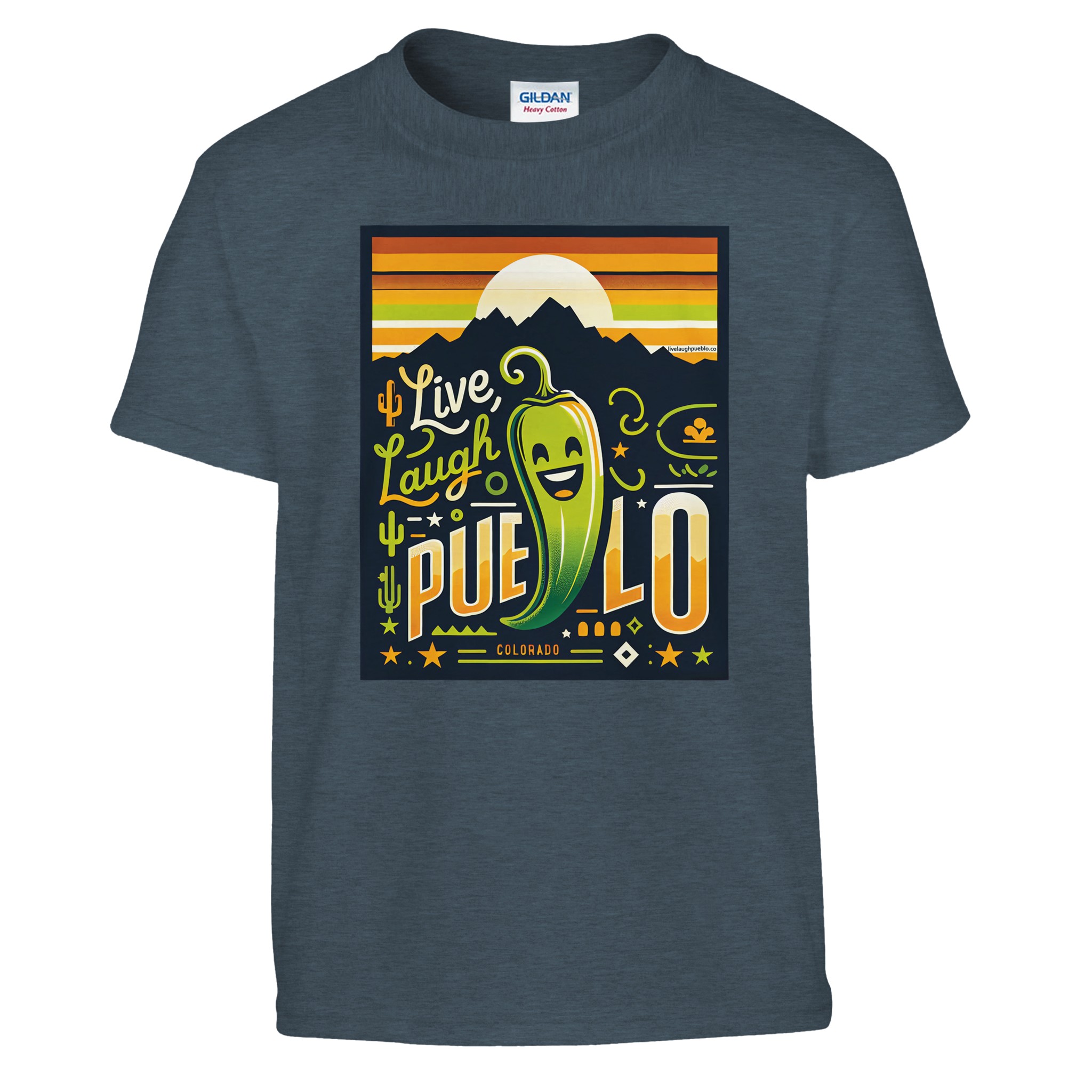 Bring the vibrant spirit of Pueblo, Colorado to your little one’s wardrobe with our “Live Laugh Pueblo” kids crewneck t-shirt. This eye-catching design features a cheerful green chili pepper with a big smile, set against a backdrop of mountain silhouettes and a warm sunset sky. The playful typography and Southwestern-inspired elements make this shirt a fun and stylish choice for young Colorado enthusiasts.