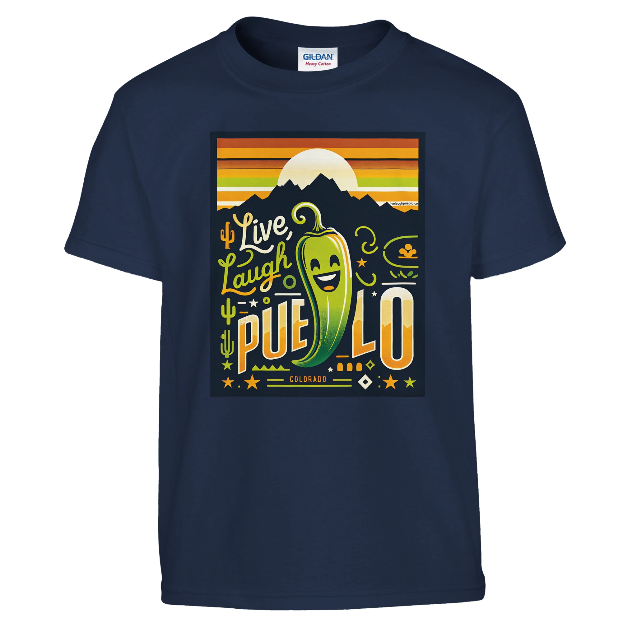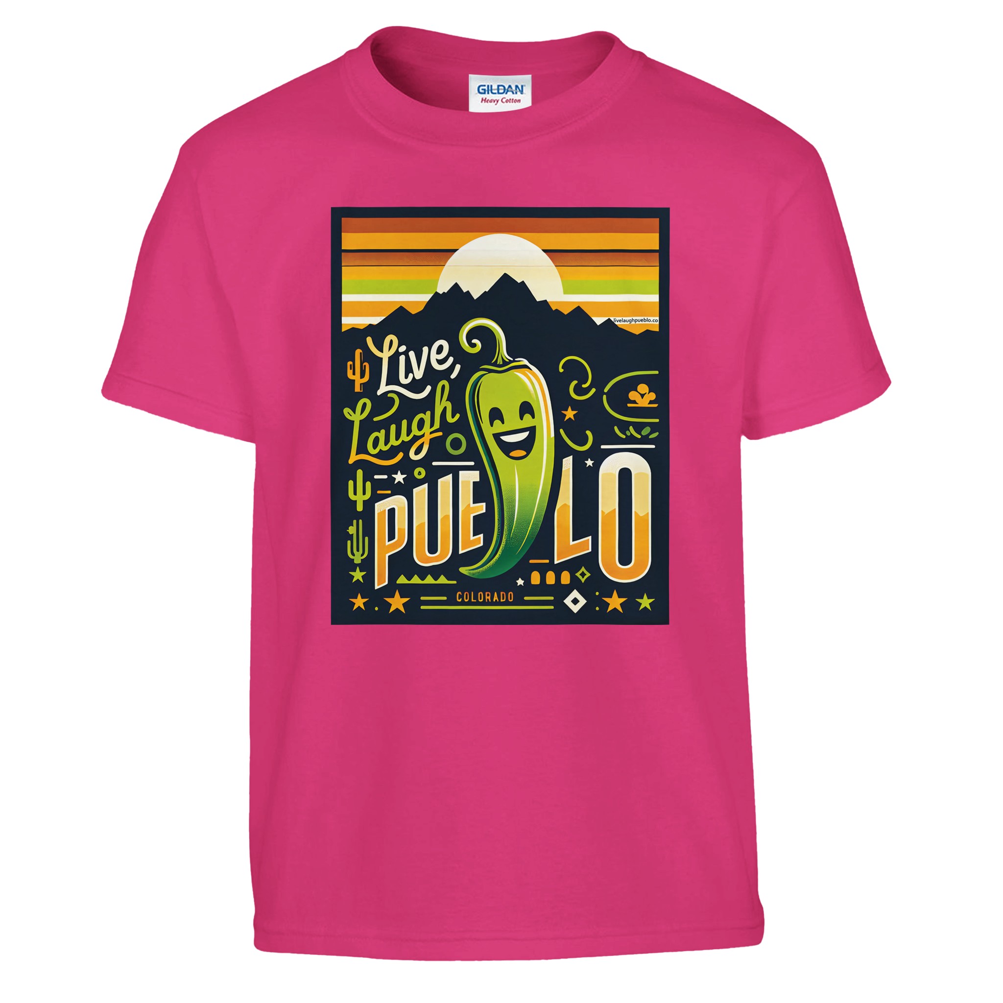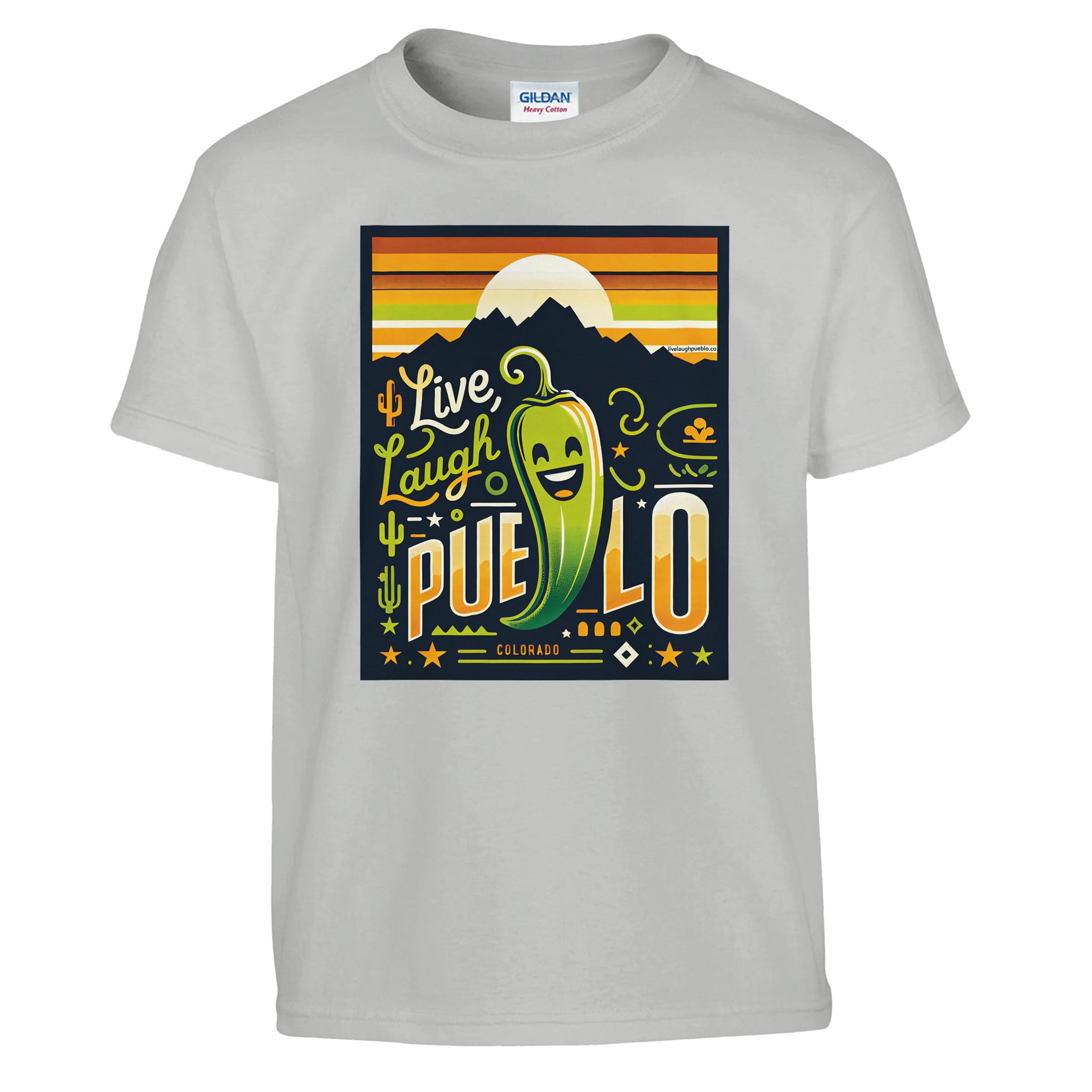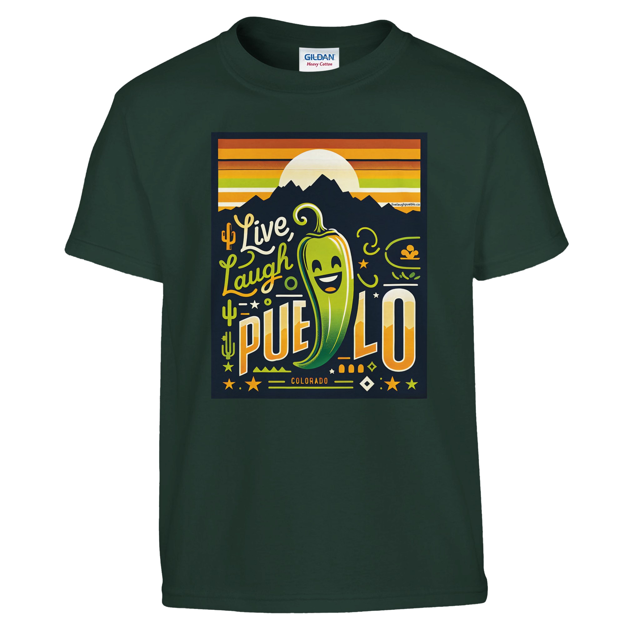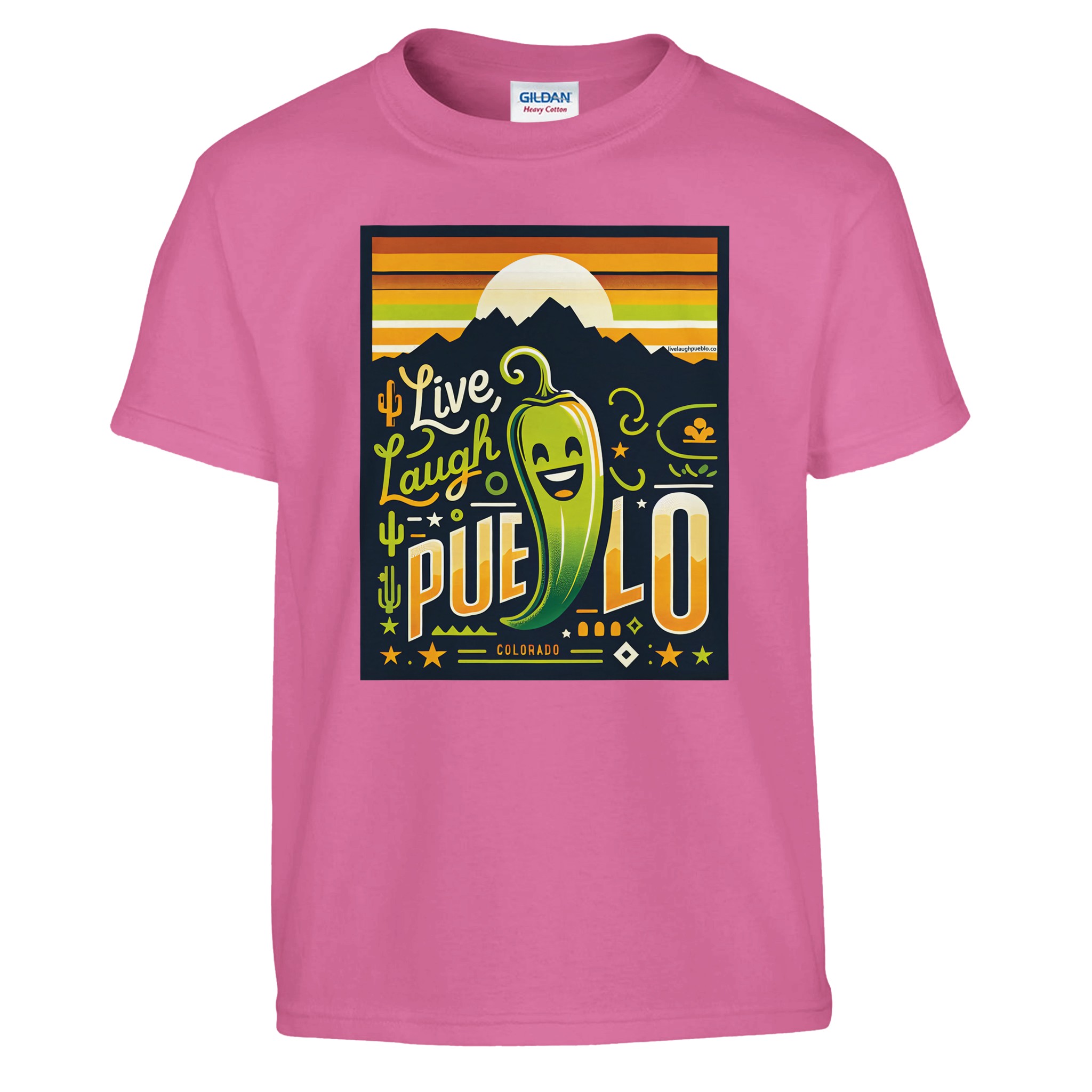 Bring the vibrant spirit of Pueblo, Colorado to your little one’s wardrobe with our “Live Laugh Pueblo” kids crewneck t-shirt. This eye-catching design features a cheerful green chili pepper with a big smile, set against a backdrop of mountain silhouettes and a warm sunset sky. The playful typography and Southwestern-inspired elements make this shirt a fun and stylish choice for young Colorado enthusiasts.