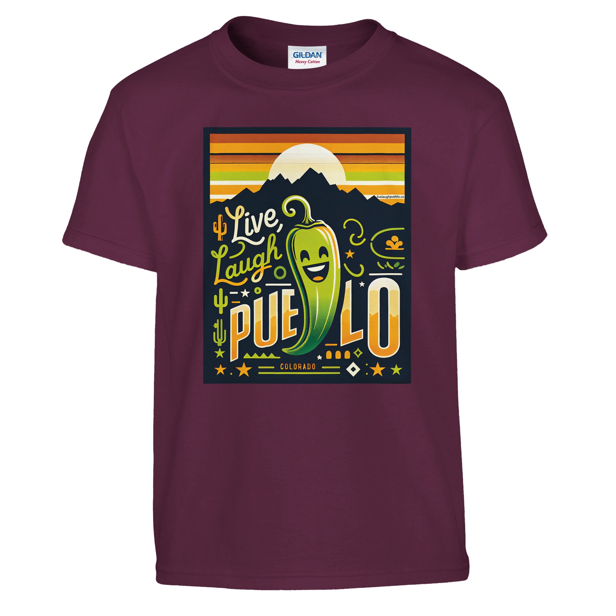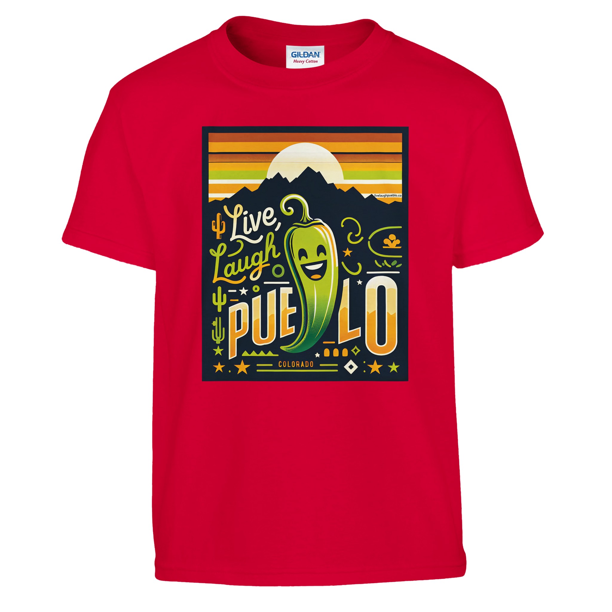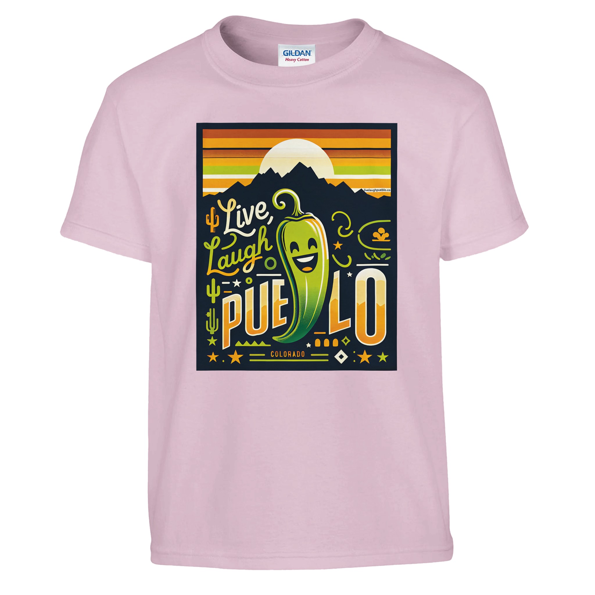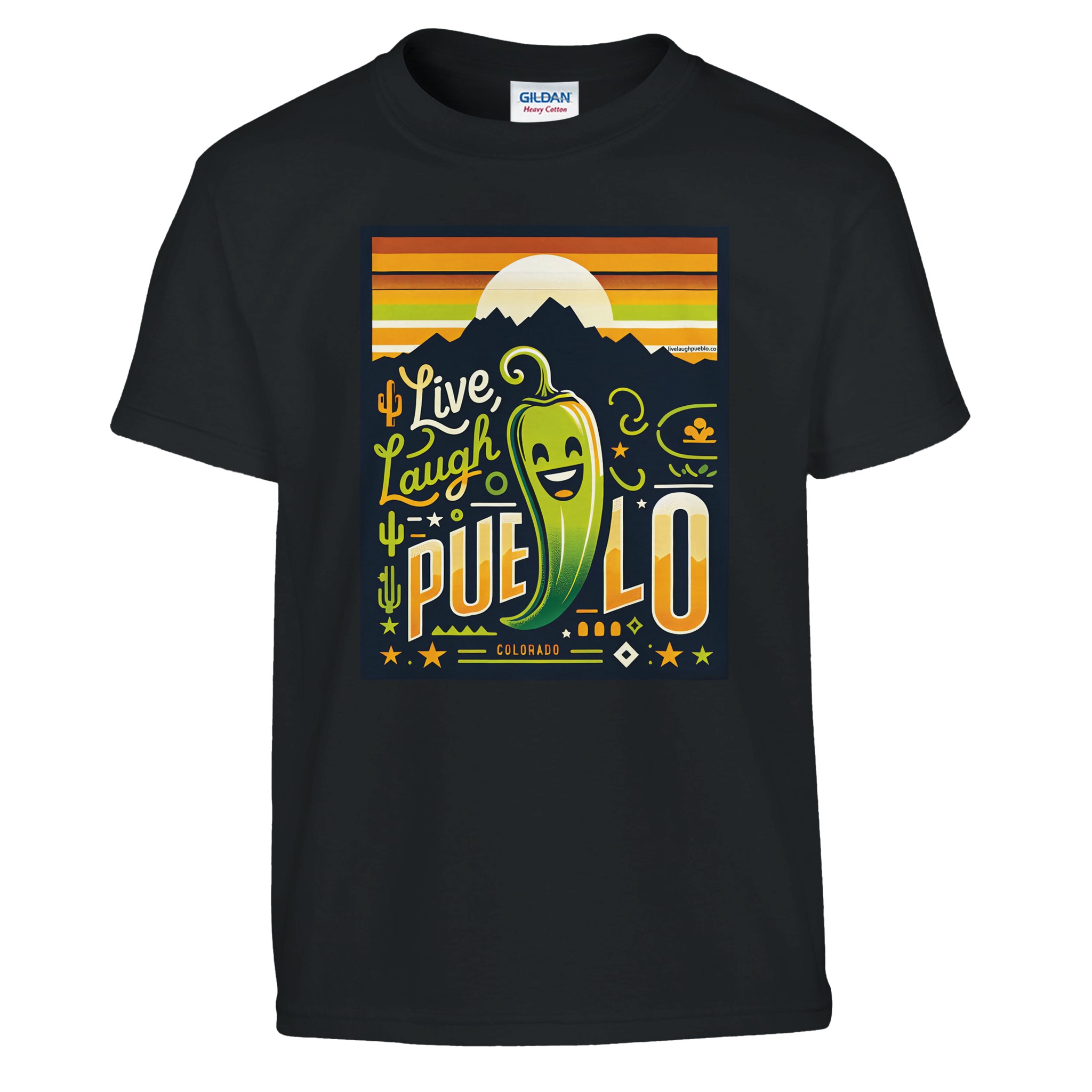 Bring the vibrant spirit of Pueblo, Colorado to your little one’s wardrobe with our “Live Laugh Pueblo” kids crewneck t-shirt. This eye-catching design features a cheerful green chili pepper with a big smile, set against a backdrop of mountain silhouettes and a warm sunset sky. The playful typography and Southwestern-inspired elements make this shirt a fun and stylish choice for young Colorado enthusiasts.