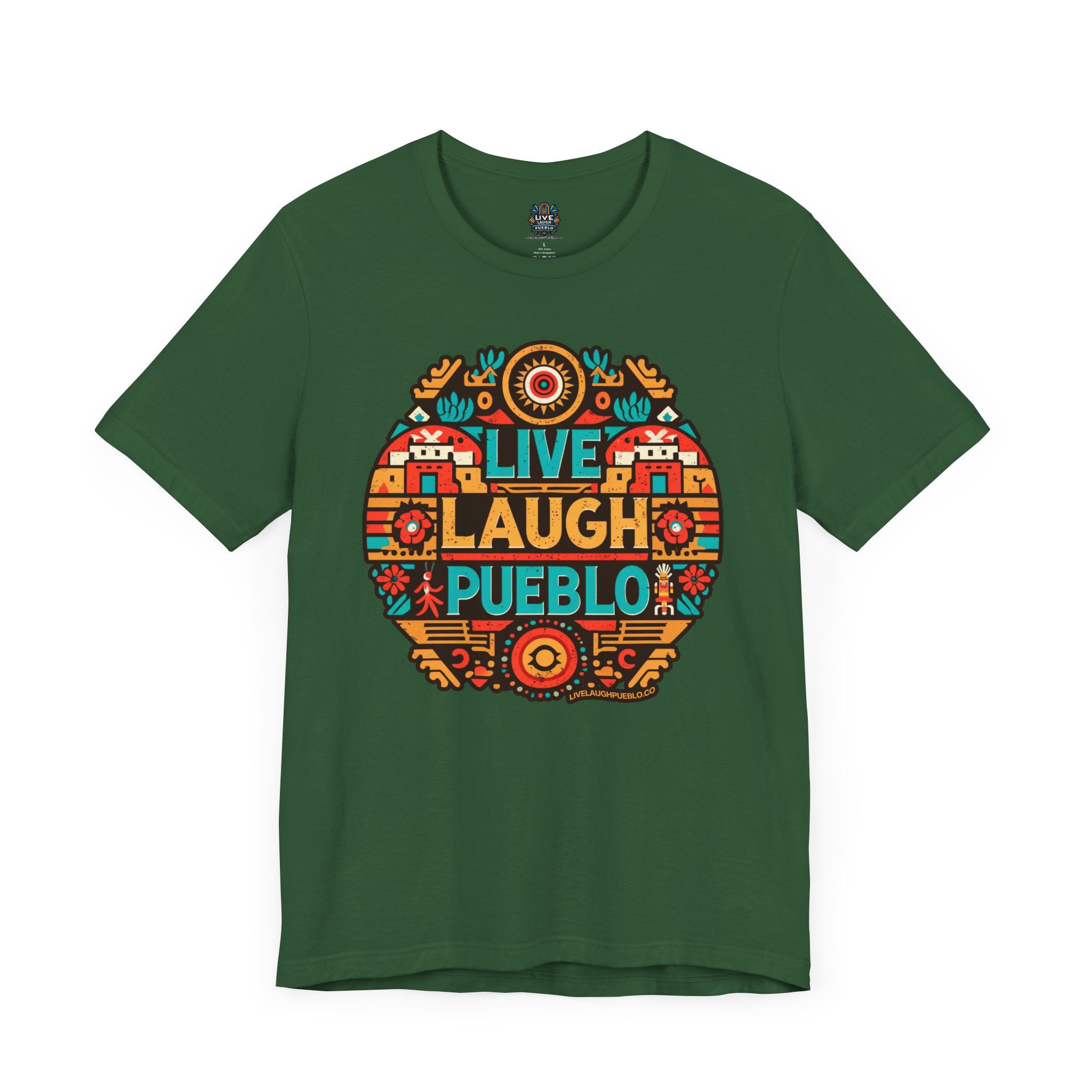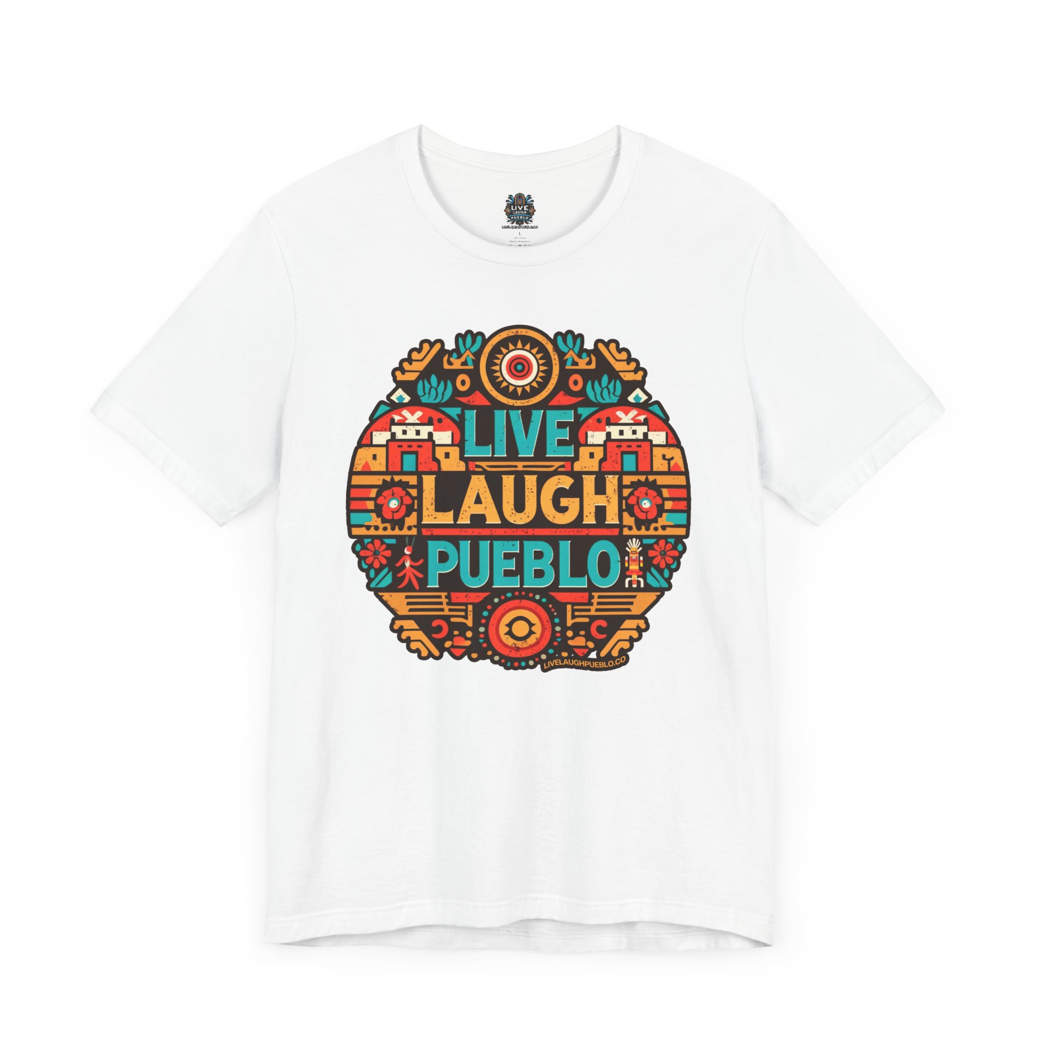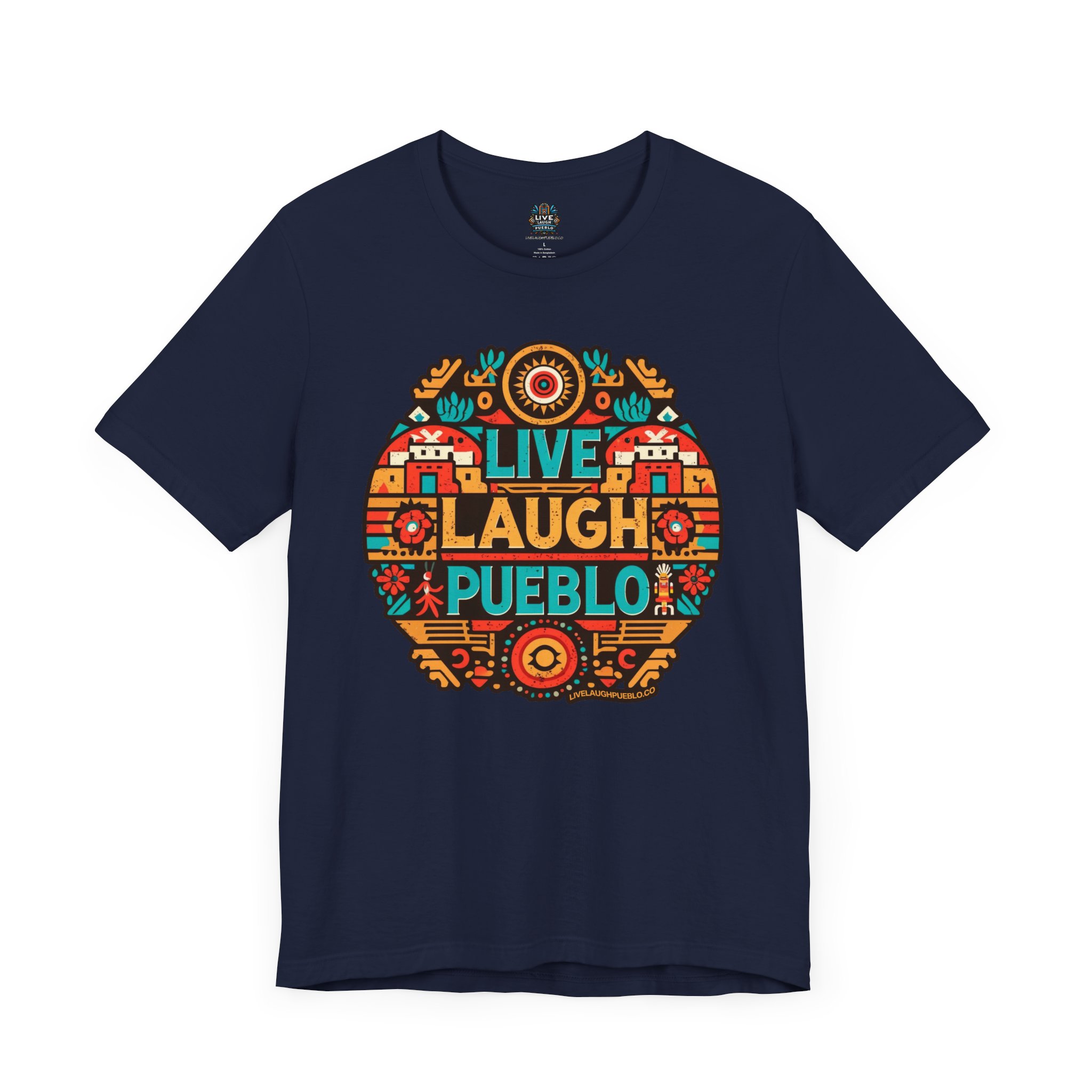 The shirt features a vibrant, circular Southwestern-inspired design centered on the front, with “LIVE LAUGH PUEBLO” text surrounded by stylized Pueblo art motifs. The rich color palette of teal, yellow, orange, and red creates an eye-catching contrast against the red background of the shirt.