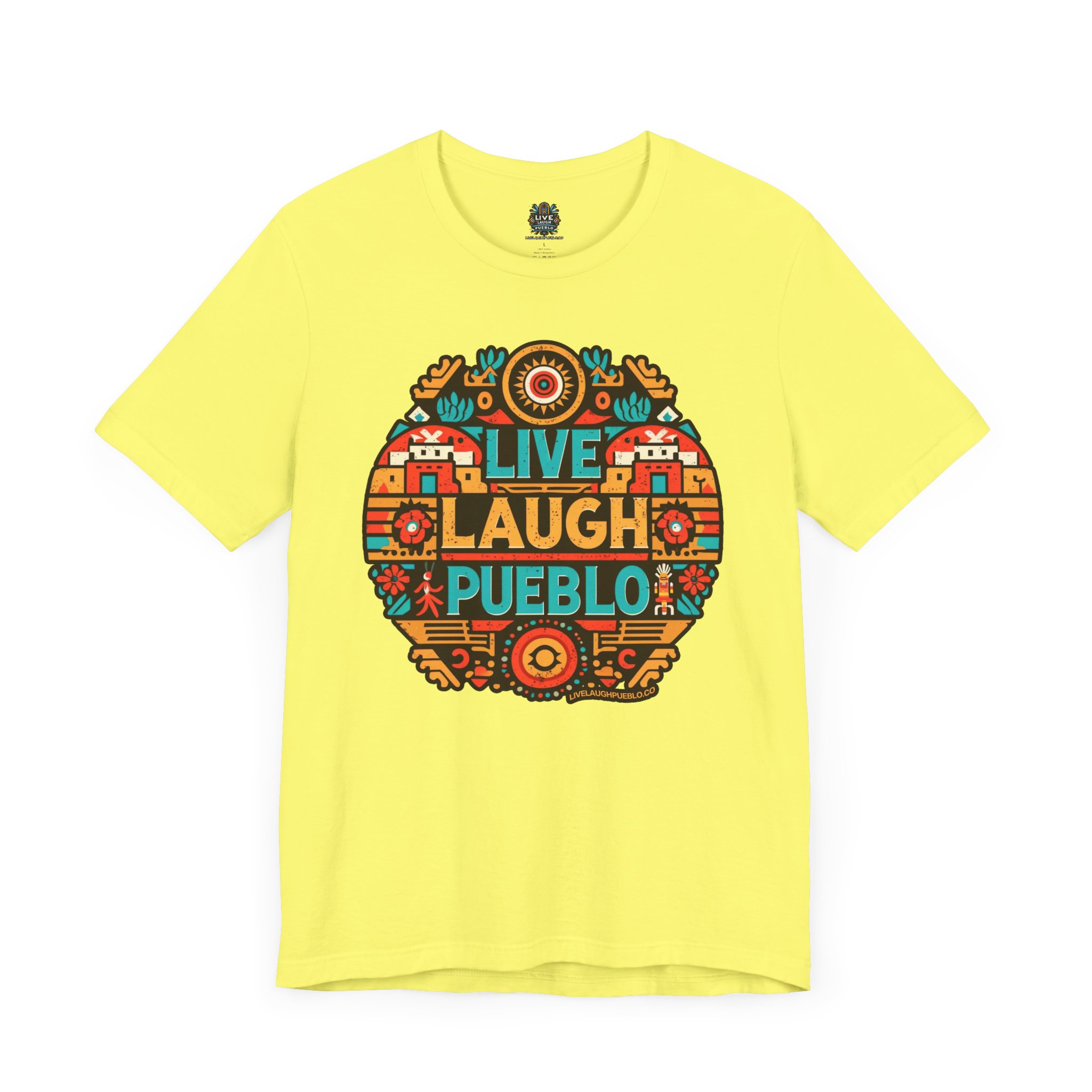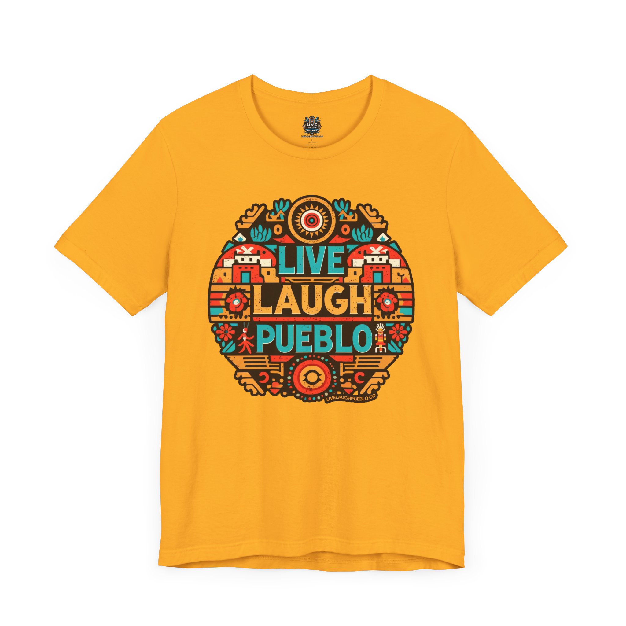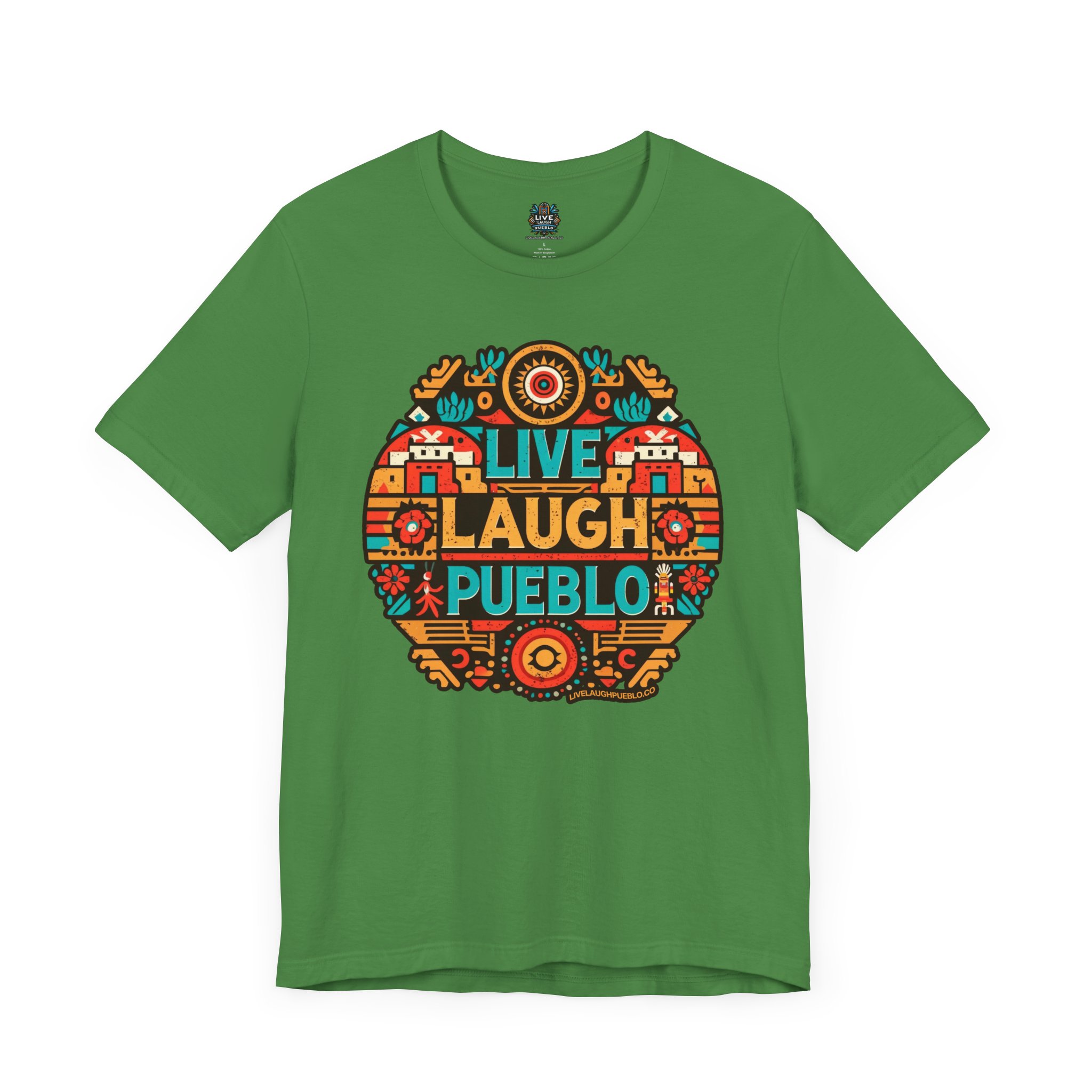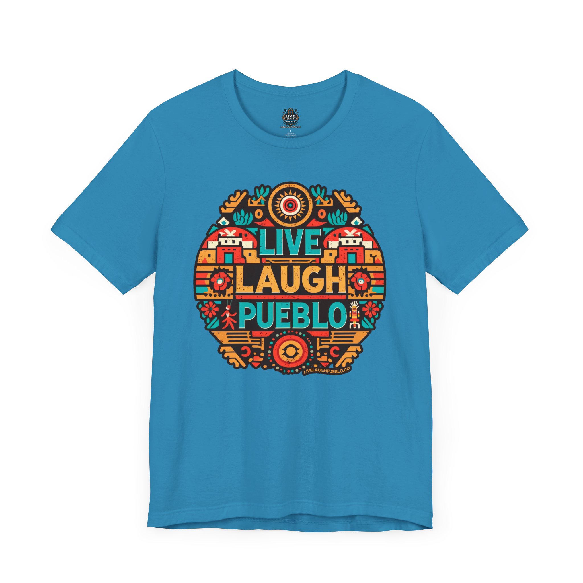 The shirt features a vibrant, circular Southwestern-inspired design centered on the front, with “LIVE LAUGH PUEBLO” text surrounded by stylized Pueblo art motifs. The rich color palette of teal, yellow, orange, and red creates an eye-catching contrast against the red background of the shirt.