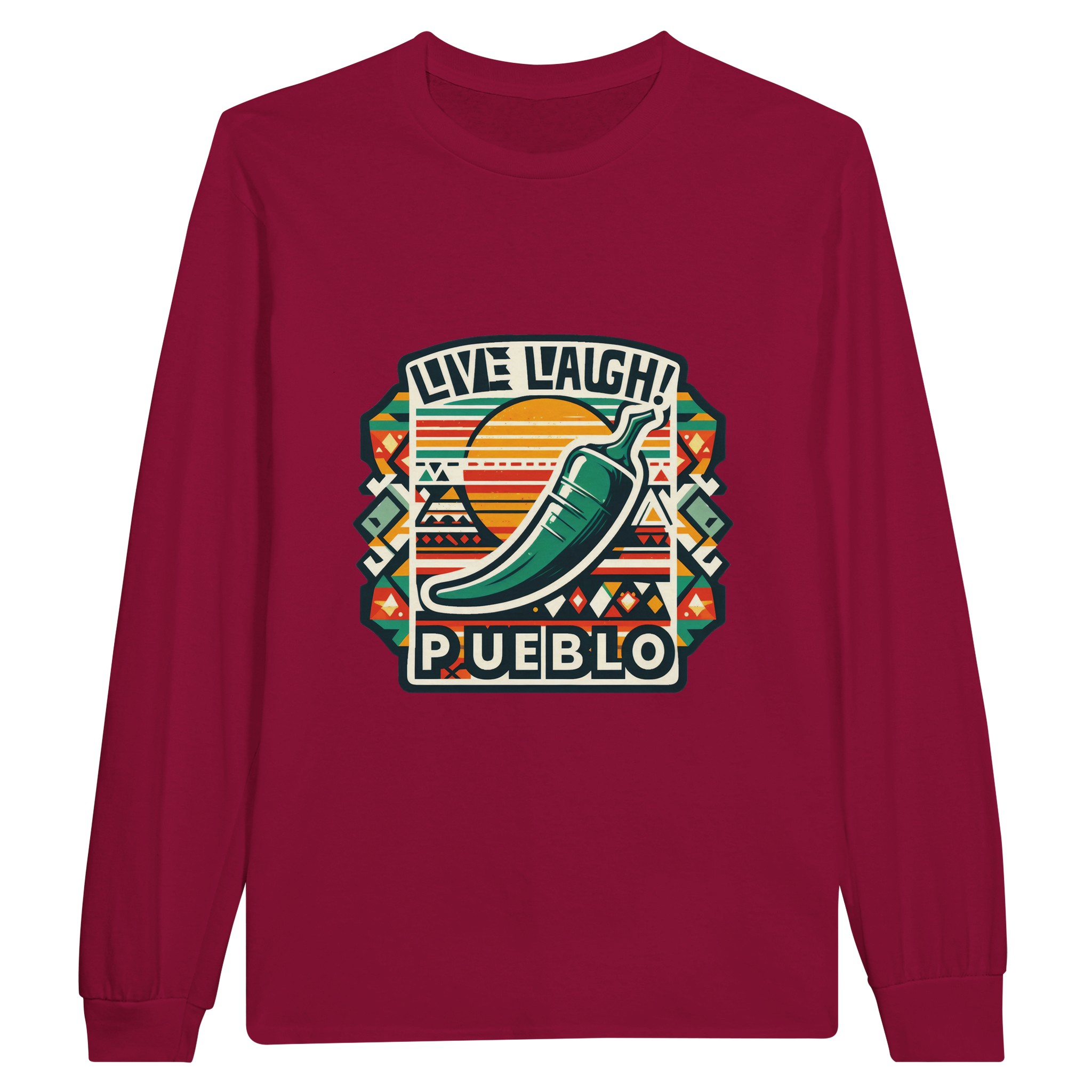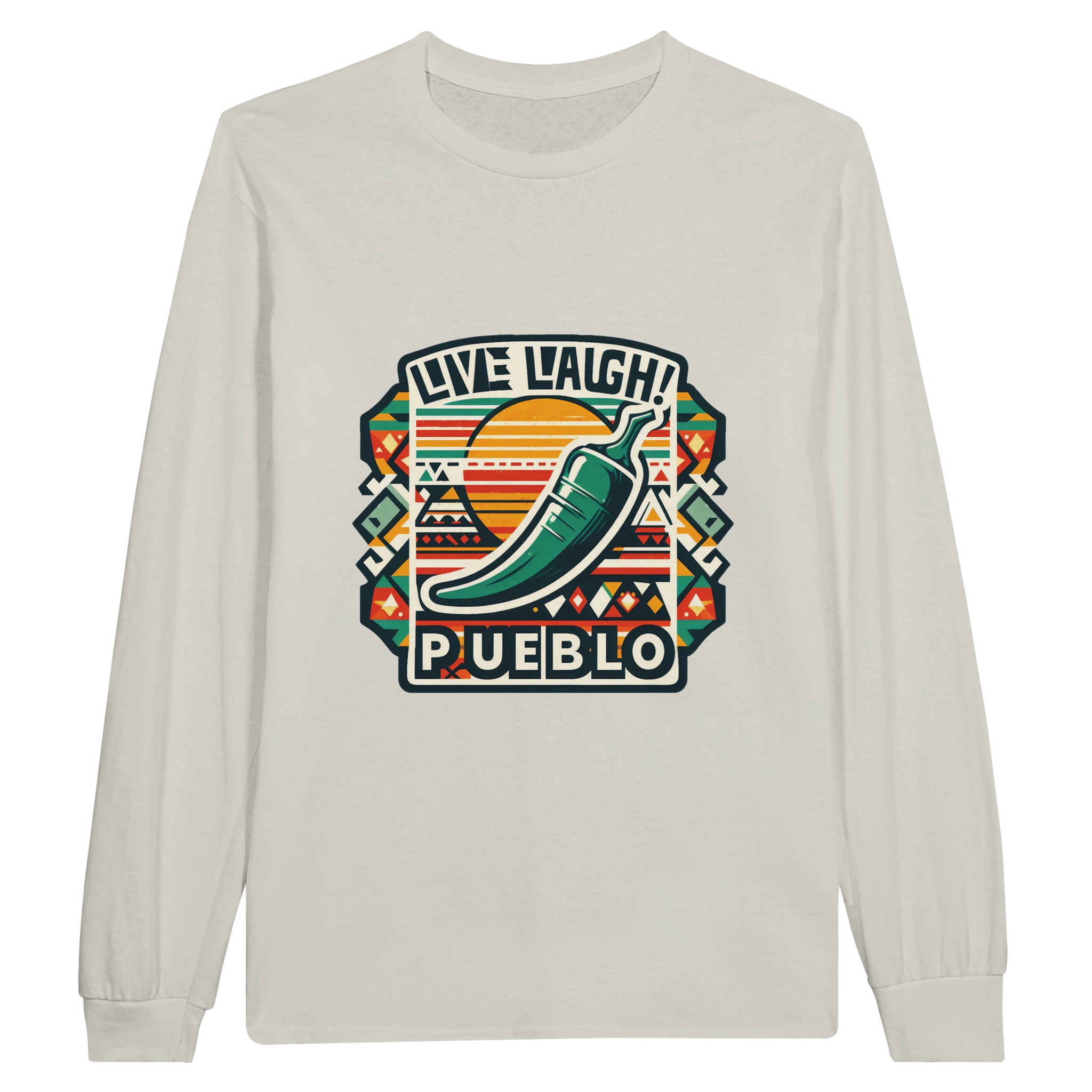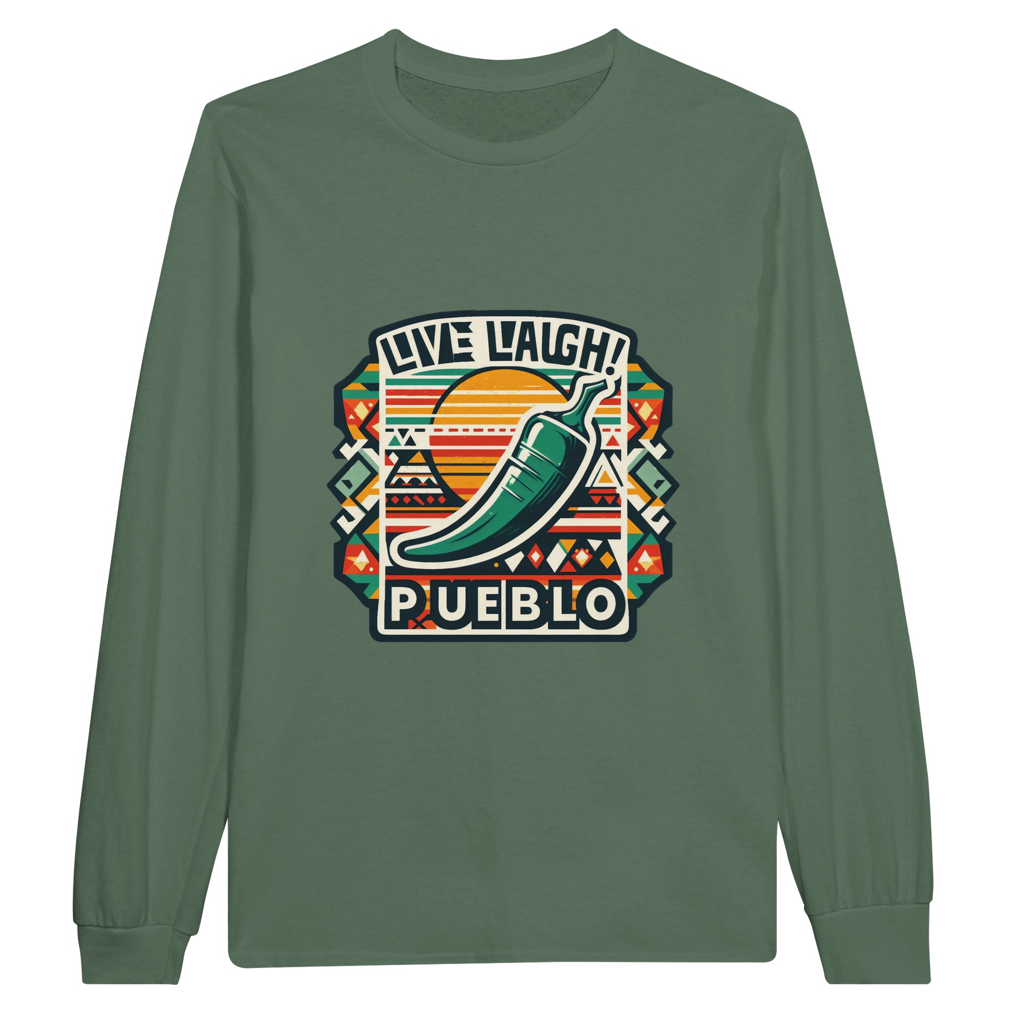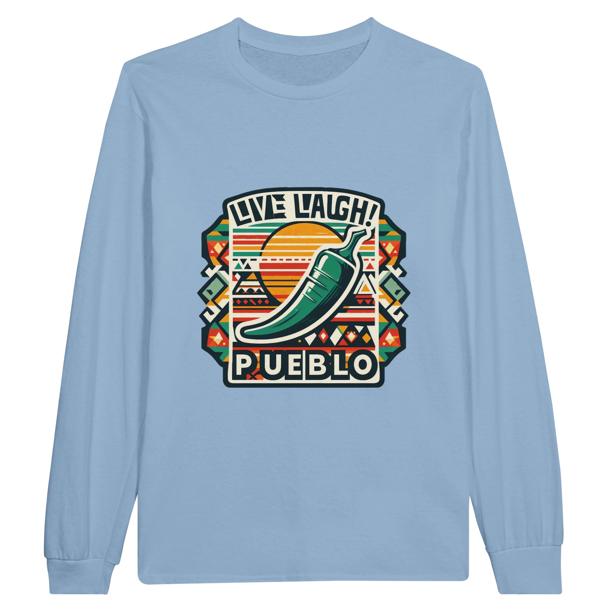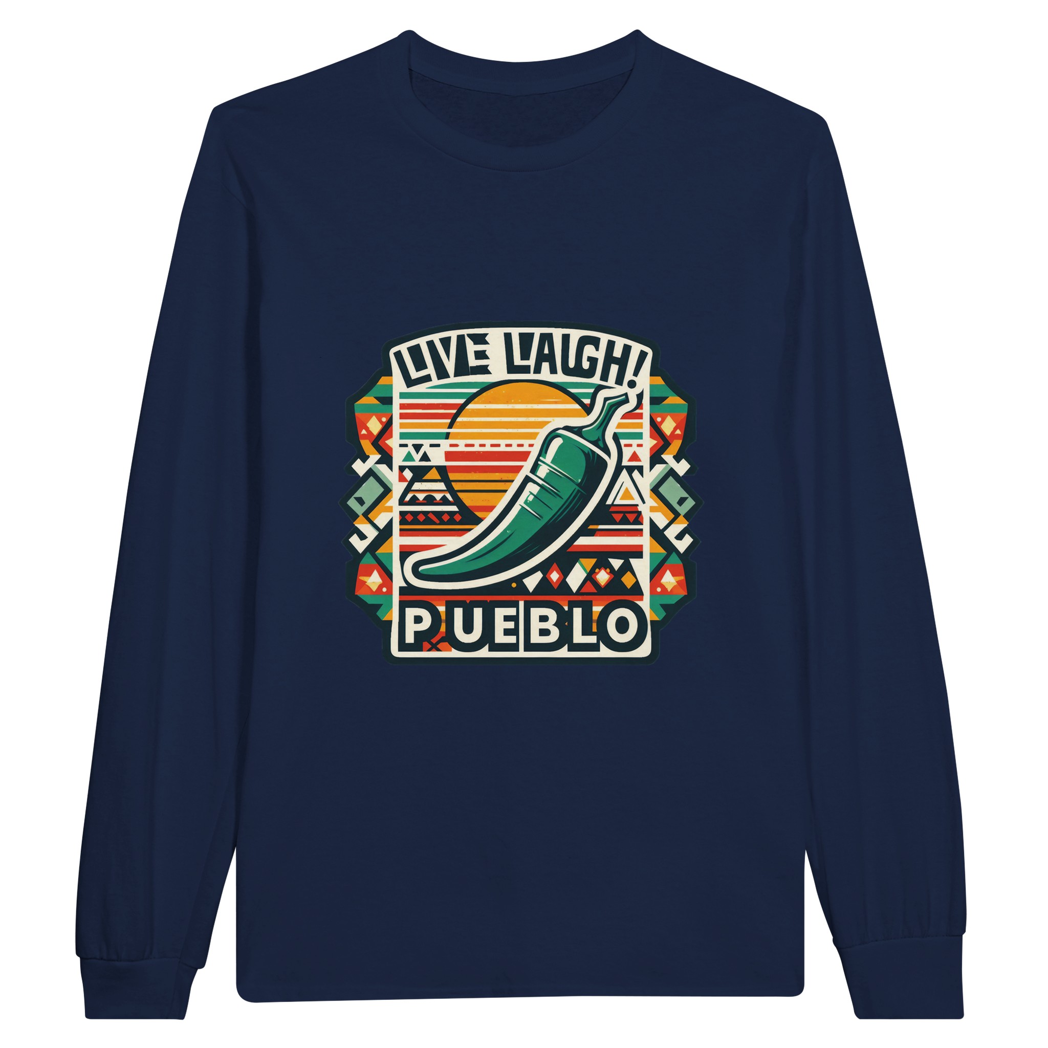 Embrace the vibrant spirit of the Southwest with our ‘Live Laugh Pueblo’ Classic Unisex Long sleeve T-shirt. This eye-catching design features a bold green chile pepper set against a backdrop of colorful Aztec-inspired patterns, perfectly capturing the essence of Pueblo culture and the laid-back ‘Live Laugh’ lifestyle.