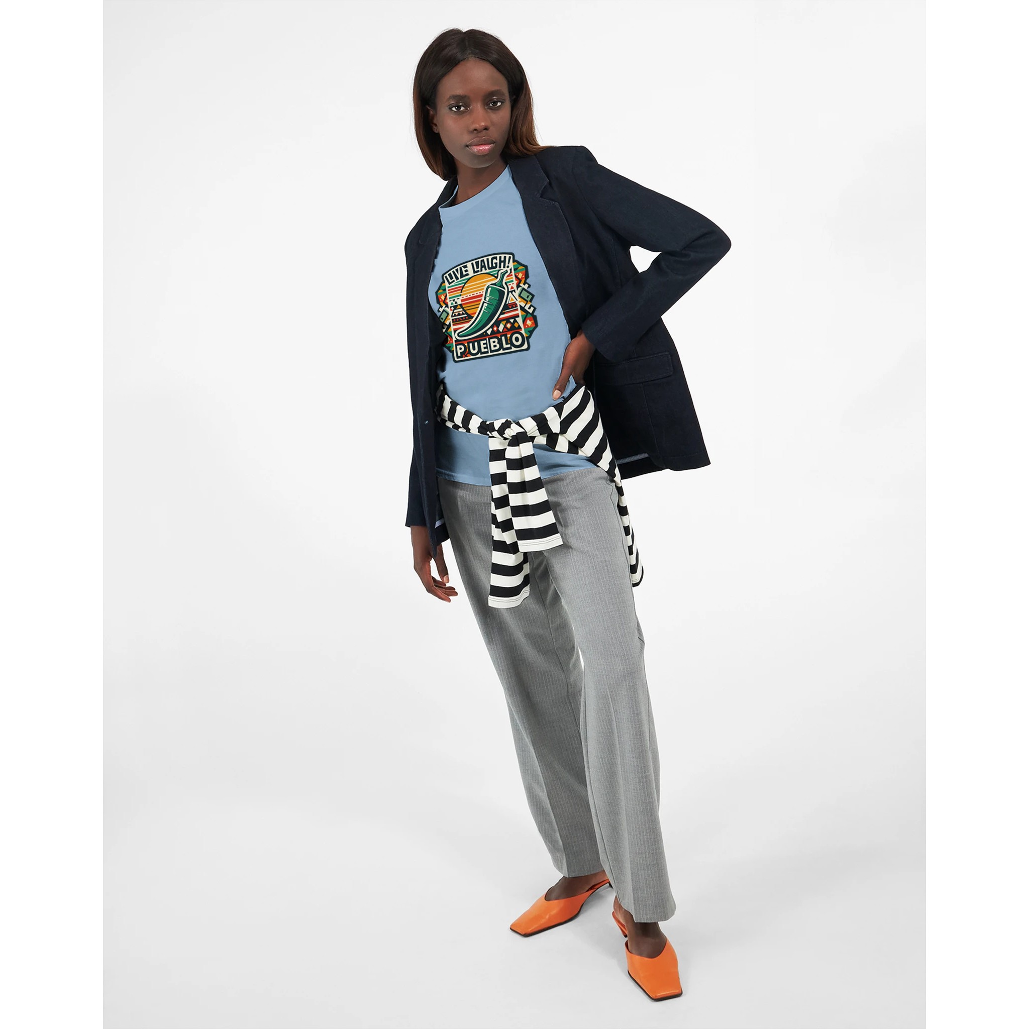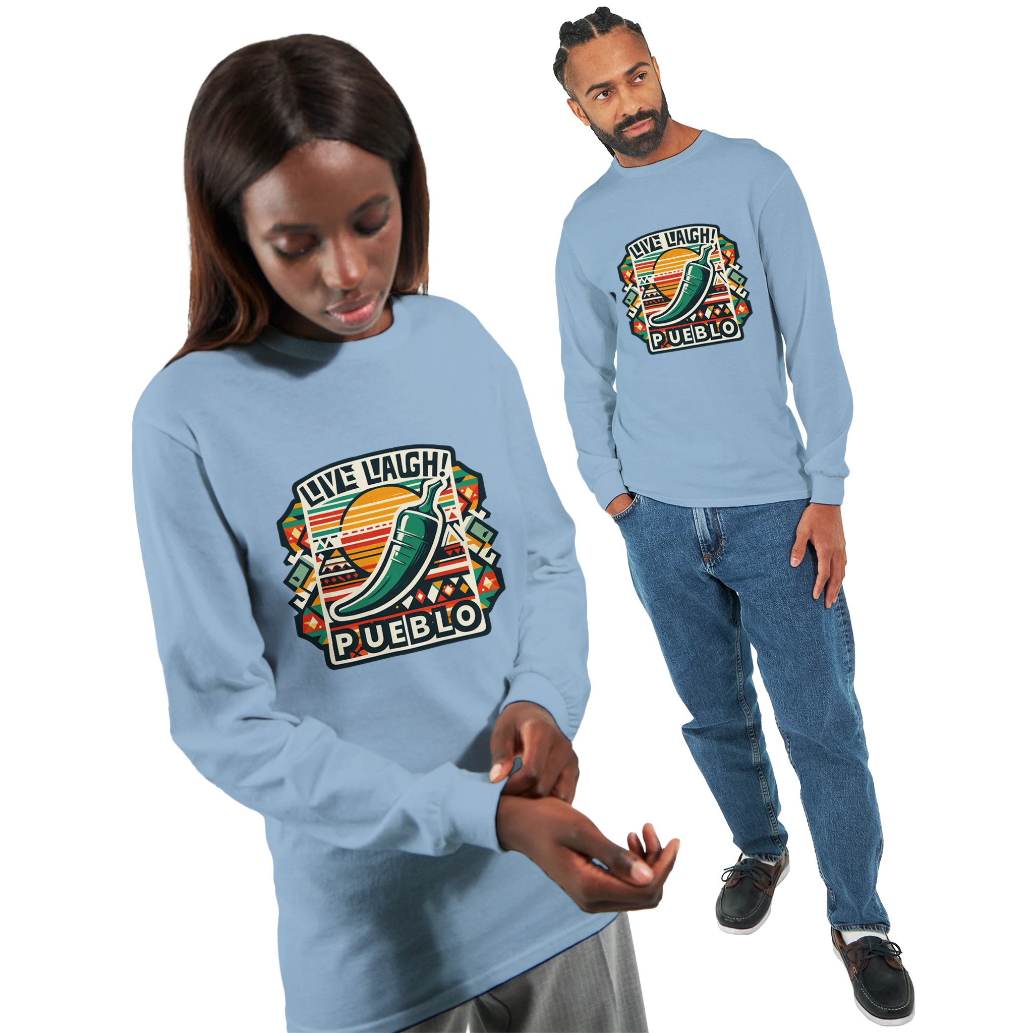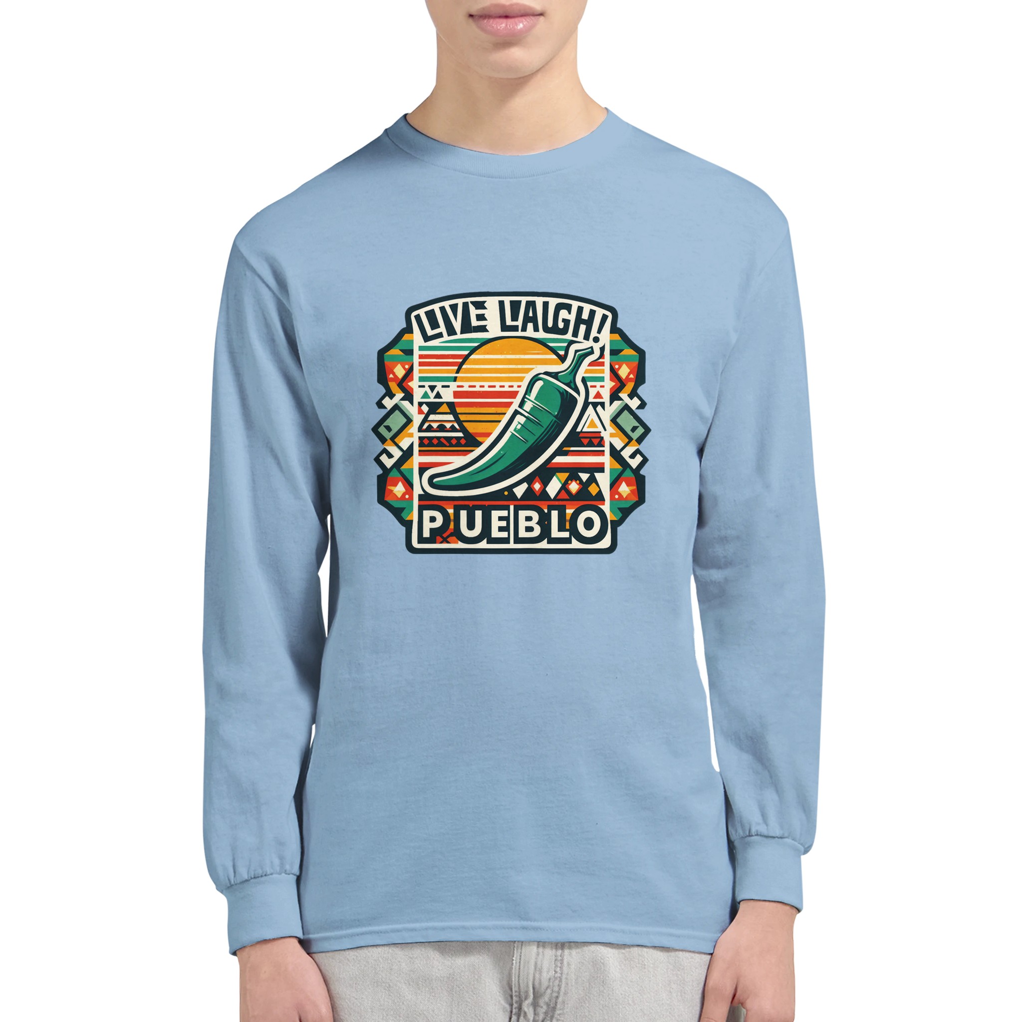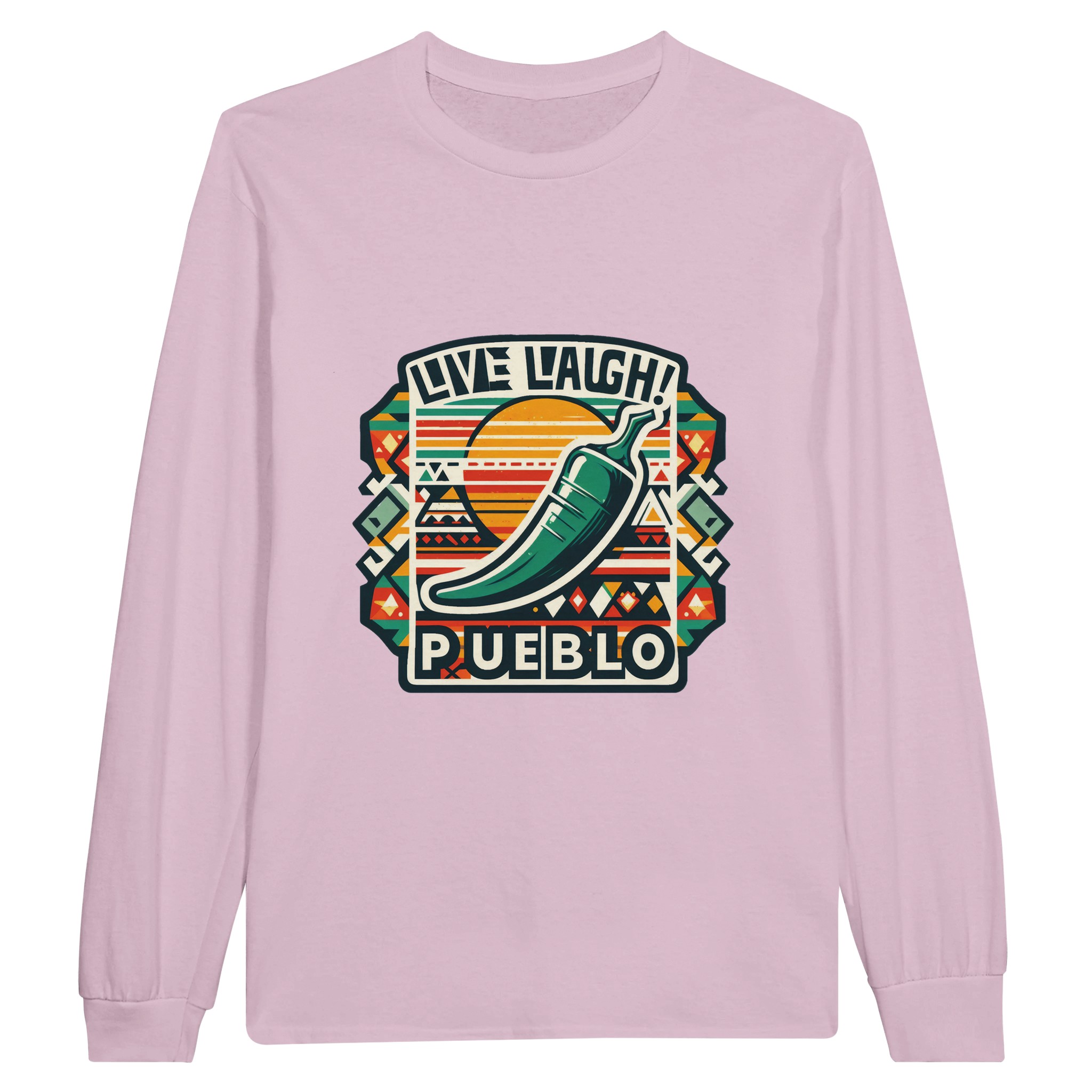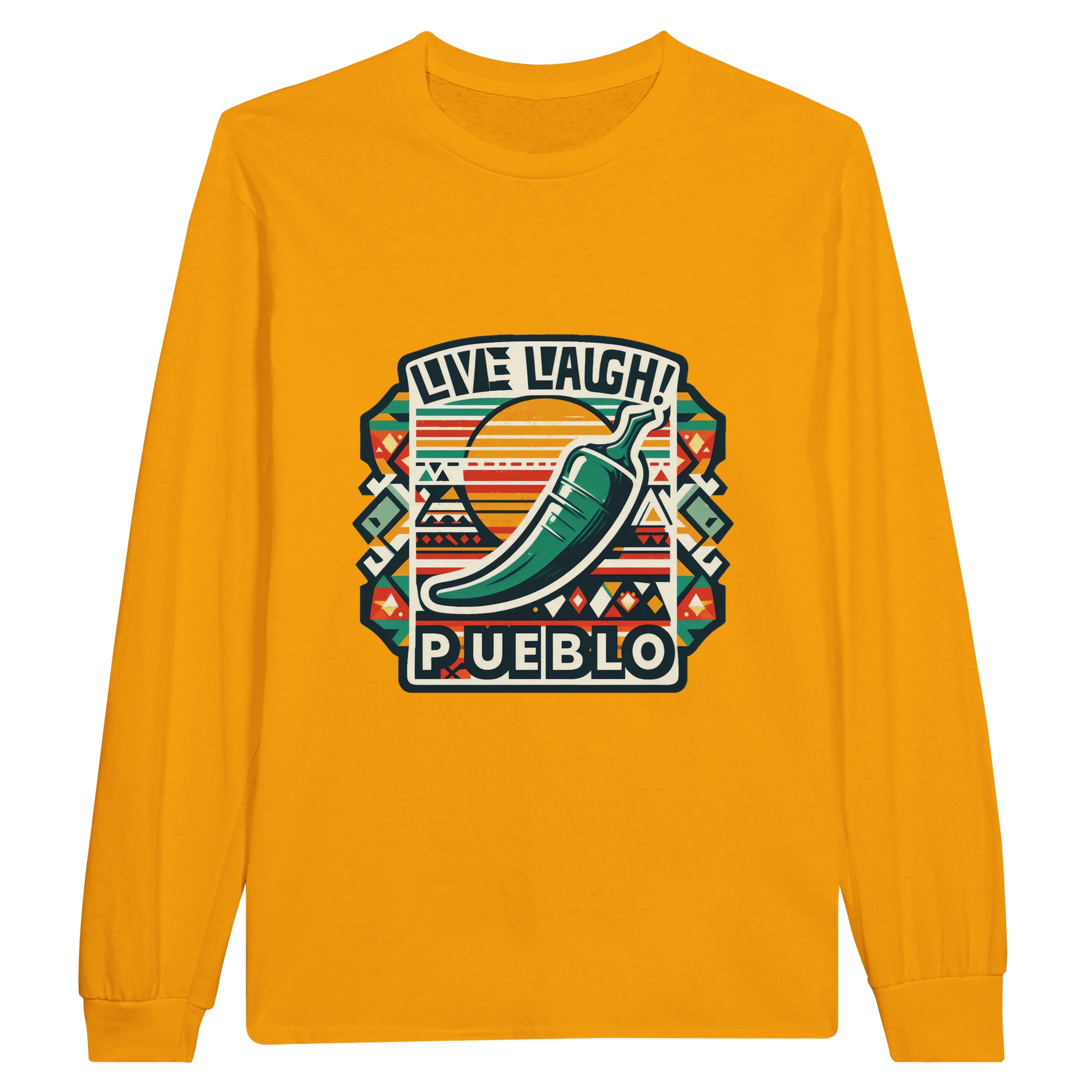Embrace the vibrant spirit of the Southwest with our ‘Live Laugh Pueblo’ Classic Unisex Long sleeve T-shirt. This eye-catching design features a bold green chile pepper set against a backdrop of colorful Aztec-inspired patterns, perfectly capturing the essence of Pueblo culture and the laid-back ‘Live Laugh’ lifestyle.