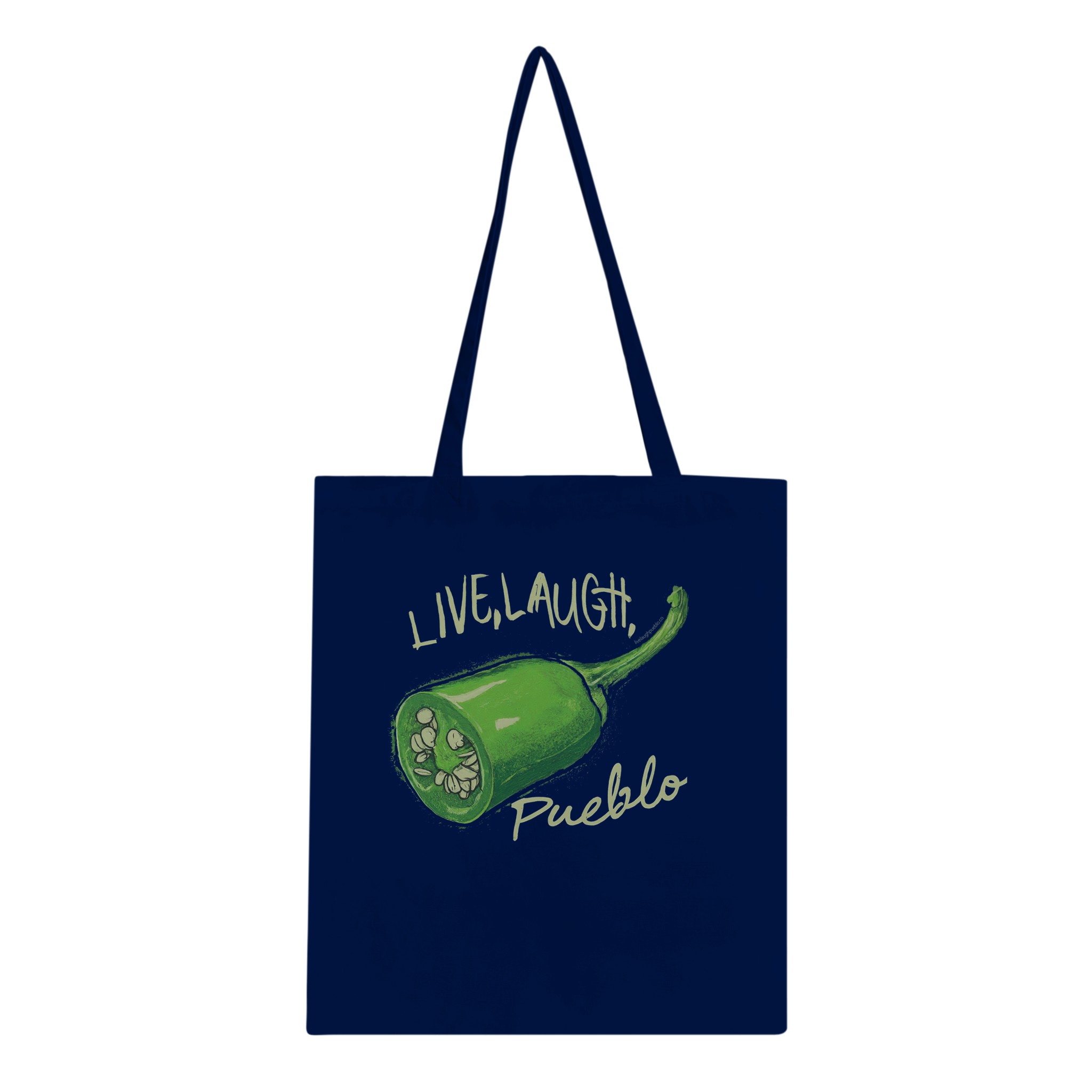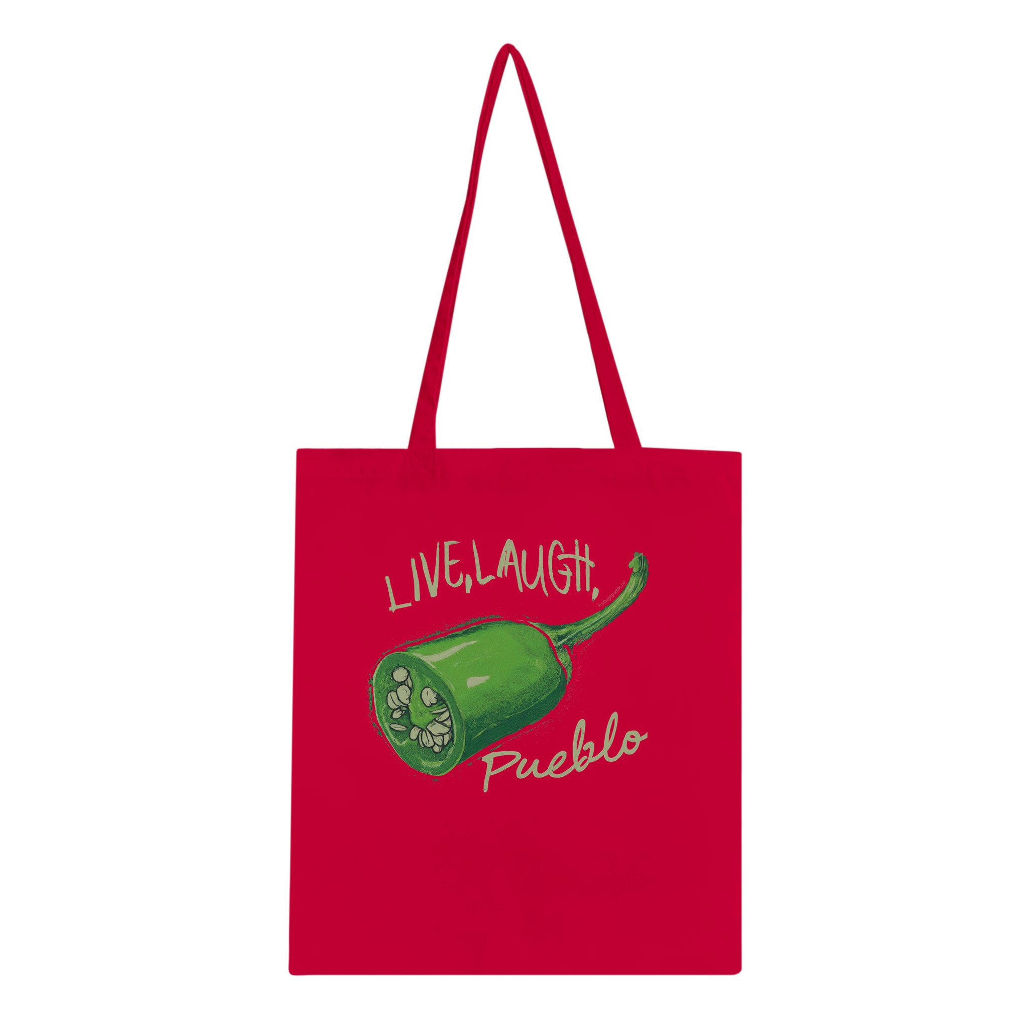 Carry a slice of Southwestern flavor with our “Live, Laugh, Pueblo” Classic Tote Bag featuring a vibrant green chile pepper design. This eye-catching bag combines humor and local pride, perfect for chile lovers and Pueblo enthusiasts alike.