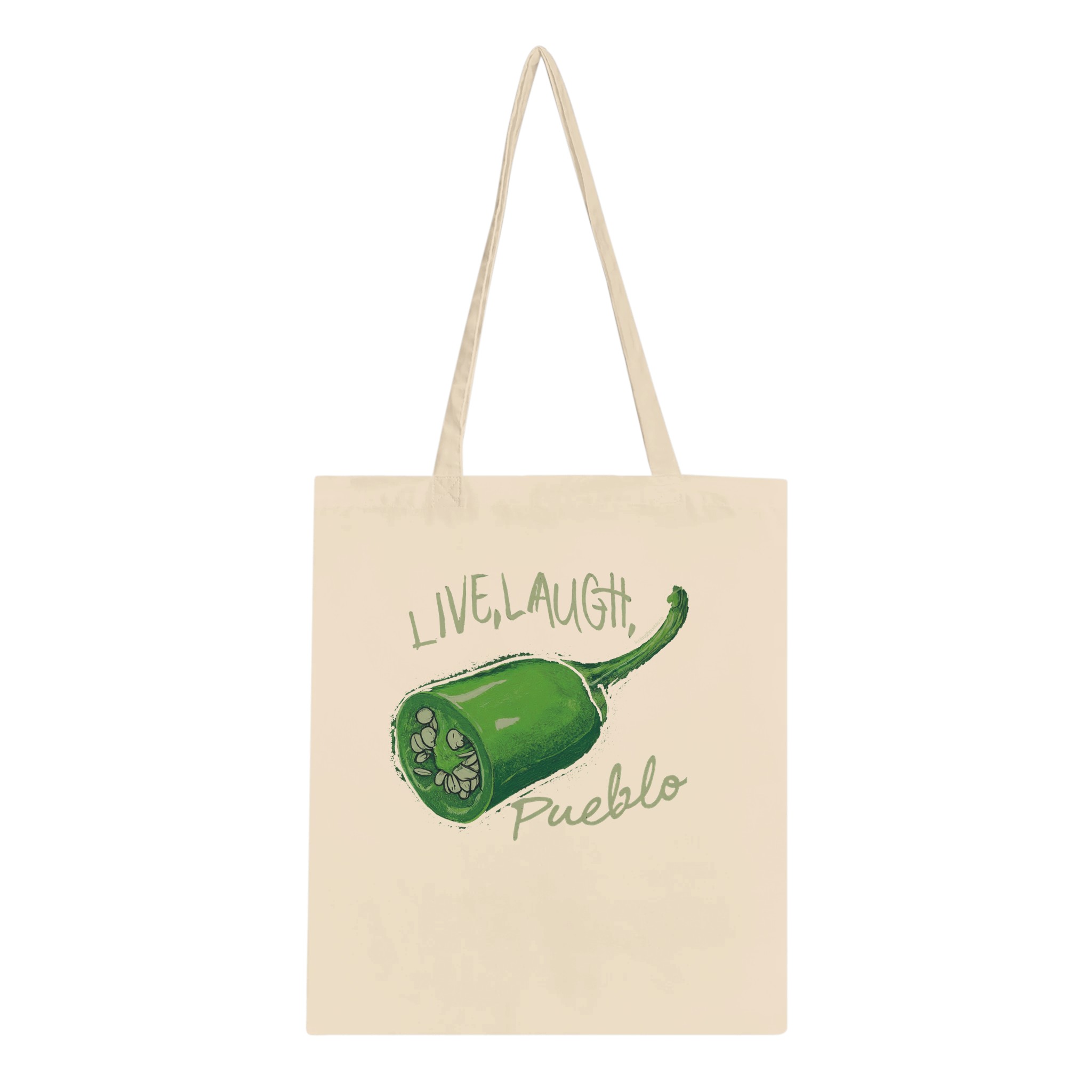Spice up your accessories and show off your love for green chiles with this witty and practical “Live, Laugh, Pueblo” tote bag!