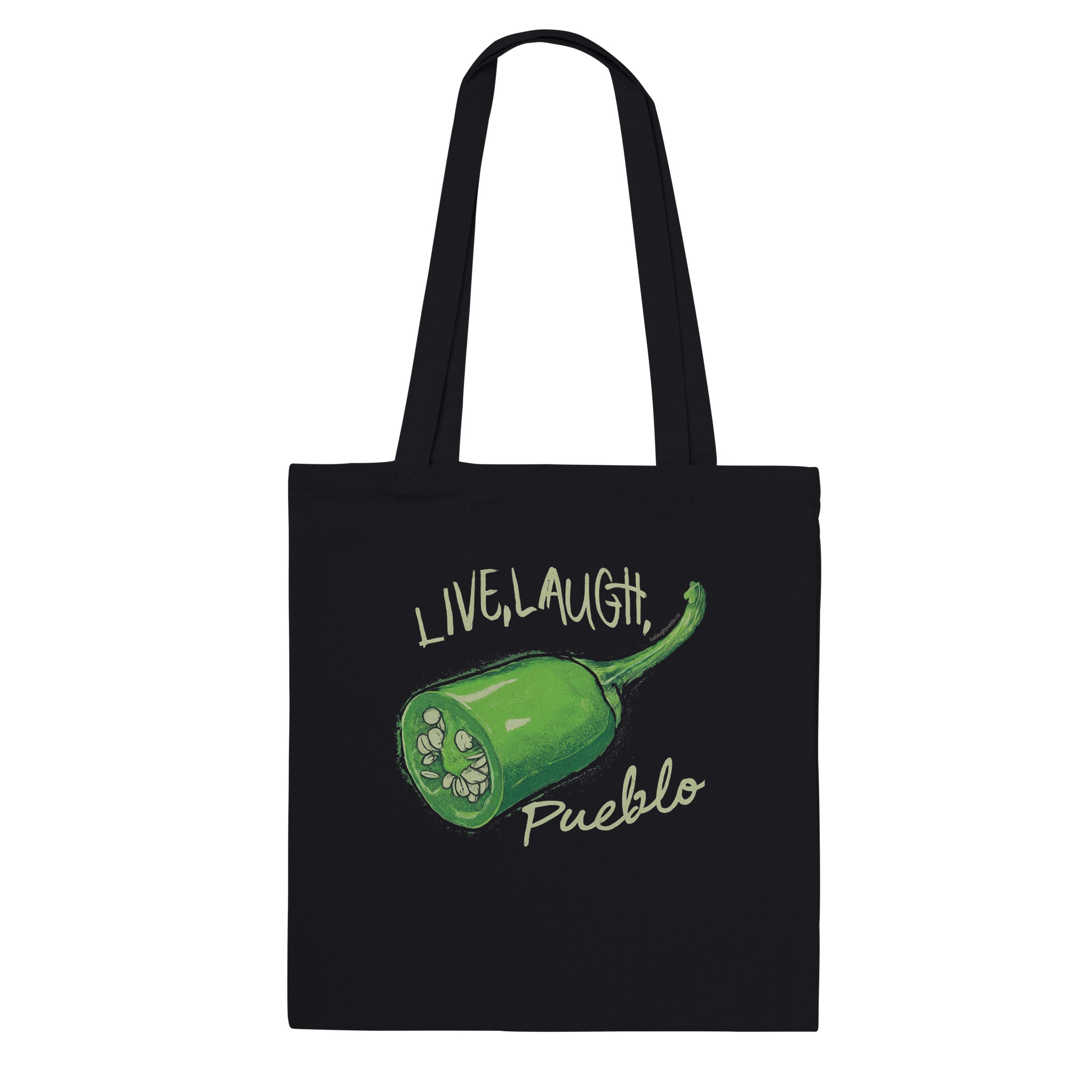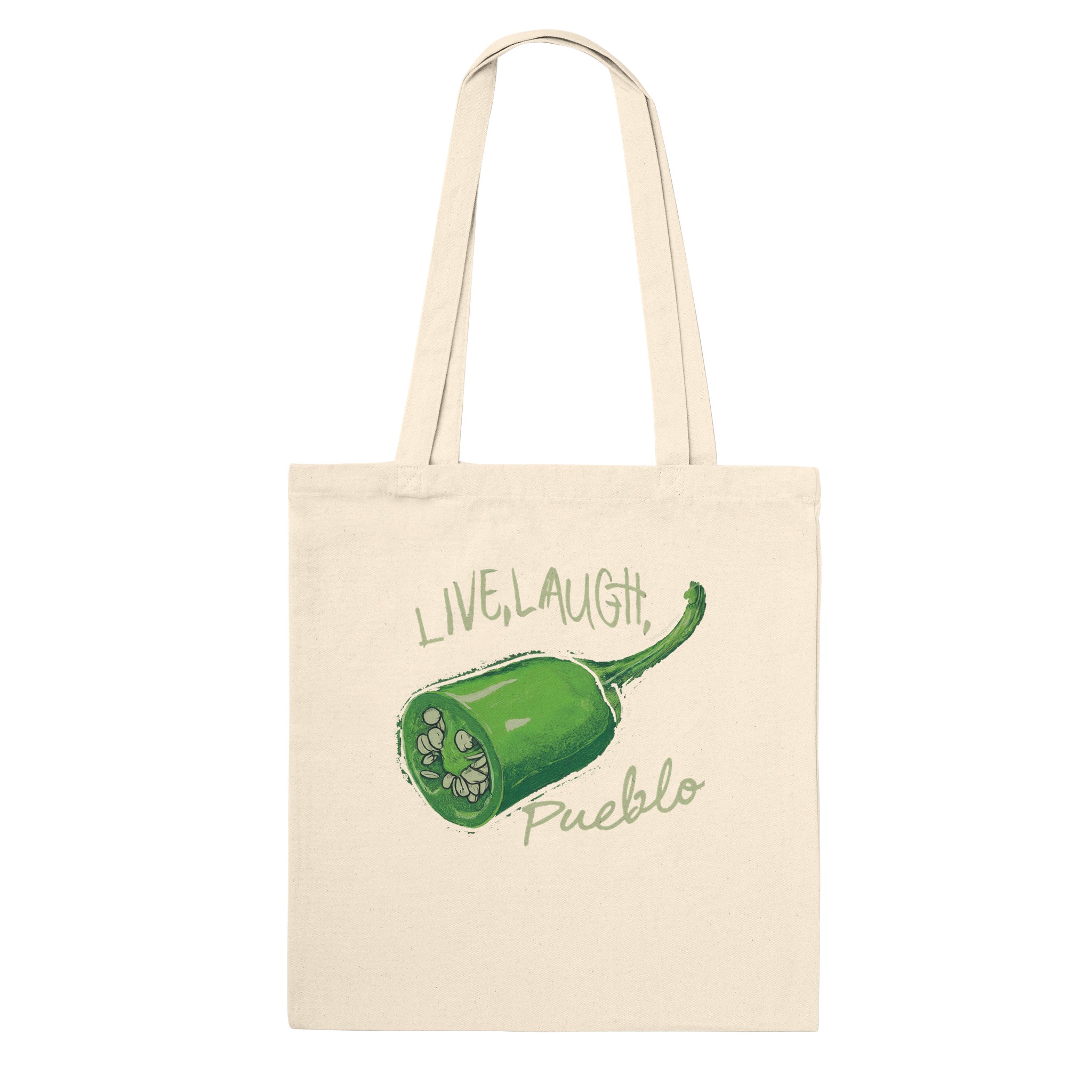 Carry a slice of Southwestern flavor with our “Live, Laugh, Pueblo” Premium Tote Bag featuring a vibrant green chile pepper design. This eye-catching bag combines humor and local pride, perfect for chile lovers and Pueblo enthusiasts alike.