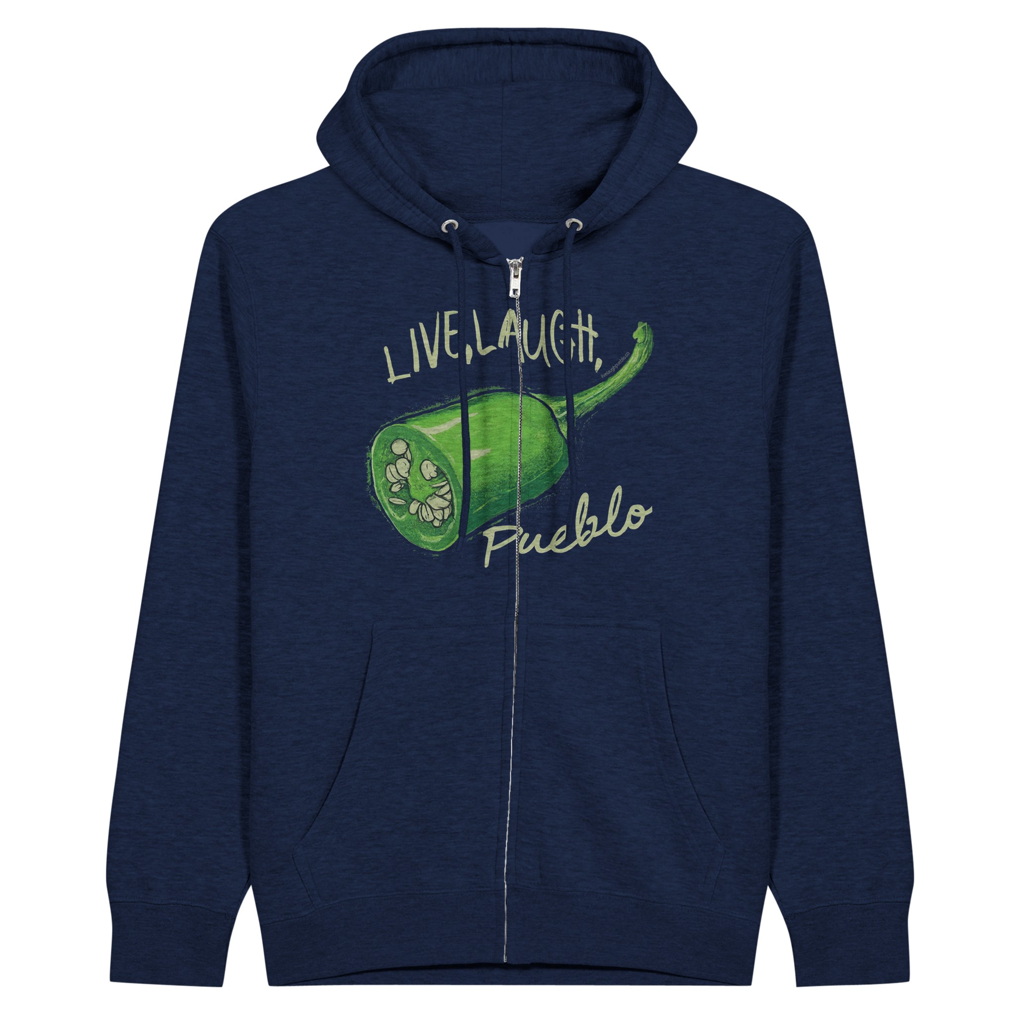 Embrace the zesty spirit of Pueblo with our “Live, Laugh, Pueblo” Premium Unisex Zip Hoodie! This eye-catching design features a vibrant green chile pepper, cleverly illustrated to showcase its seeds in a cross-section view. The playful text “LIVE, LAUGH,” arches over the chile, with “Pueblo” written below, creating a fun twist on the popular phrase that celebrates local flavor.