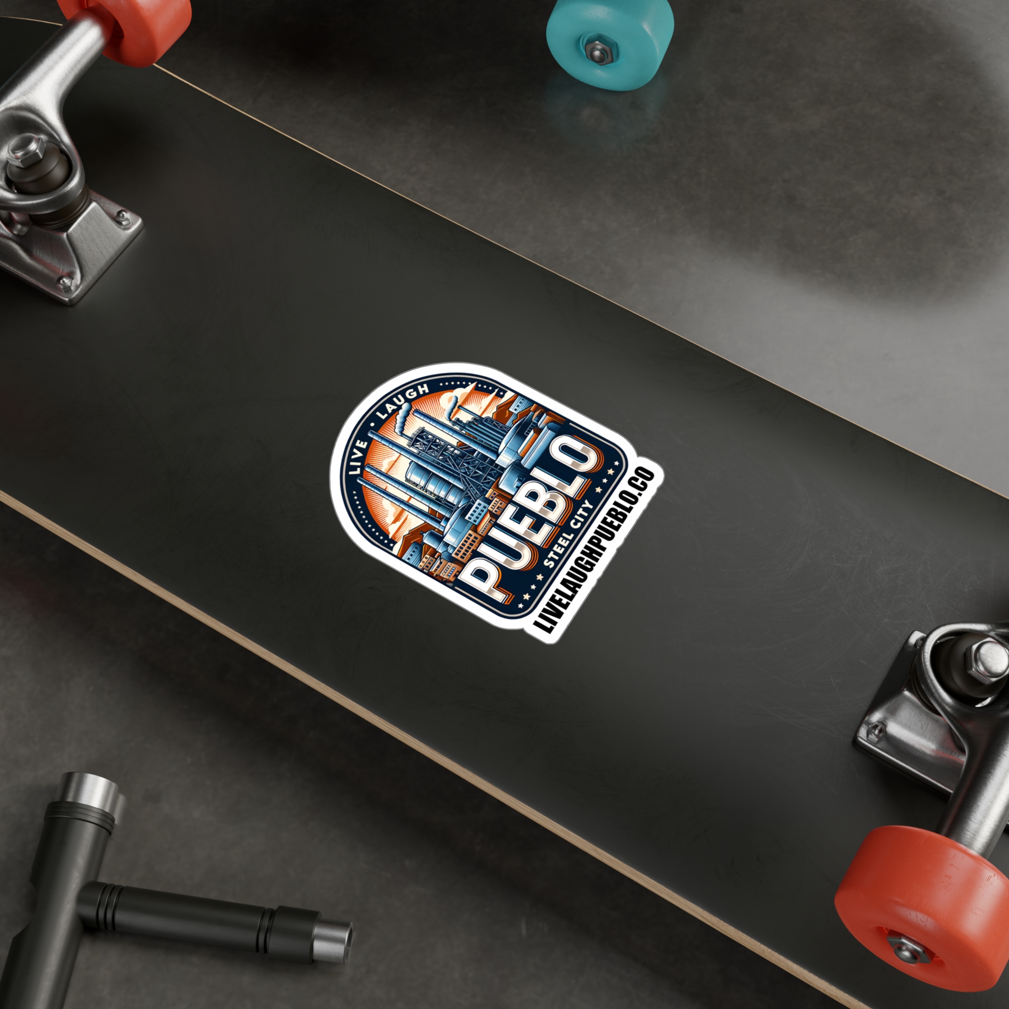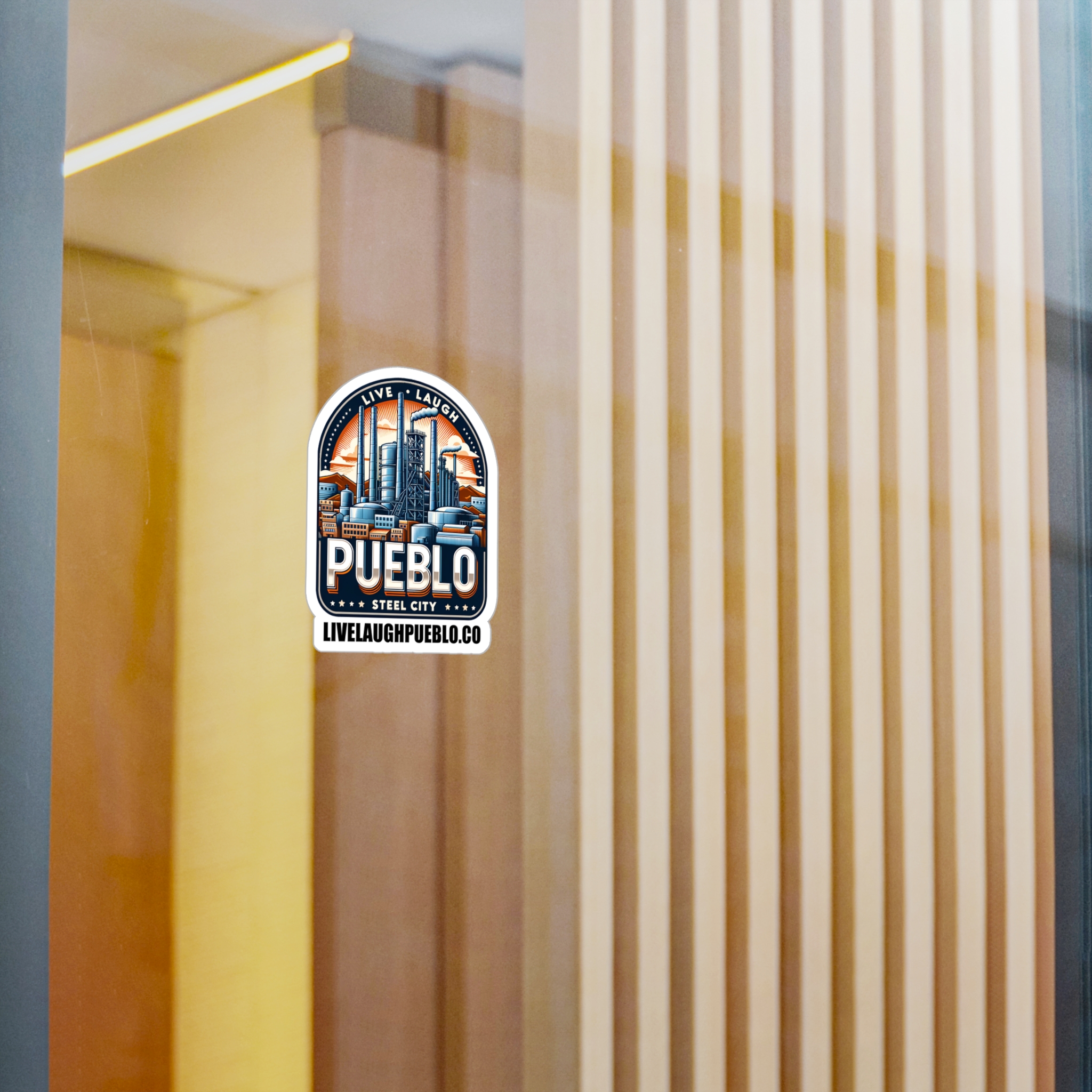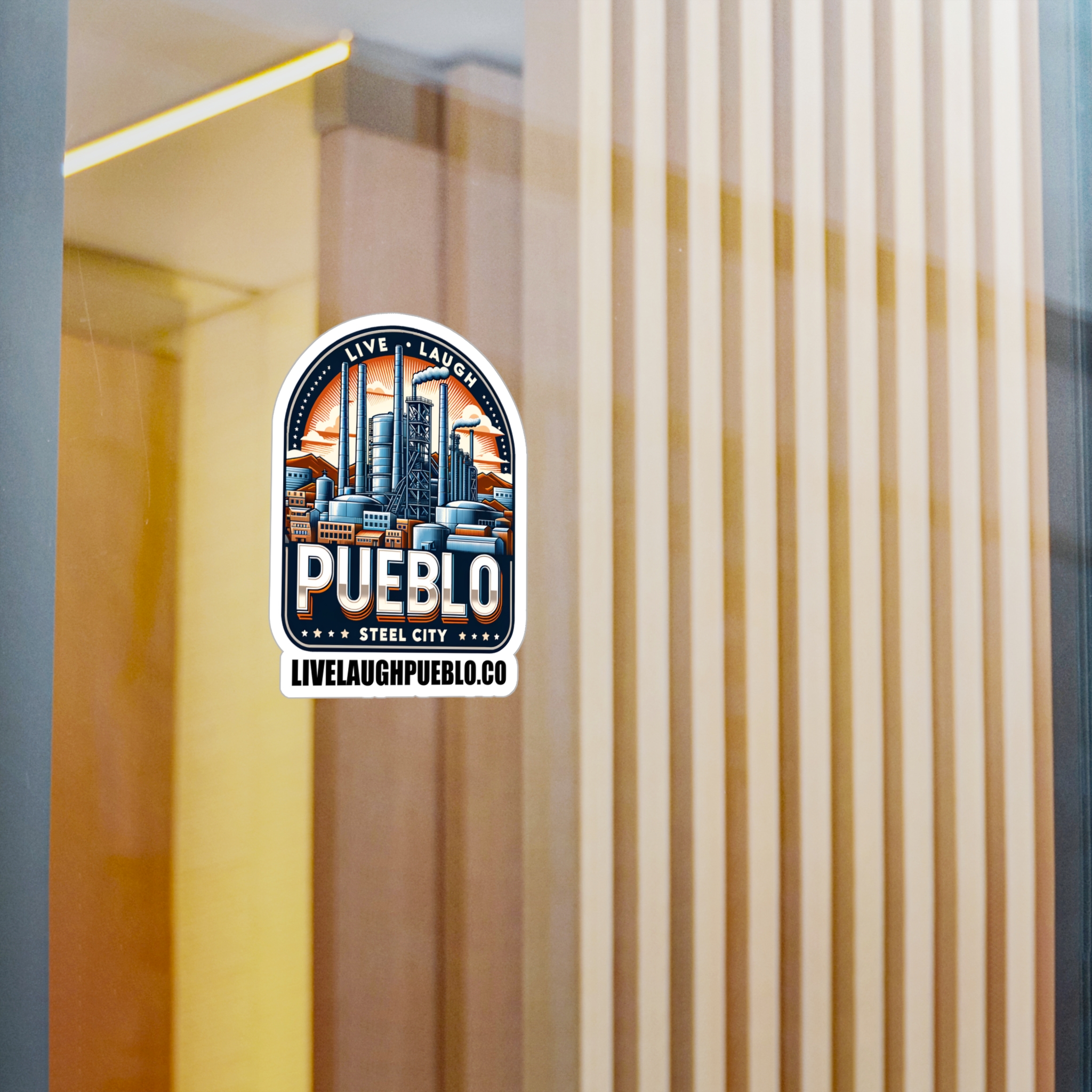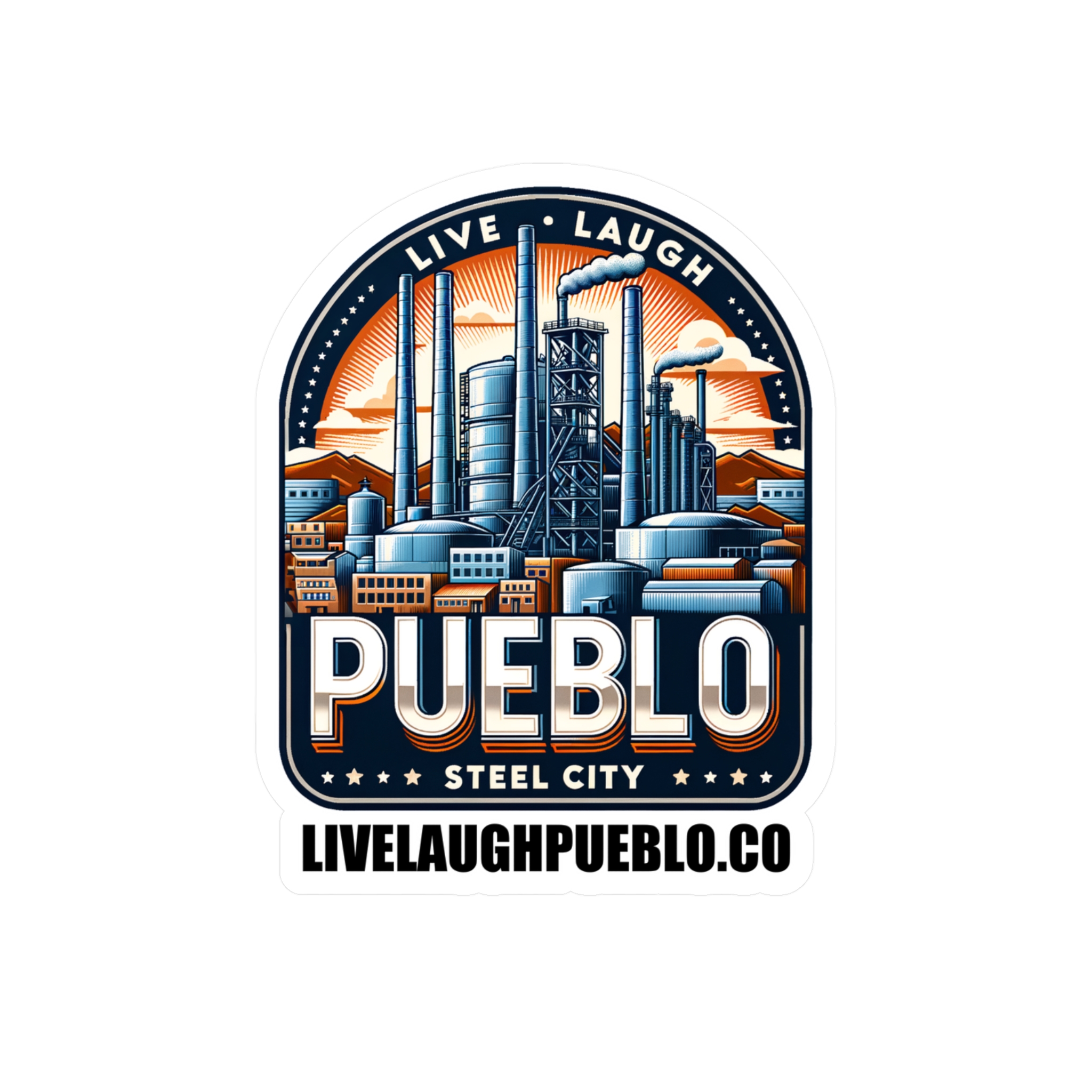 Live Laugh Pueblo! Steel City Vinyl Decal | Industrial Skyline Sticker | Colorado Mountain Sunset Souvenir