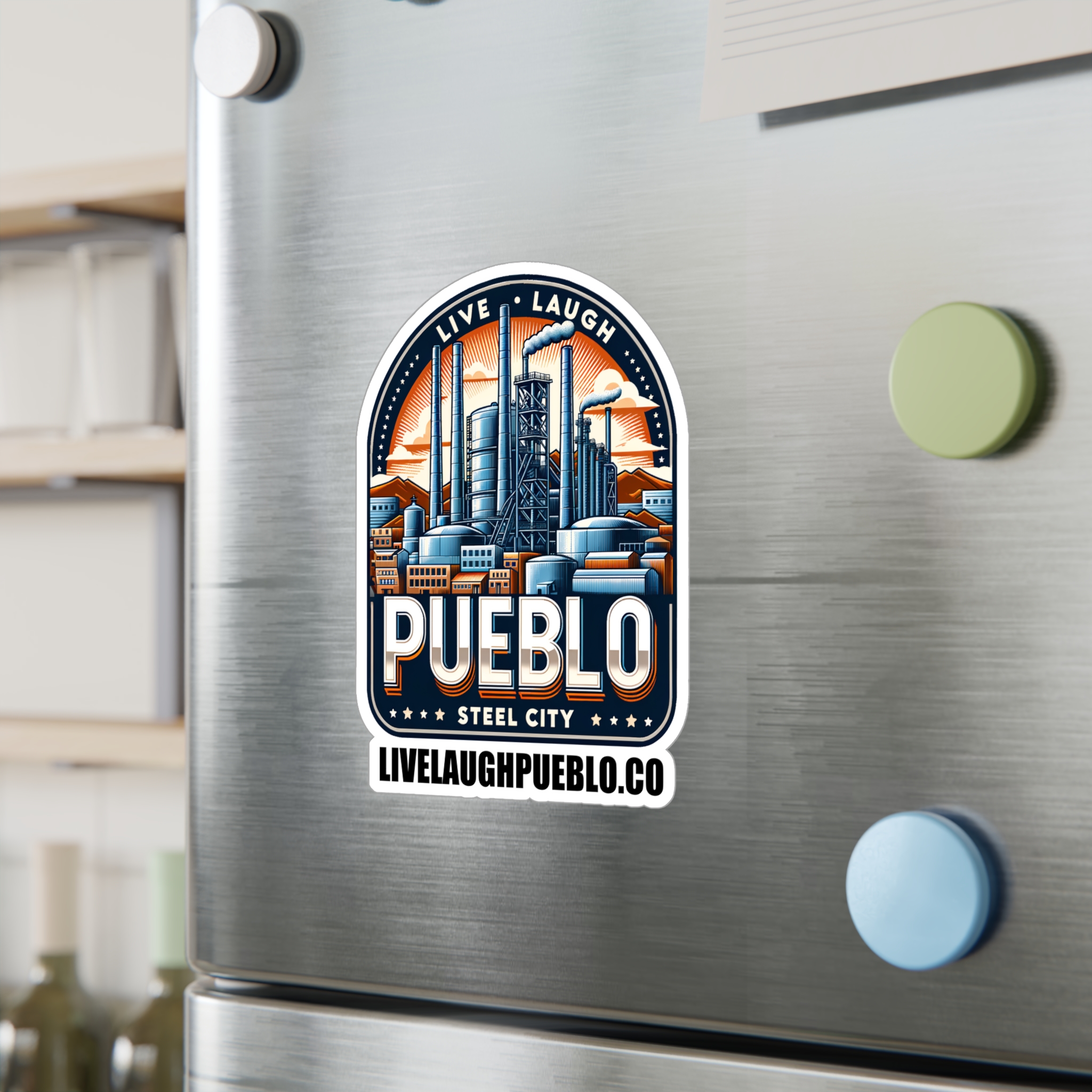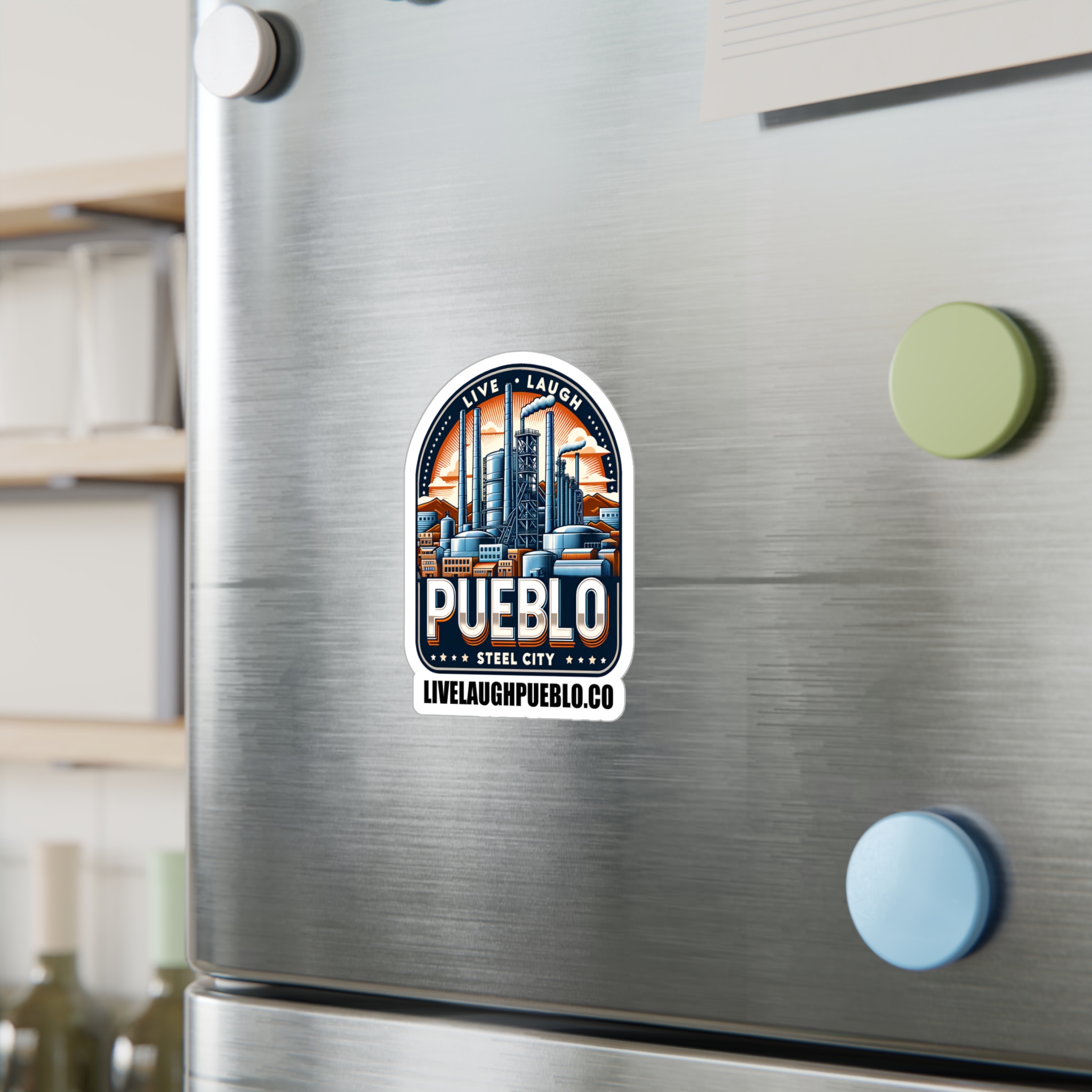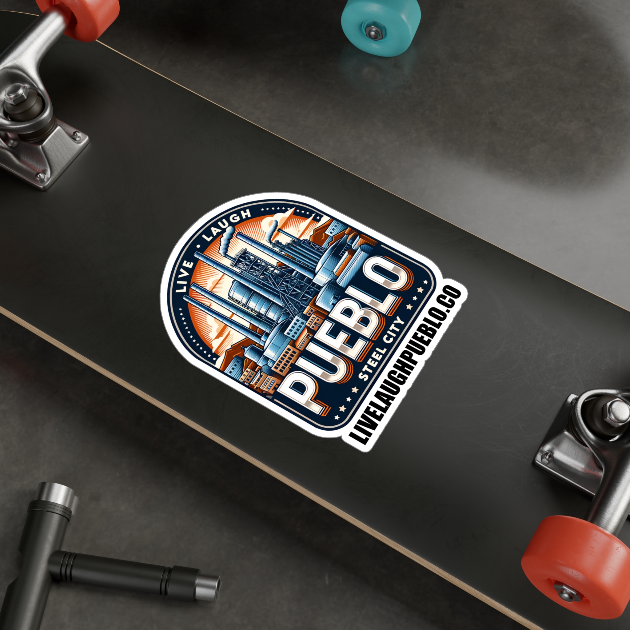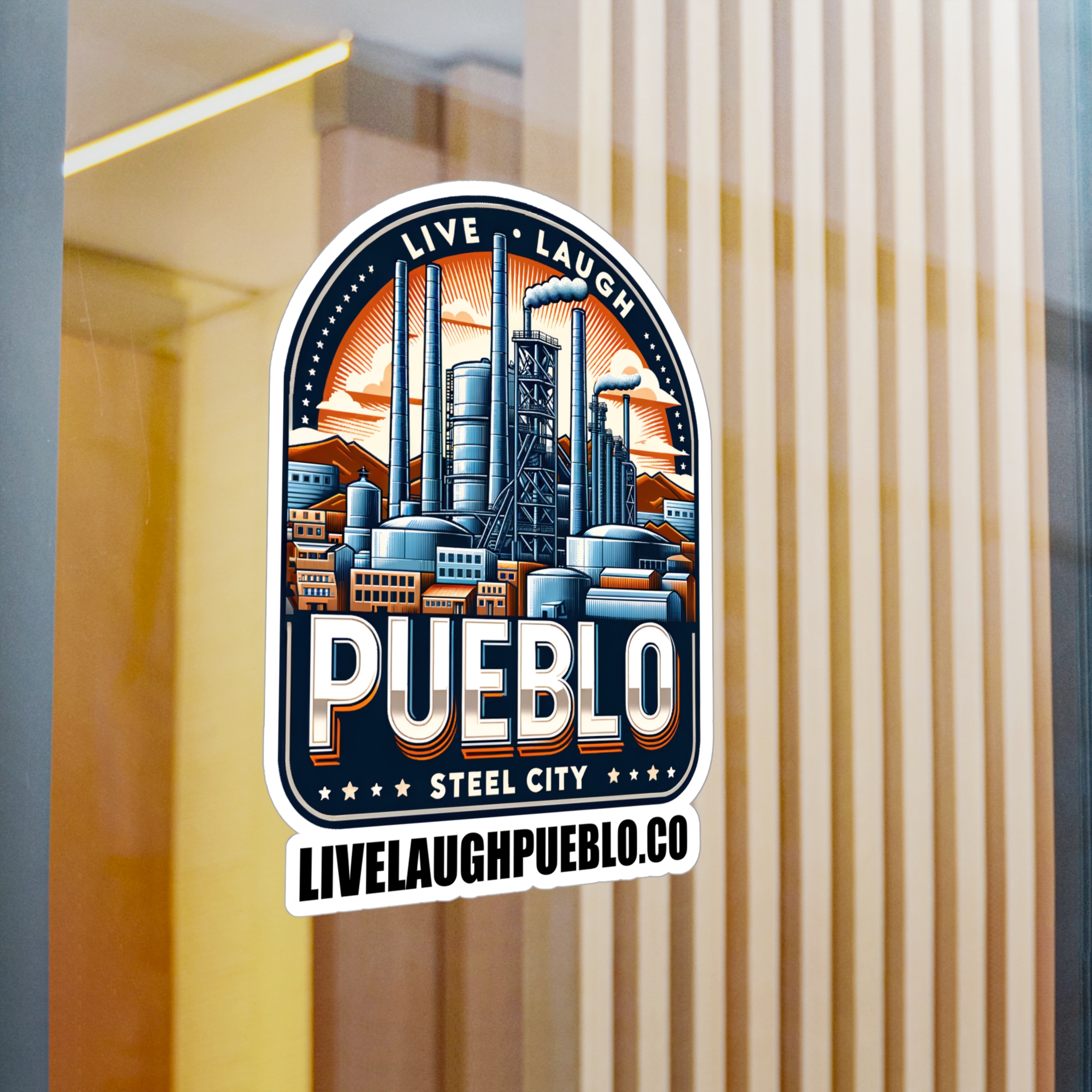 Live Laugh Pueblo! Steel City Vinyl Decal | Industrial Skyline Sticker | Colorado Mountain Sunset Souvenir