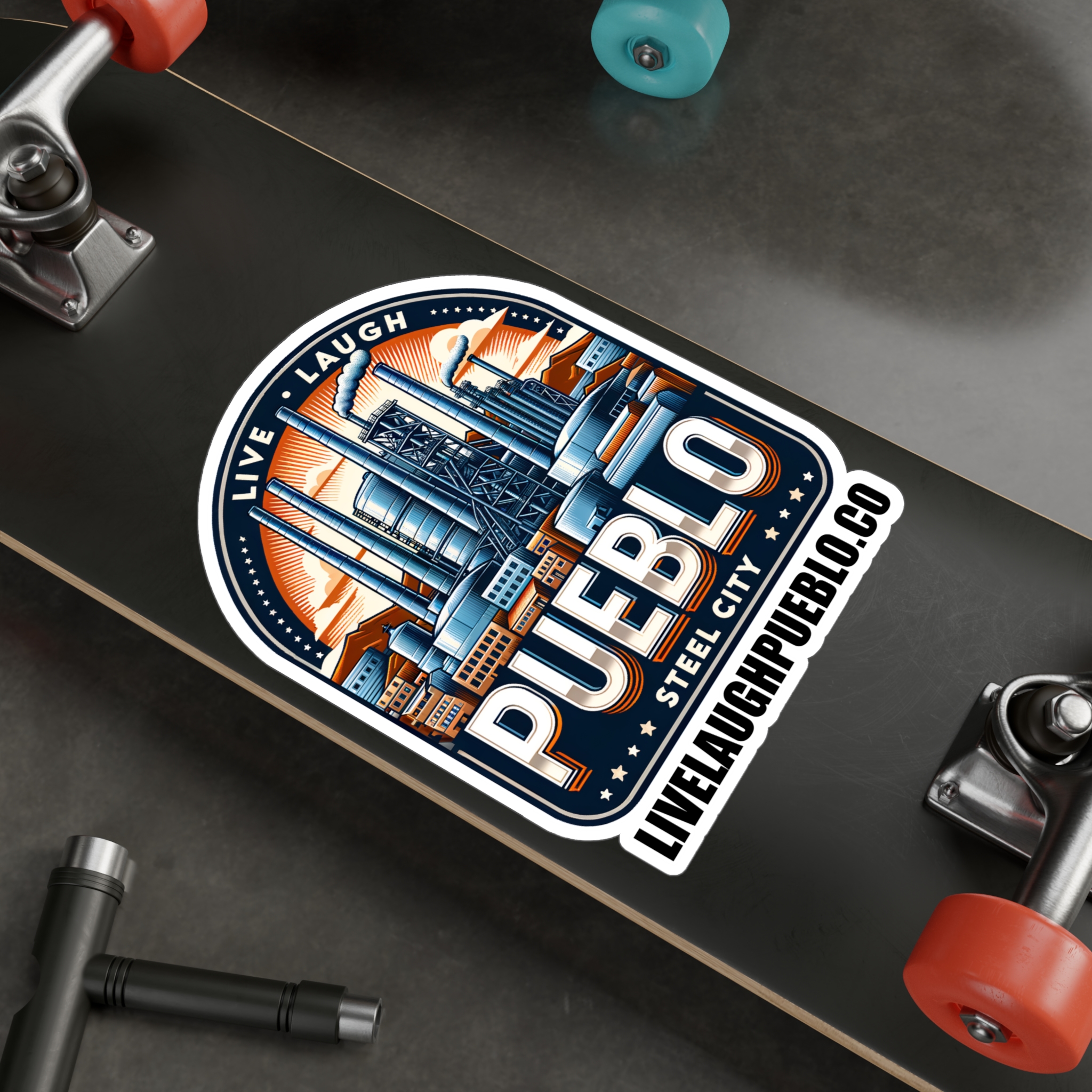 Celebrate the industrial heritage of Pueblo, Colorado with this eye-catching ‘Live Laugh Pueblo’ Steel City vinyl decal! Perfect for locals and visitors alike, this high-quality sticker showcases Pueblo’s iconic industrial skyline in a vibrant, retro-inspired design.