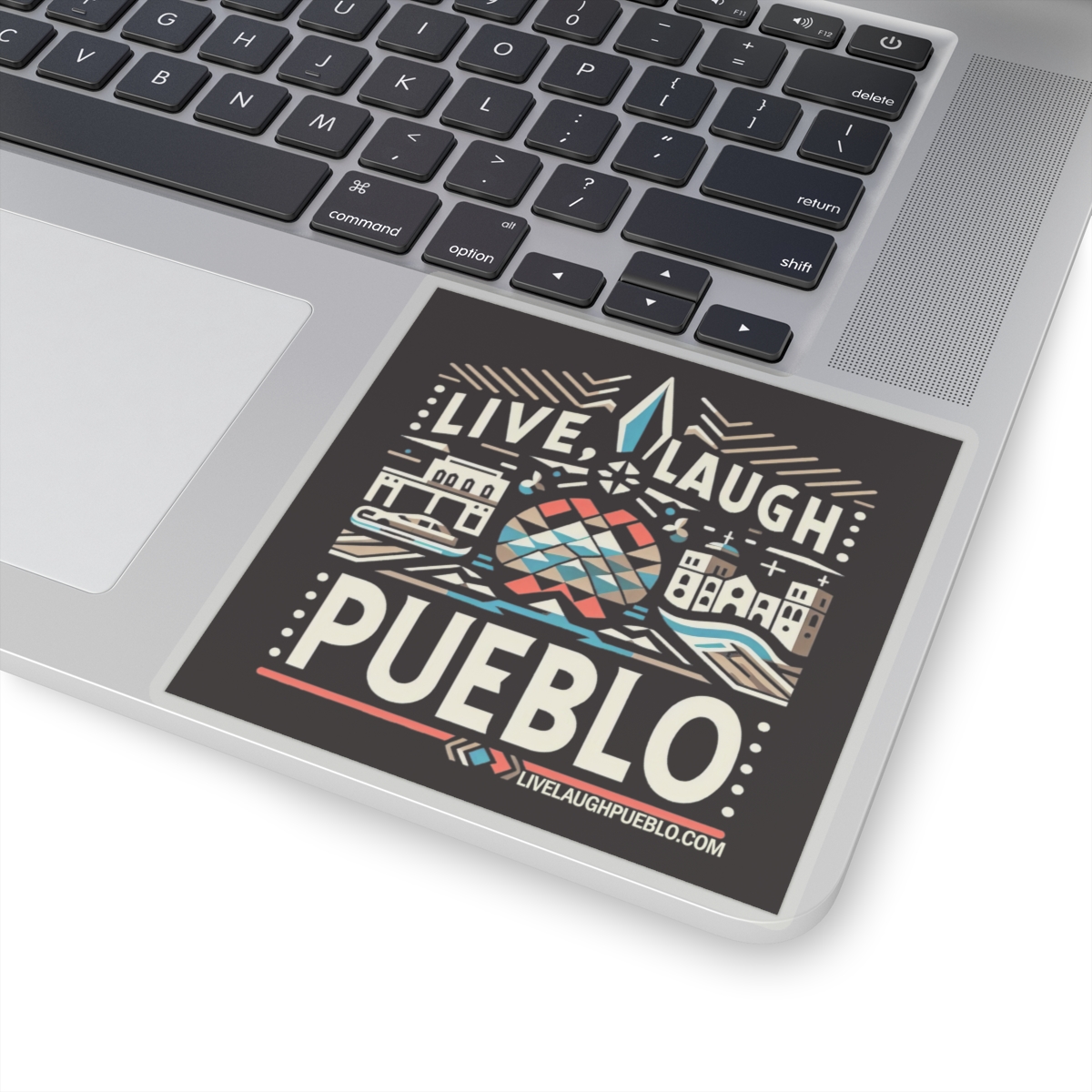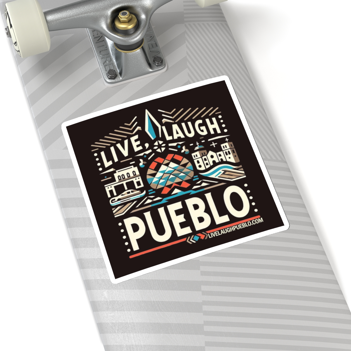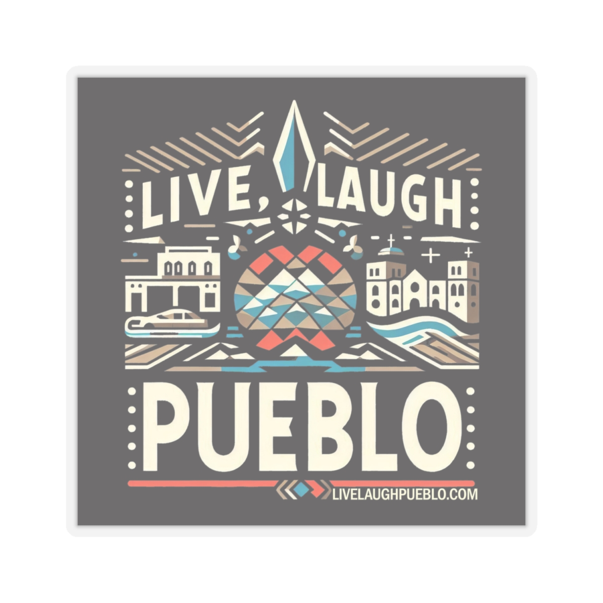 Celebrate the vibrant culture and unique charm of Pueblo, Colorado with our Live, Laugh, Pueblo! Vibrant Pueblo Cityscape Kiss-Cut Sticker. This eye-catching design features a lively cityscape, blending modern and traditional elements that highlight a “Pueblo of Tomorrow.” With bright colors and intricate details, this sticker is perfect for personalizing your laptop, water bottle, notebook, or any other surface. Made from high-quality vinyl, our kiss-cut stickers are durable, weather-resistant, and easy to apply. Show some Pueblo love with this stunning and versatile accessory!