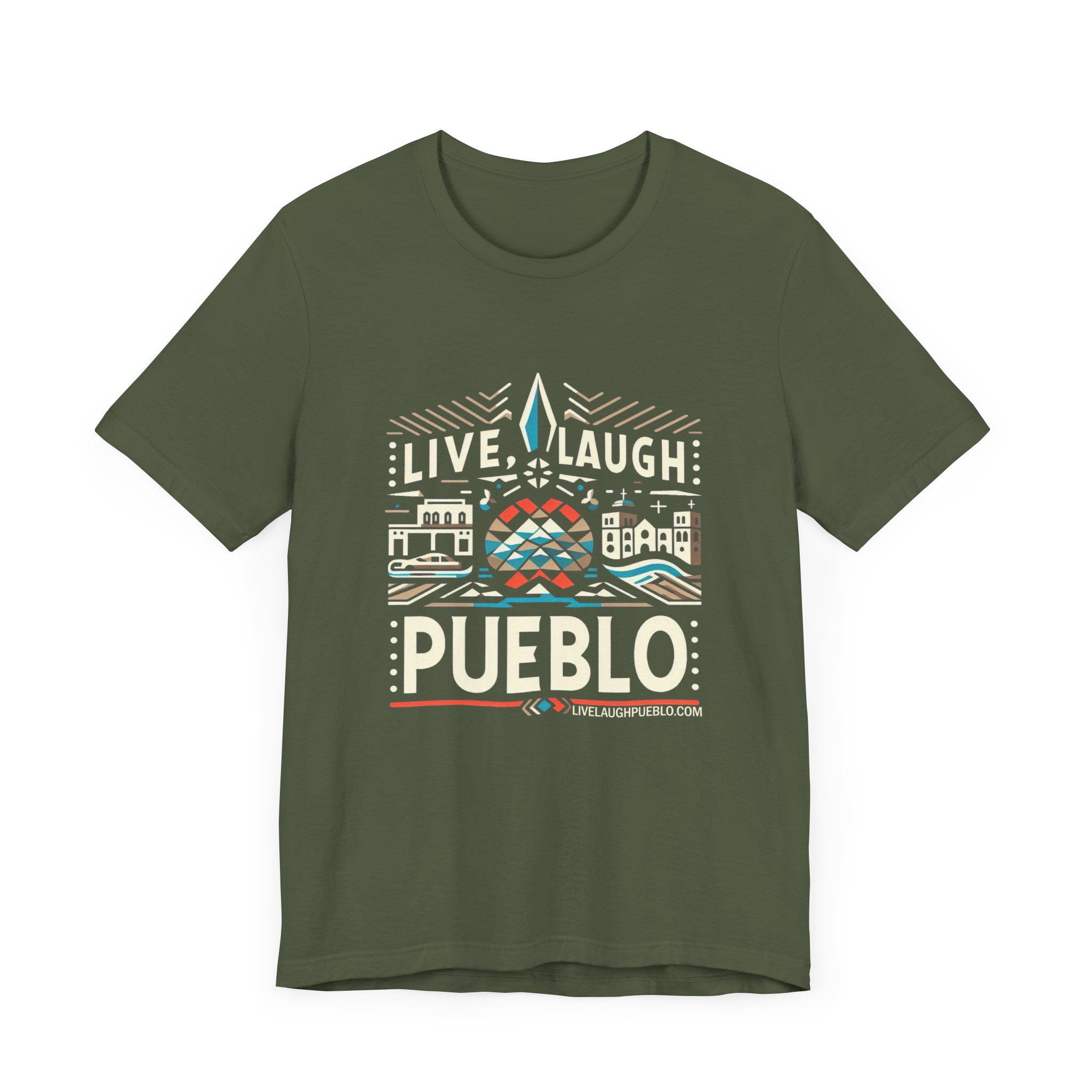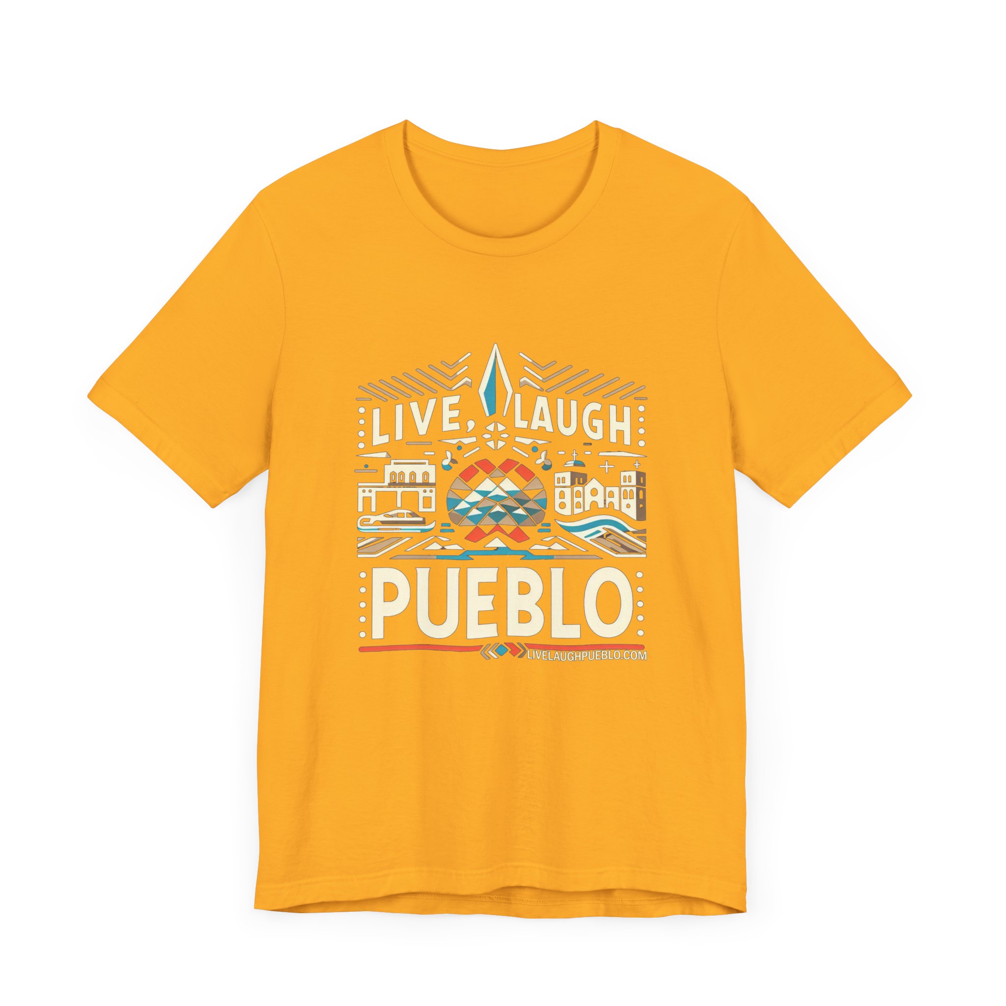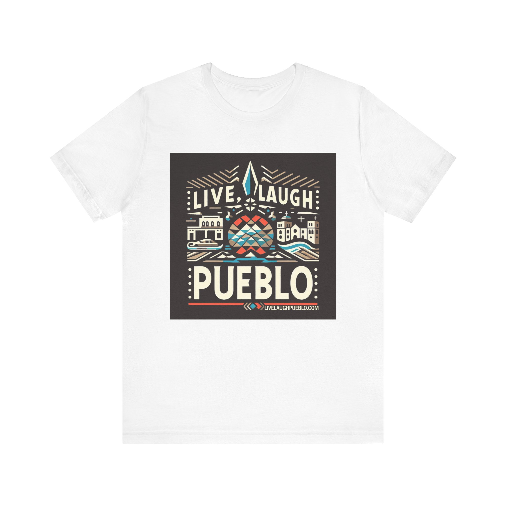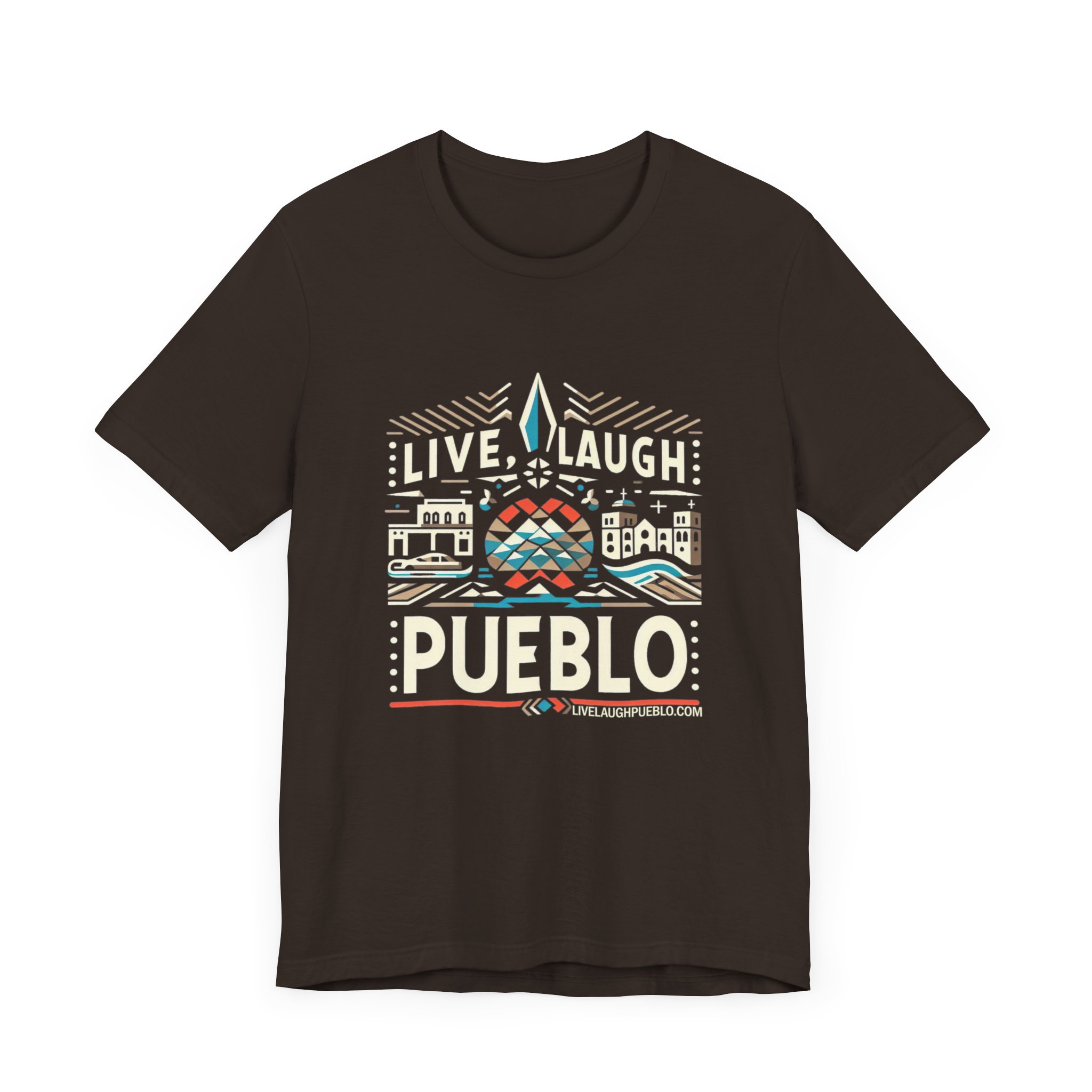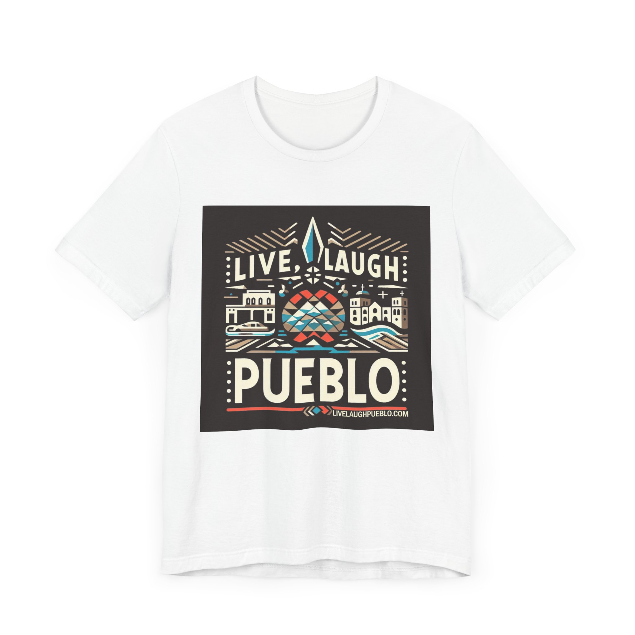 Live, Laugh, Pueblo! Vibrant Pueblo Cityscape Unisex Jersey Short Sleeve Tee