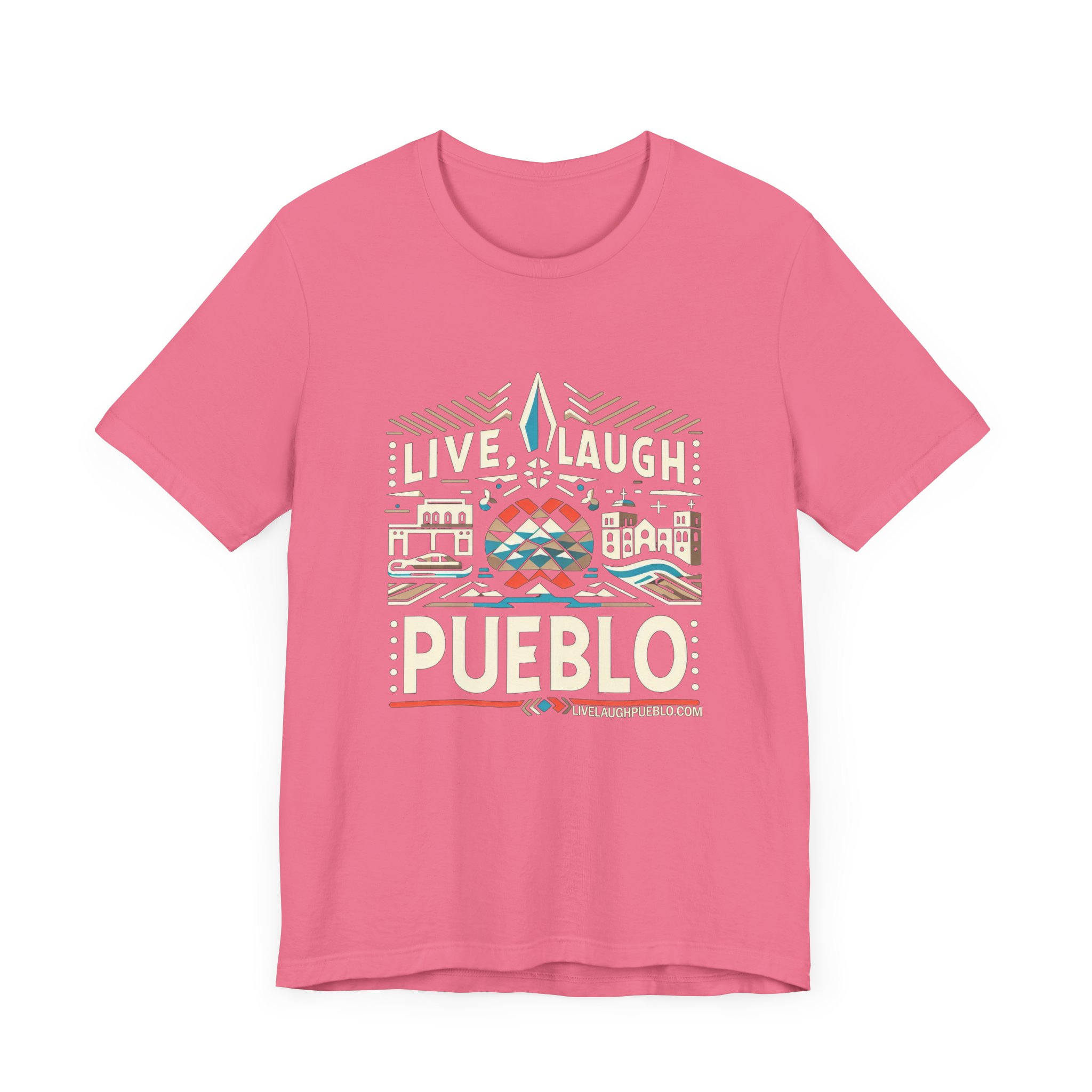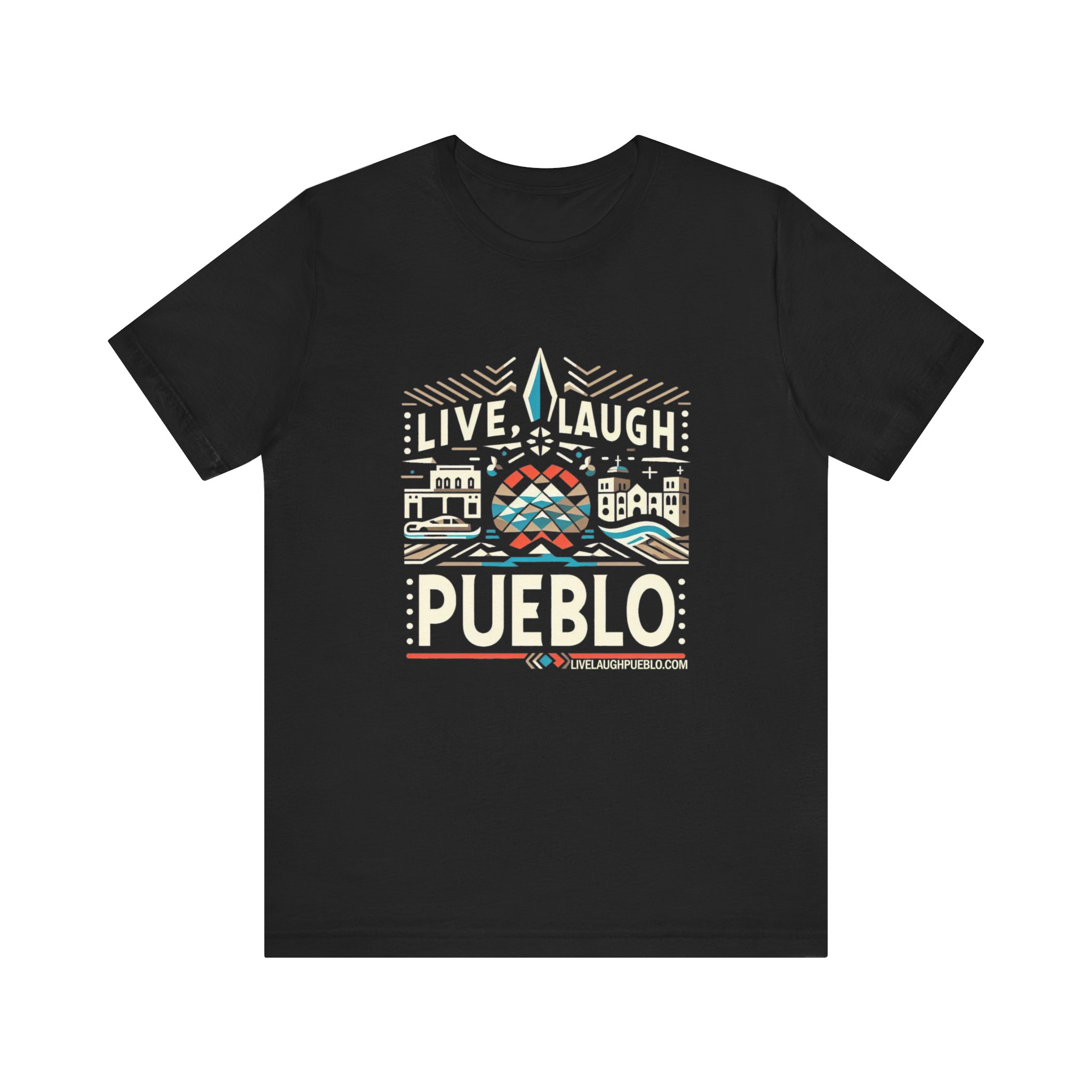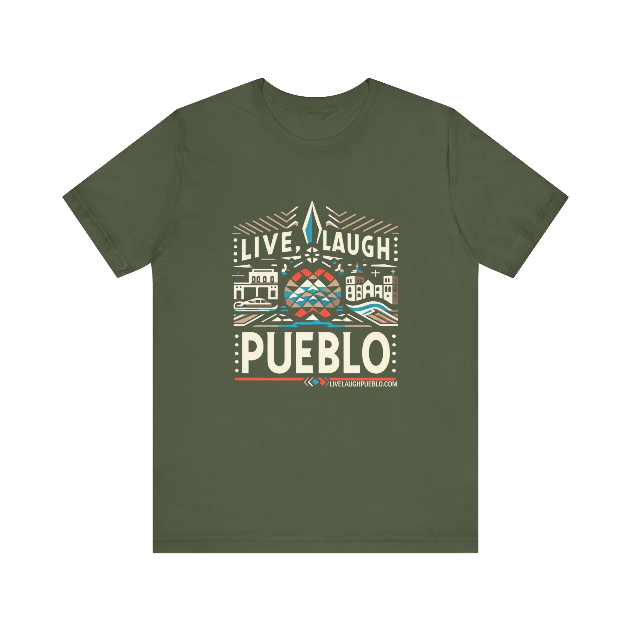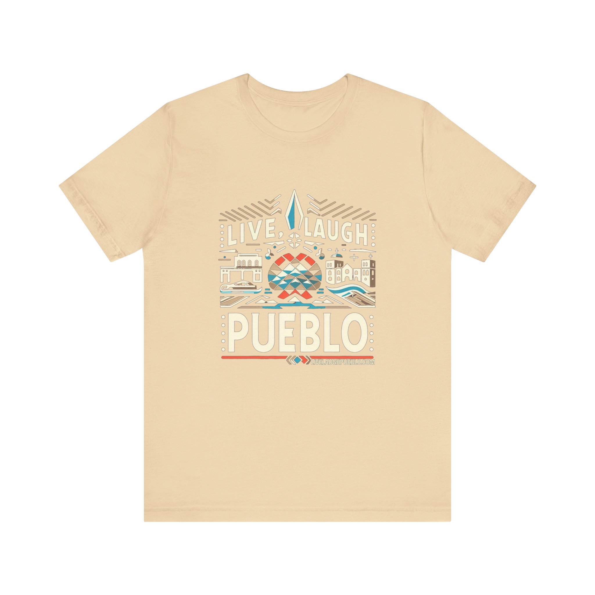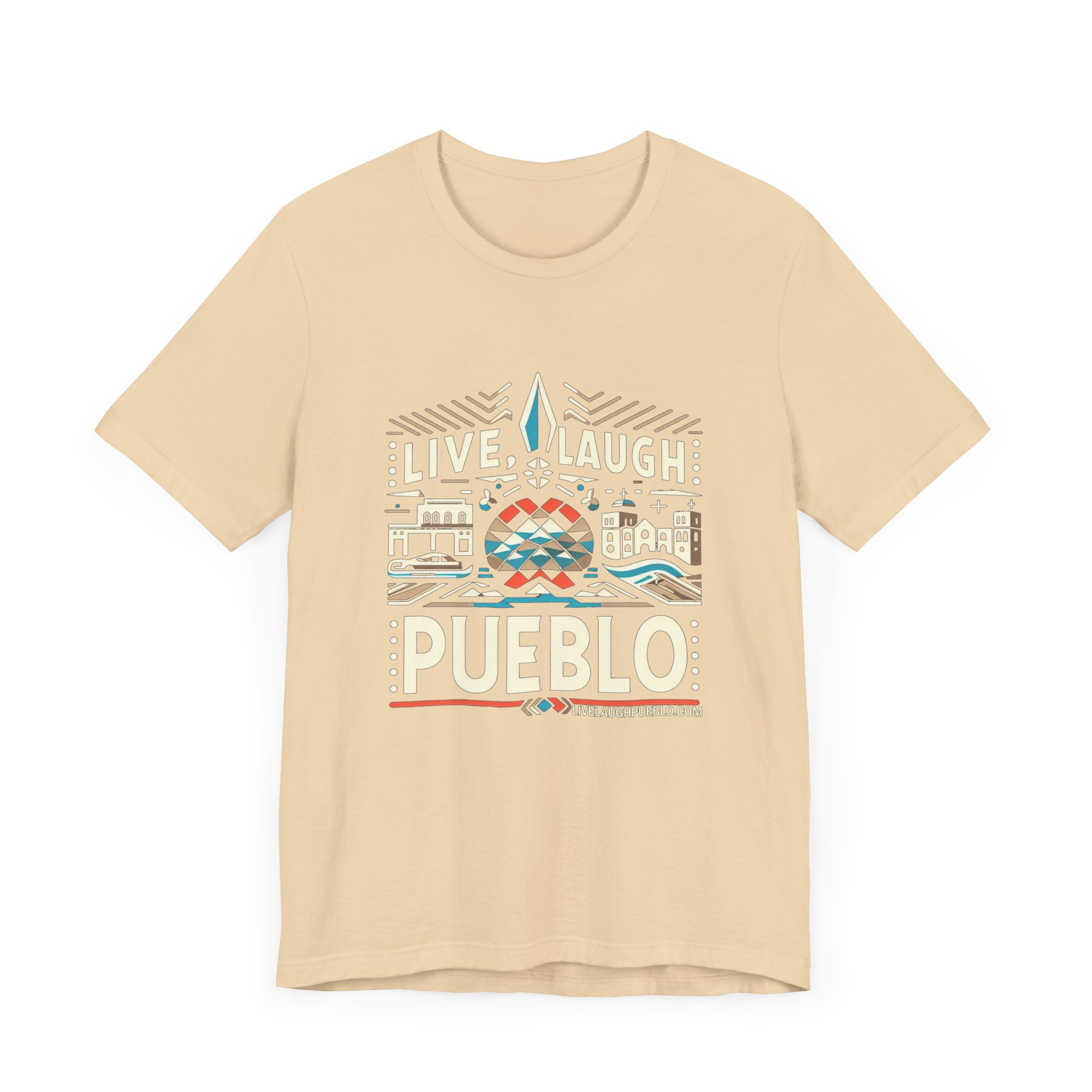 Live, Laugh, Pueblo! Vibrant Pueblo Cityscape Unisex Jersey Short Sleeve Tee
