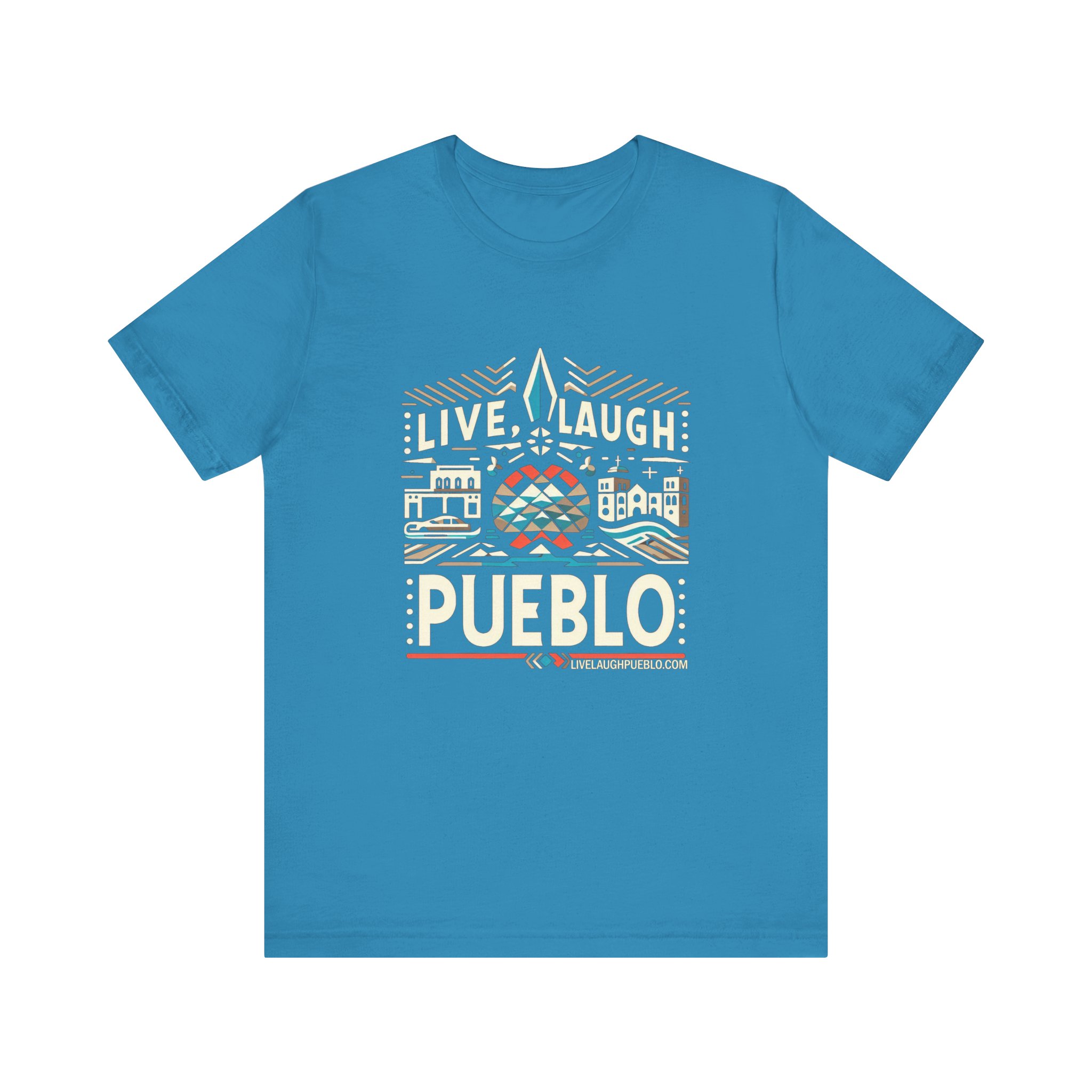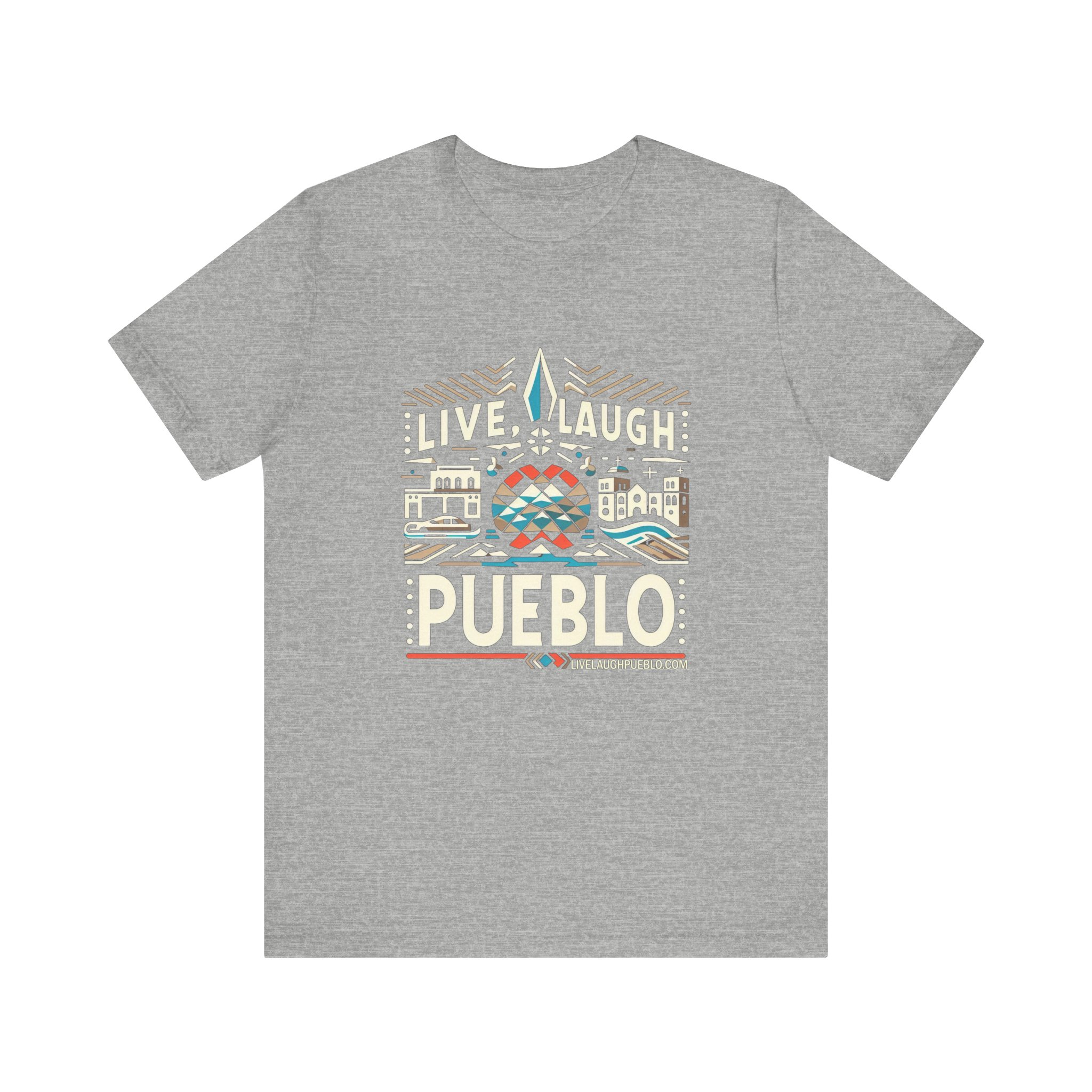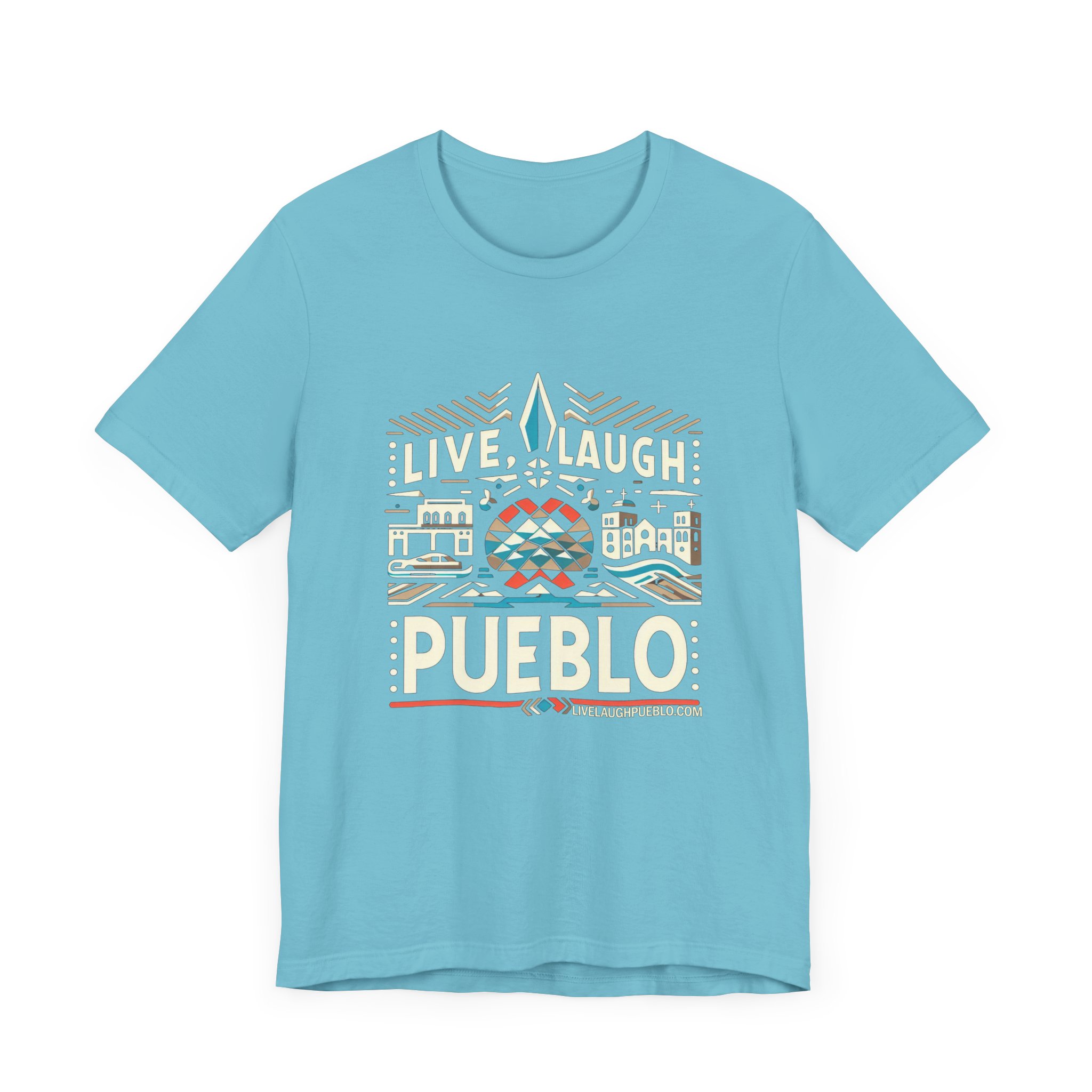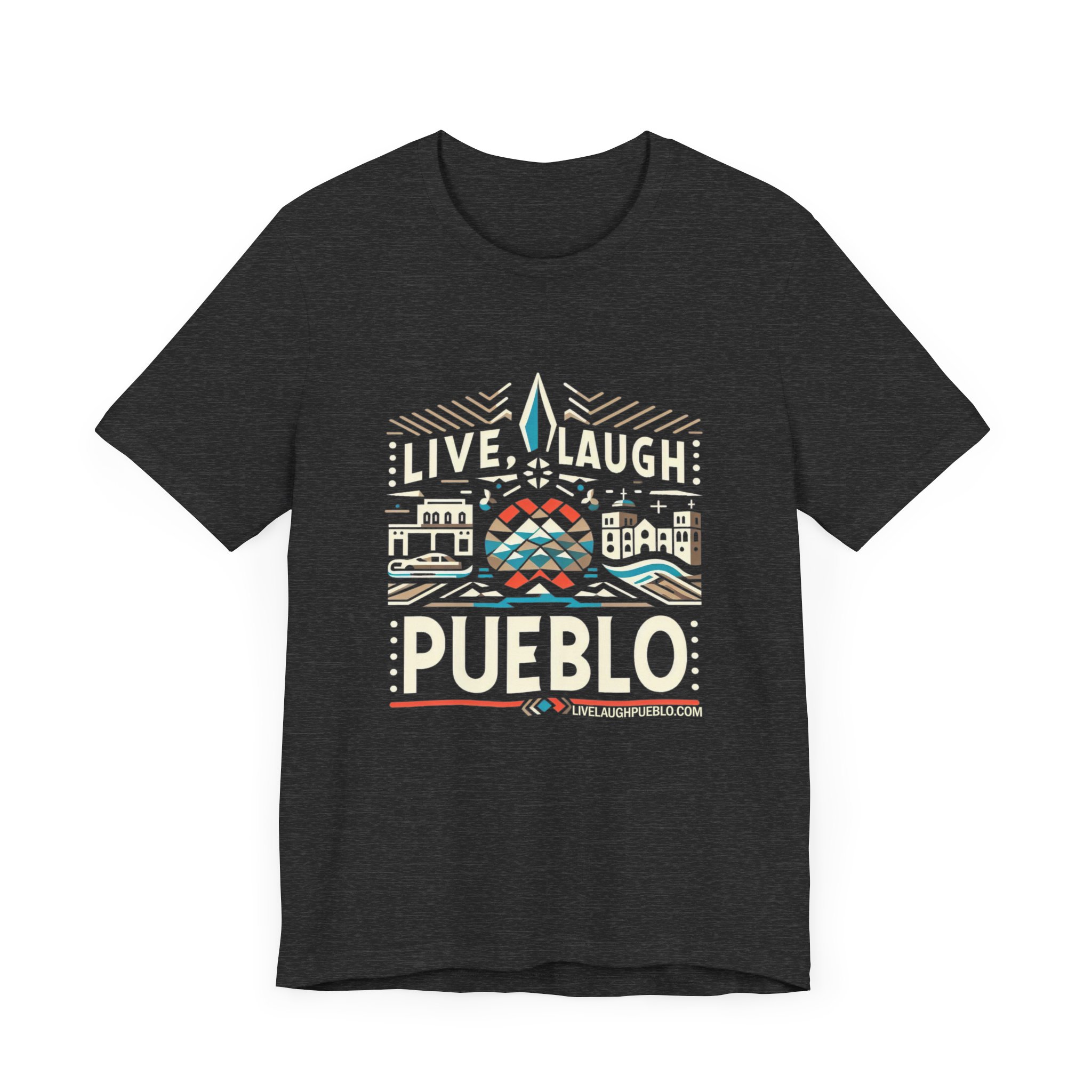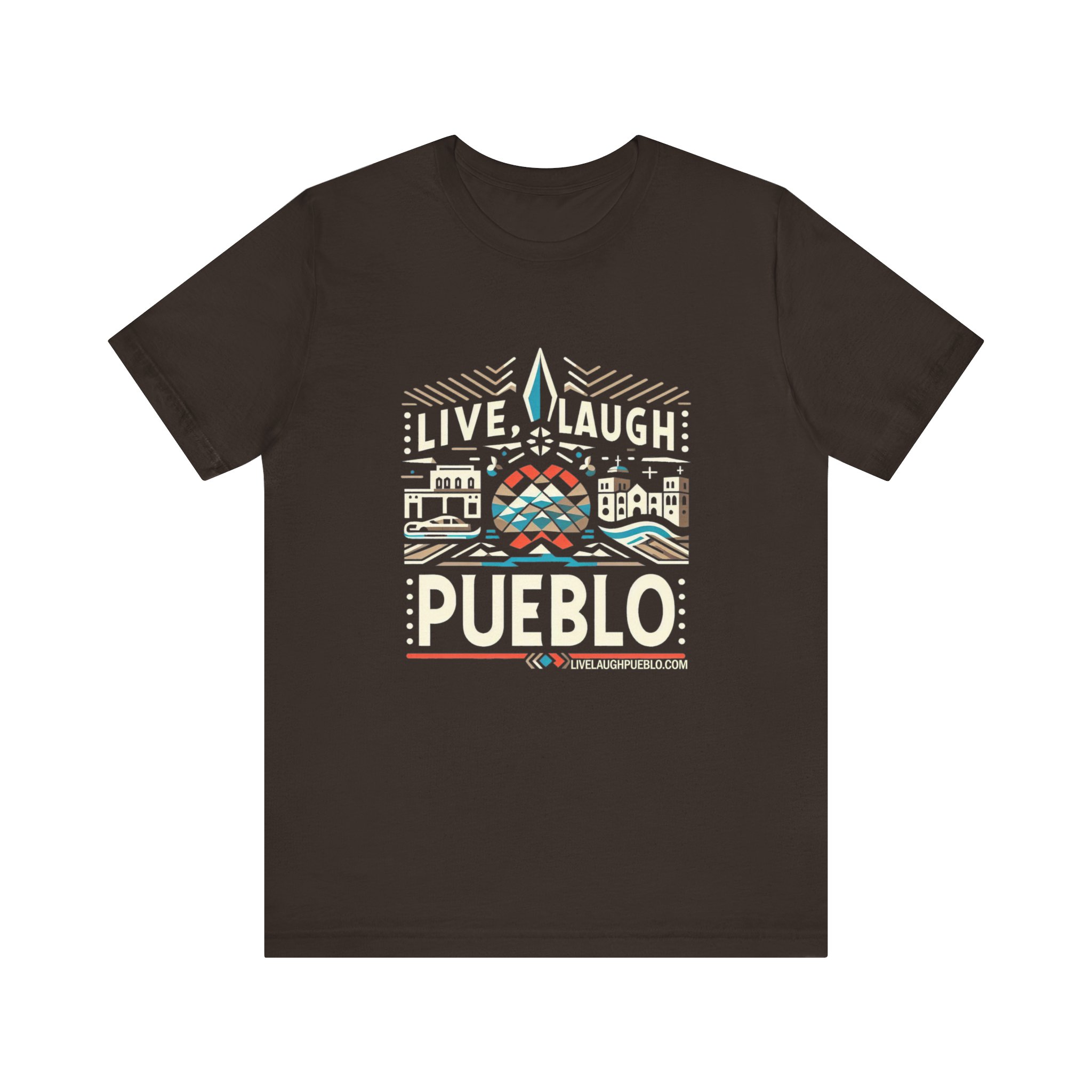 Live, Laugh, Pueblo! Vibrant Pueblo Cityscape Unisex Jersey Short Sleeve Tee