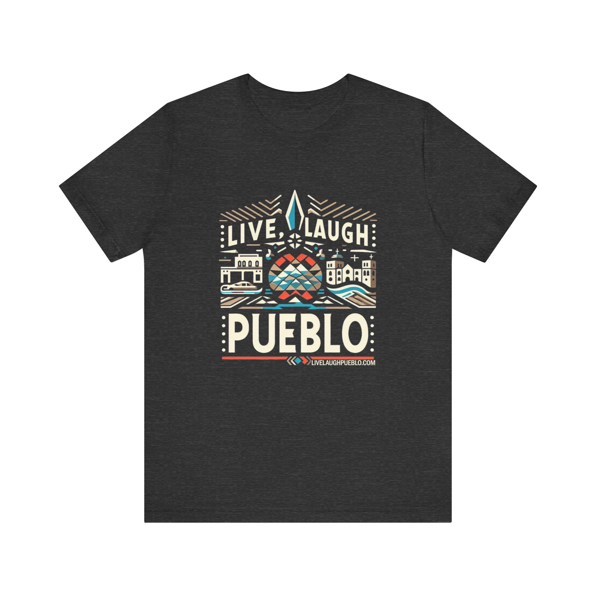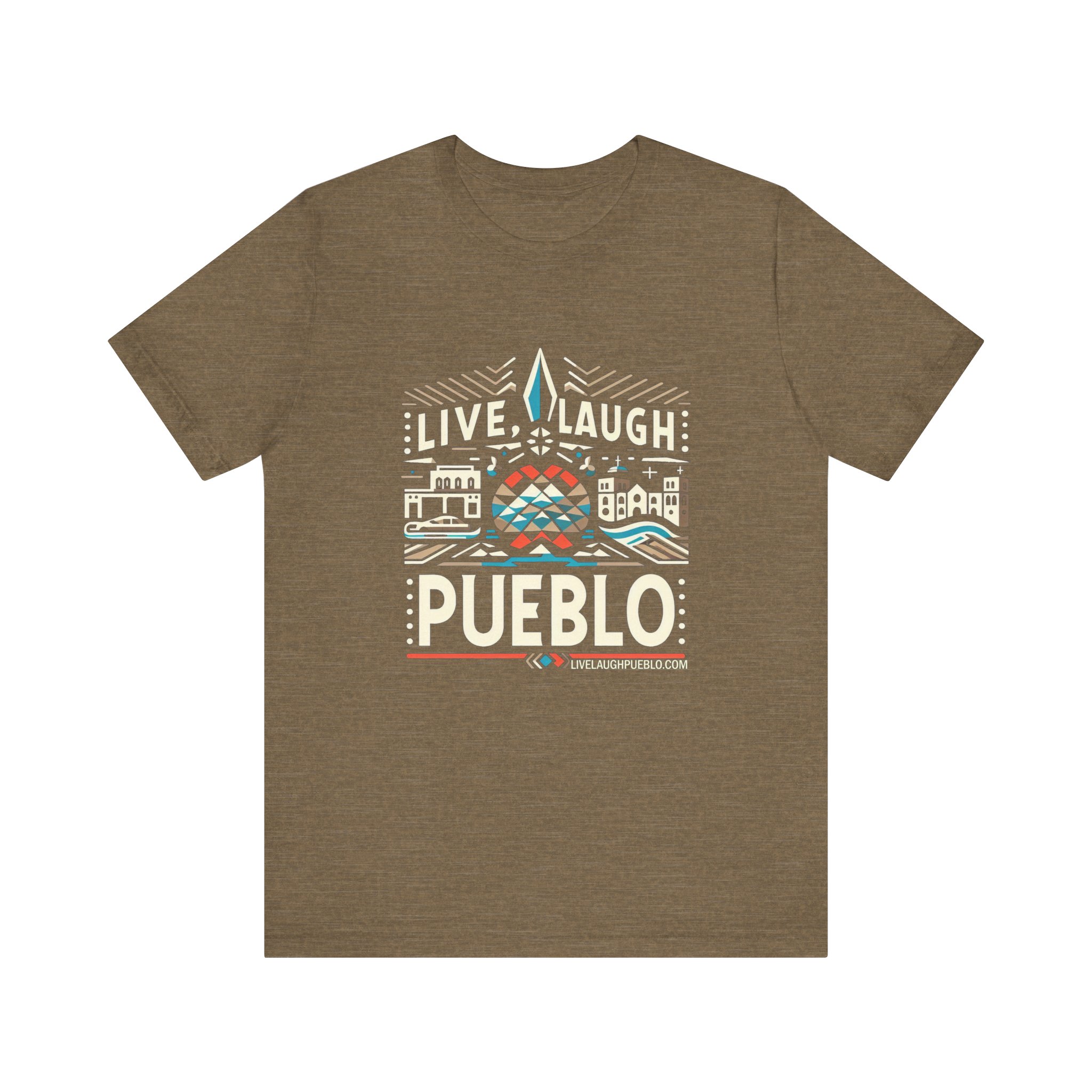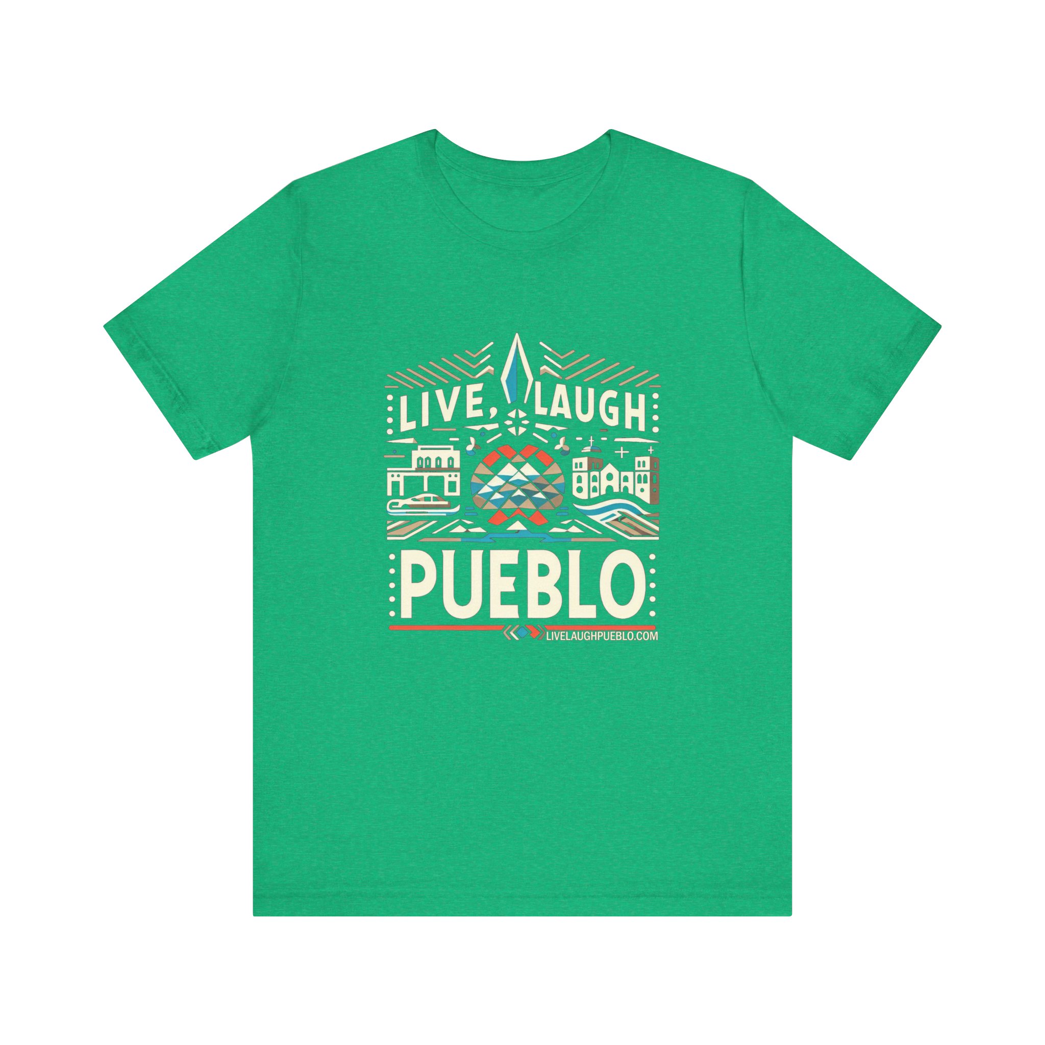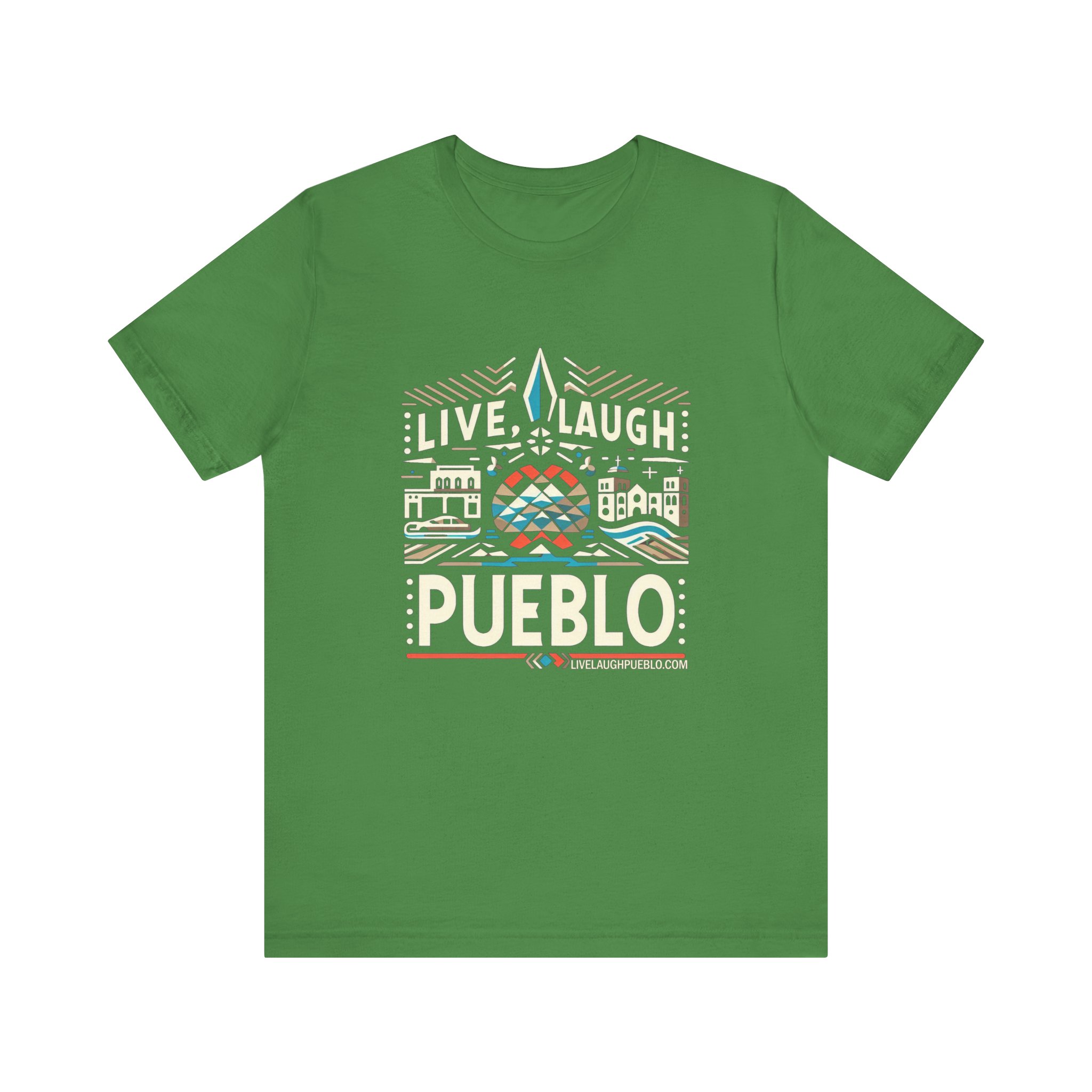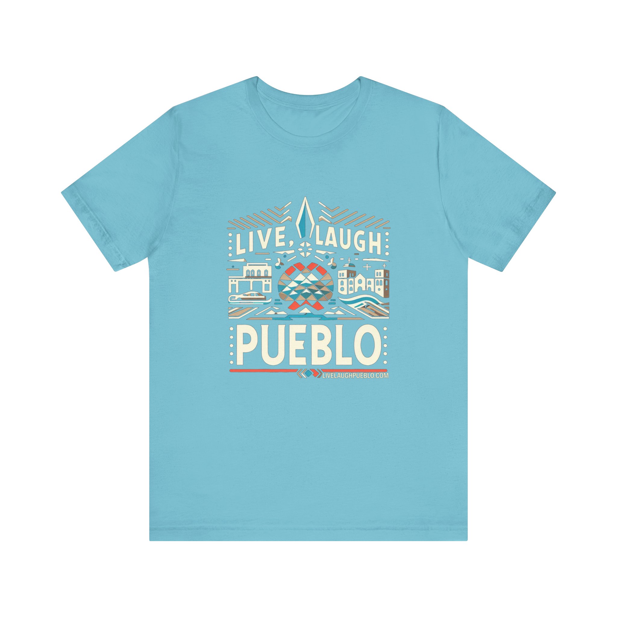 Live, Laugh, Pueblo! Vibrant Pueblo Cityscape Unisex Jersey Short Sleeve Tee